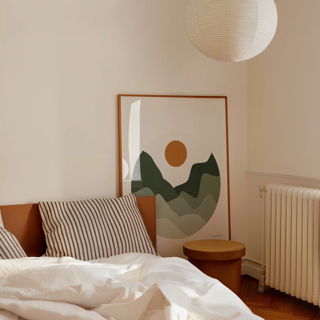 Linnen Look Poster Horizontaal met Zon, Bergen en WaterLinnen Look Poster Horizontaal met Zon, Bergen en Water- Reguliere prijs