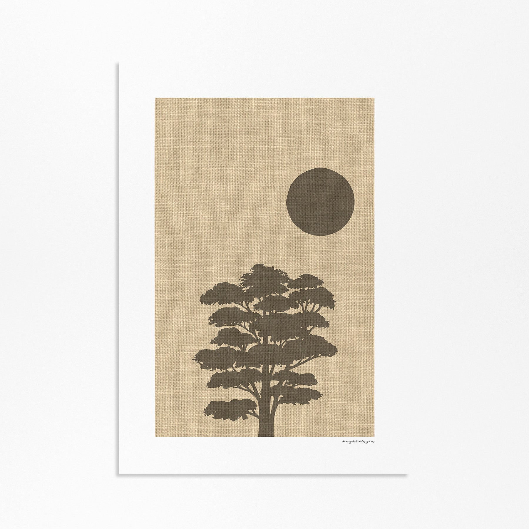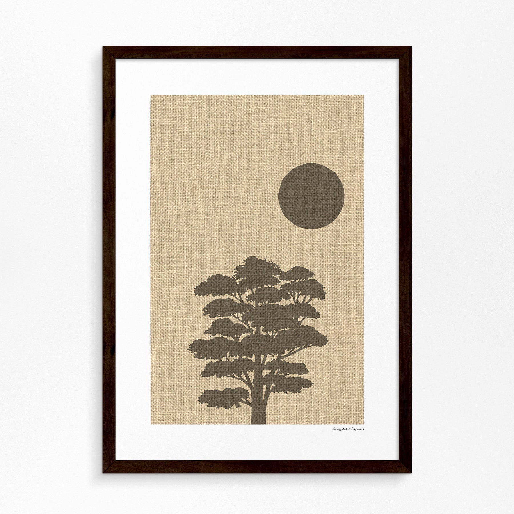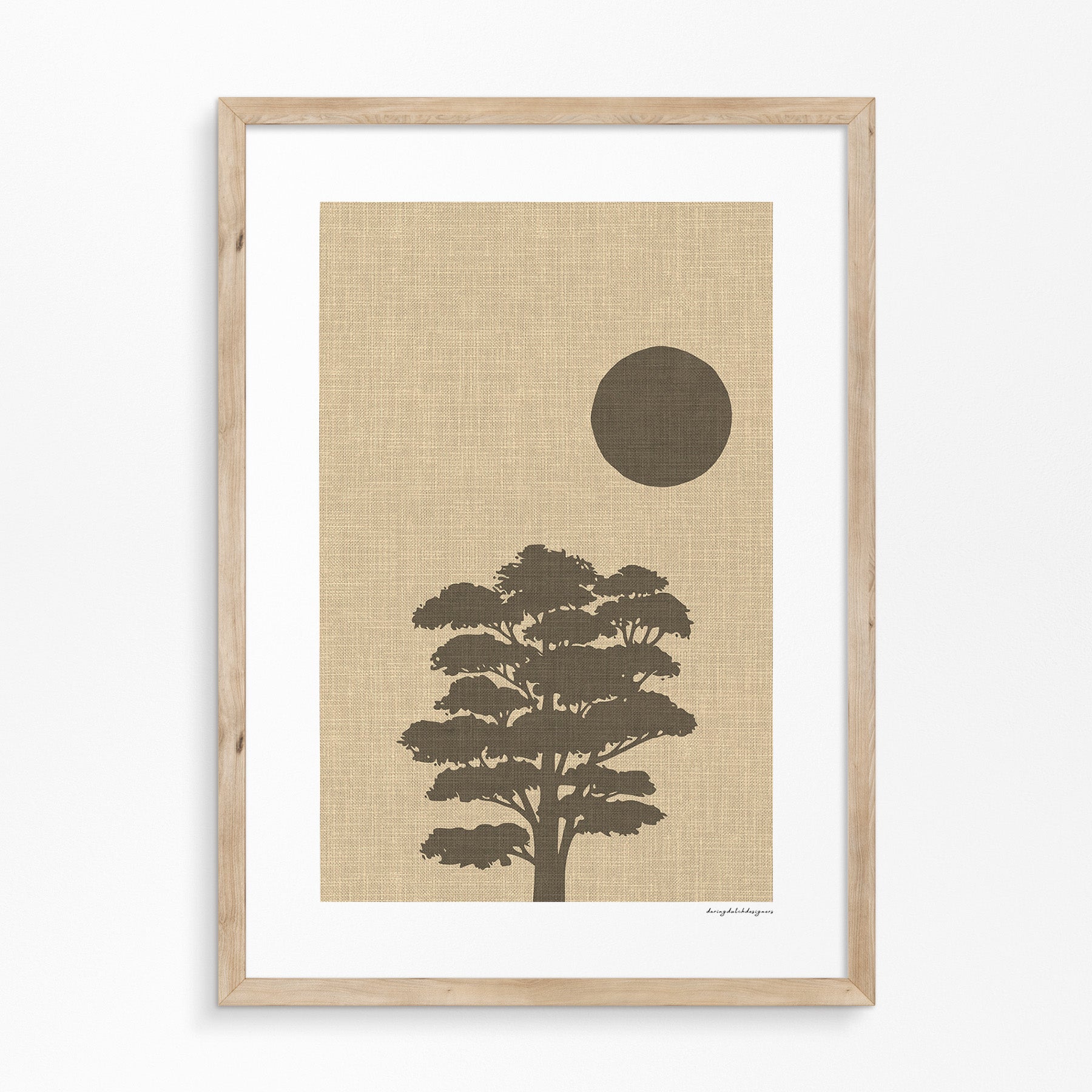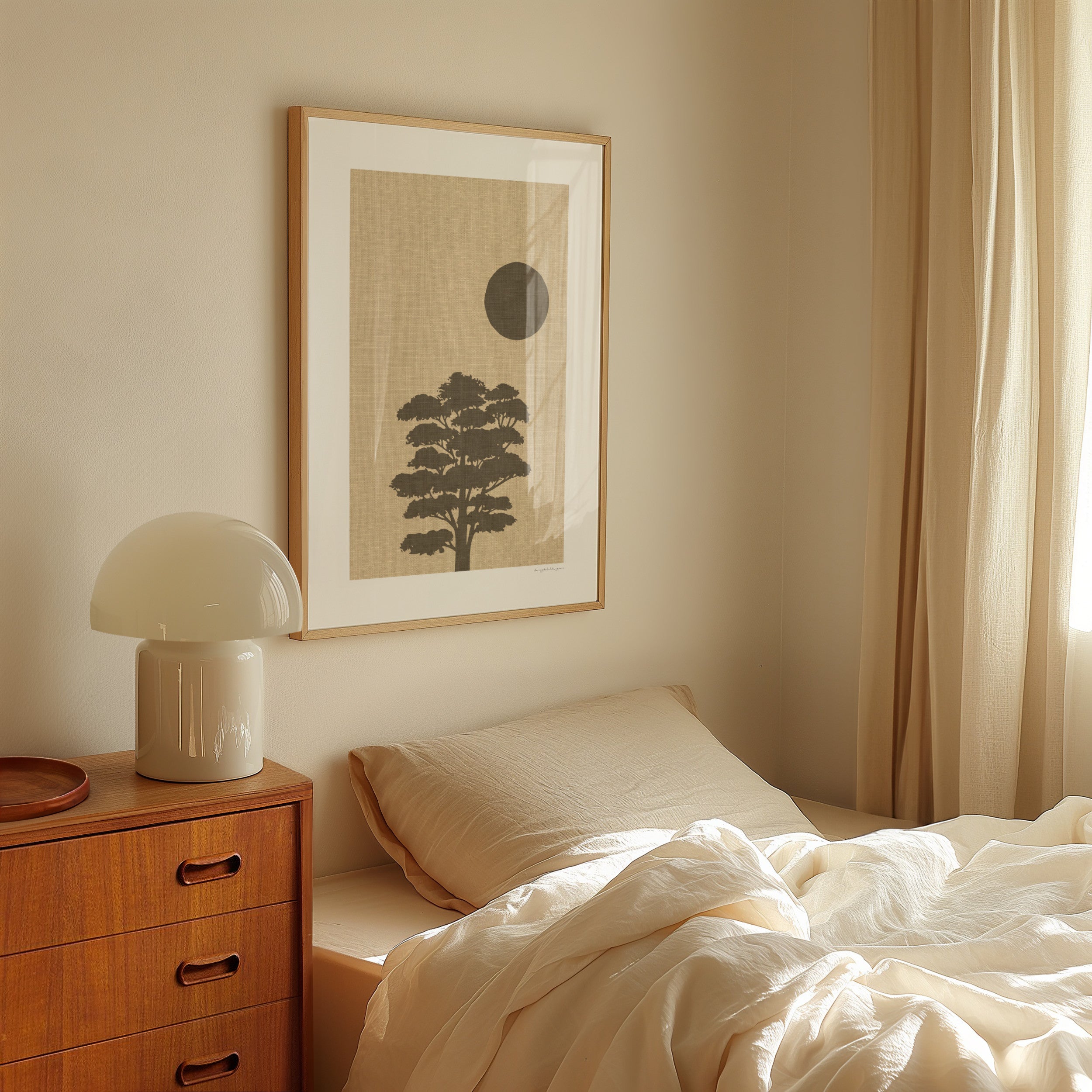 Linnen Look Poster met Boom en Zon – Japandi Muurdecoratie