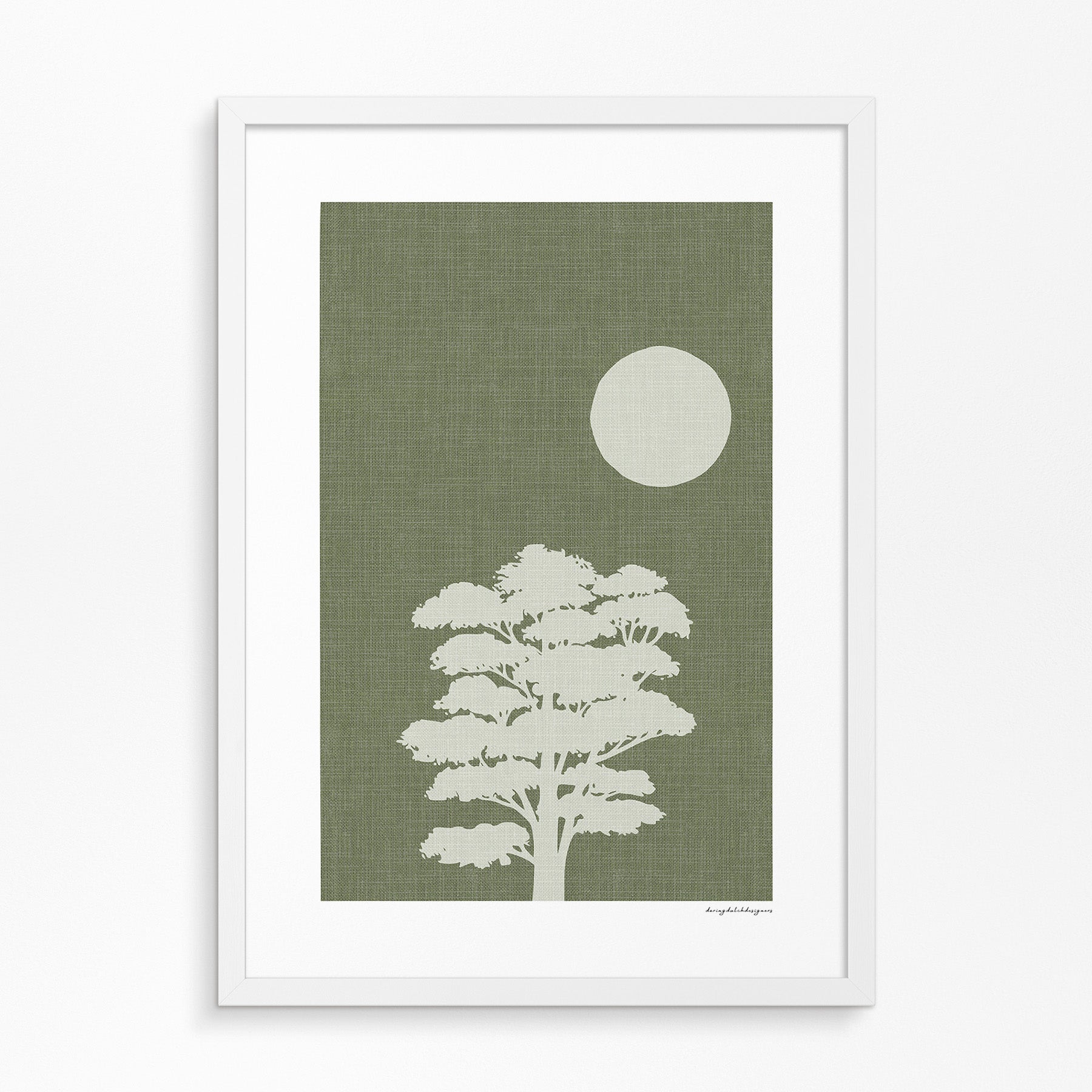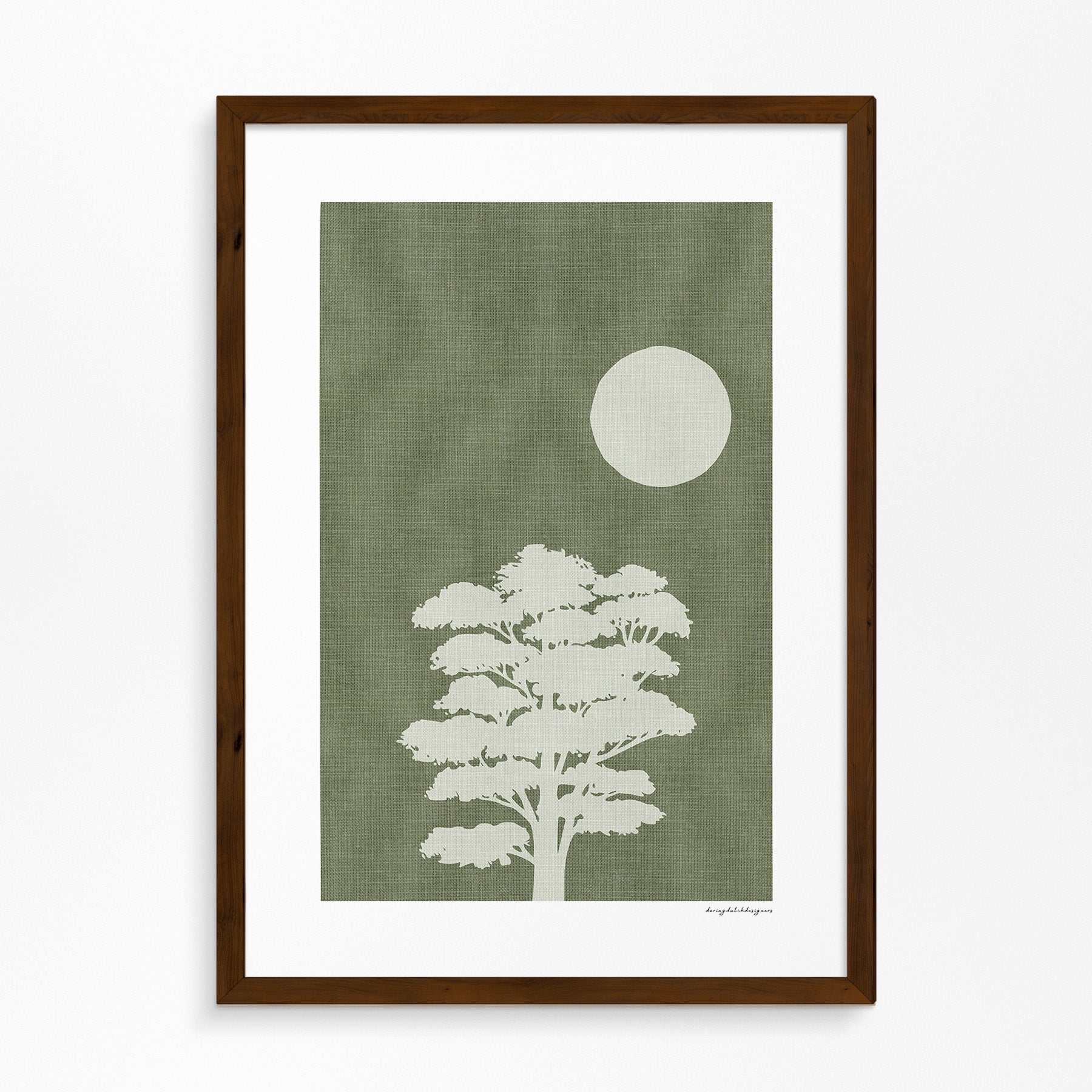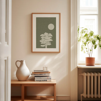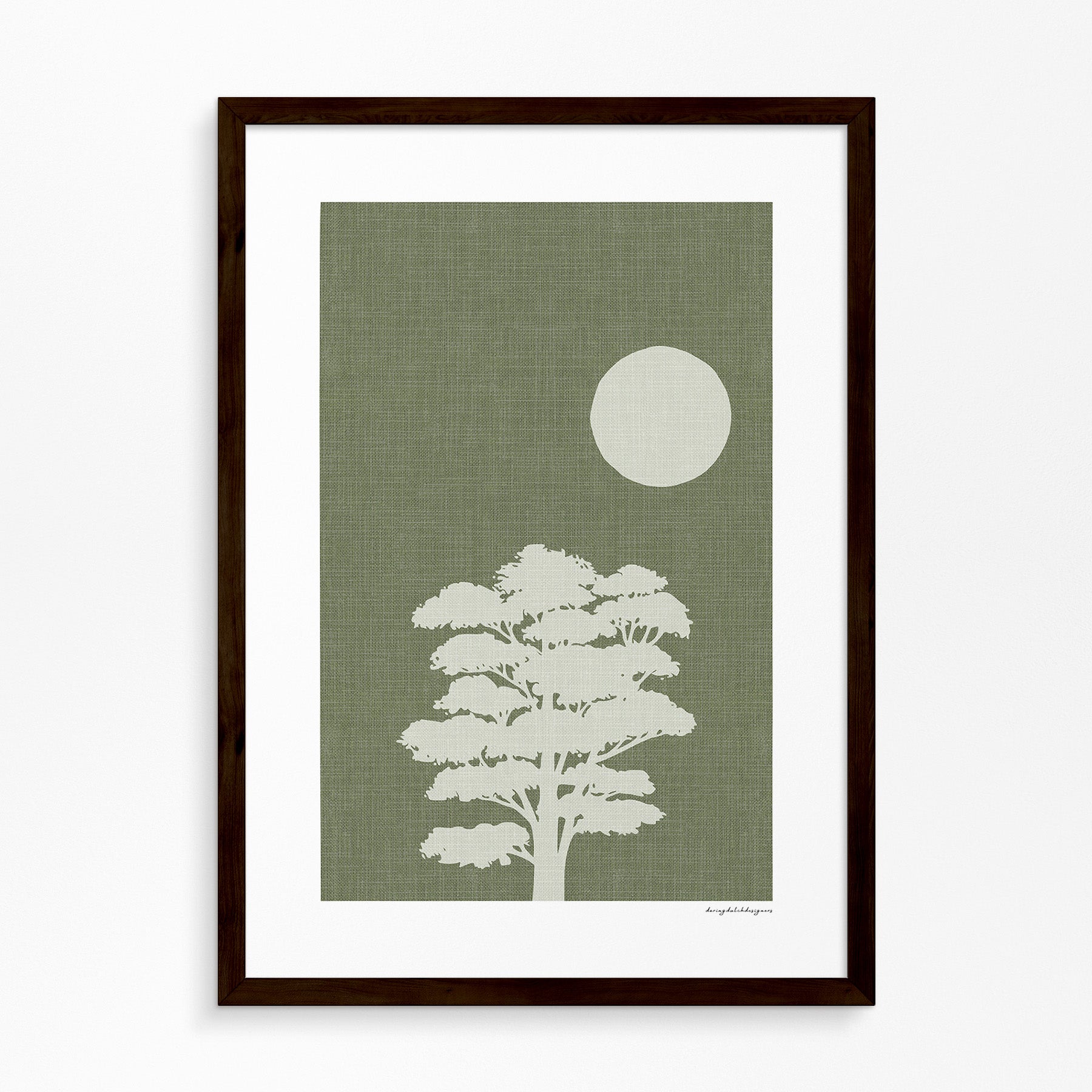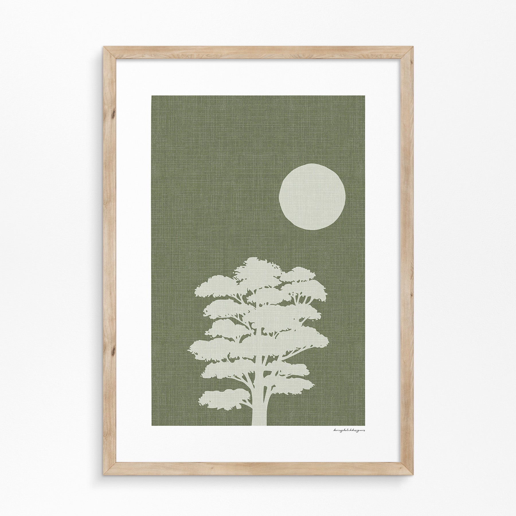 Linnen Look Poster met Boom en Zon – Japandi Muurdecoratie