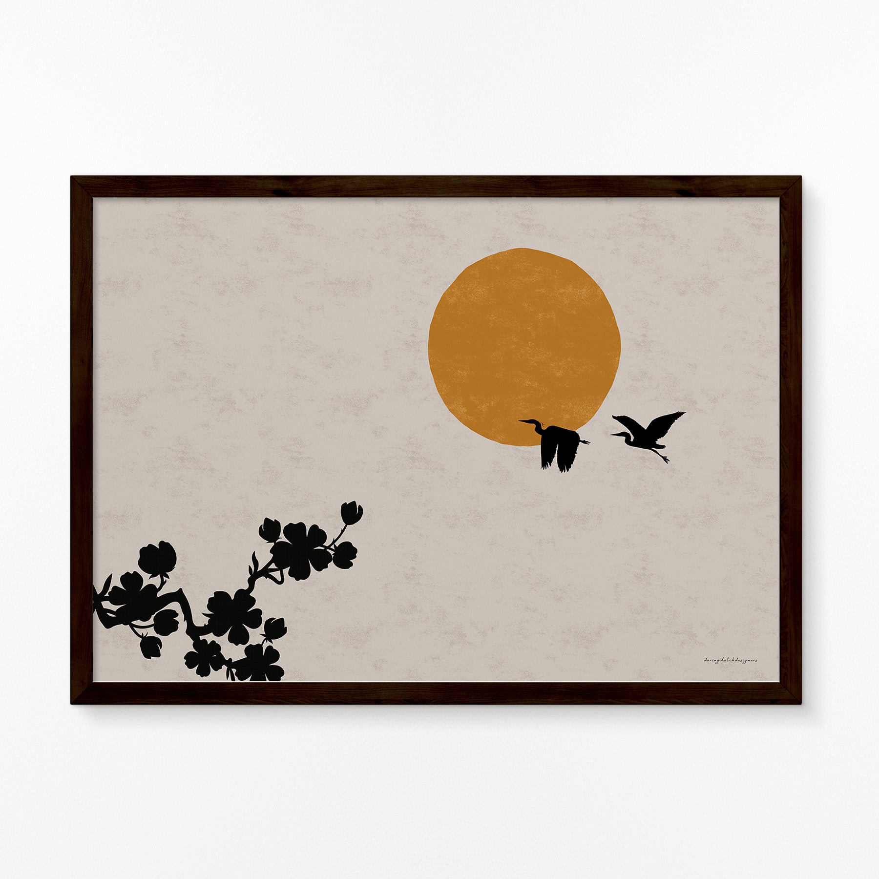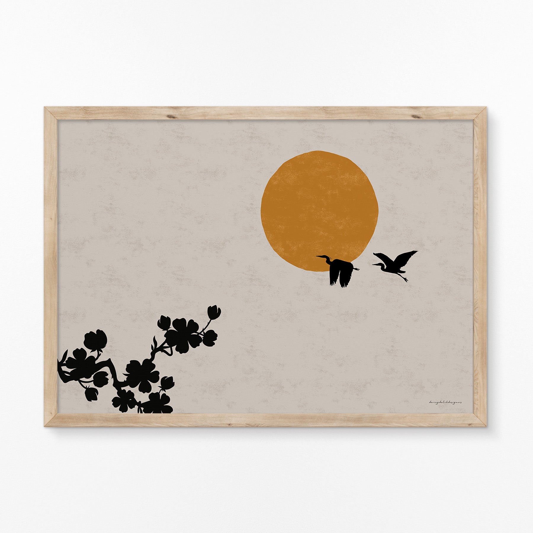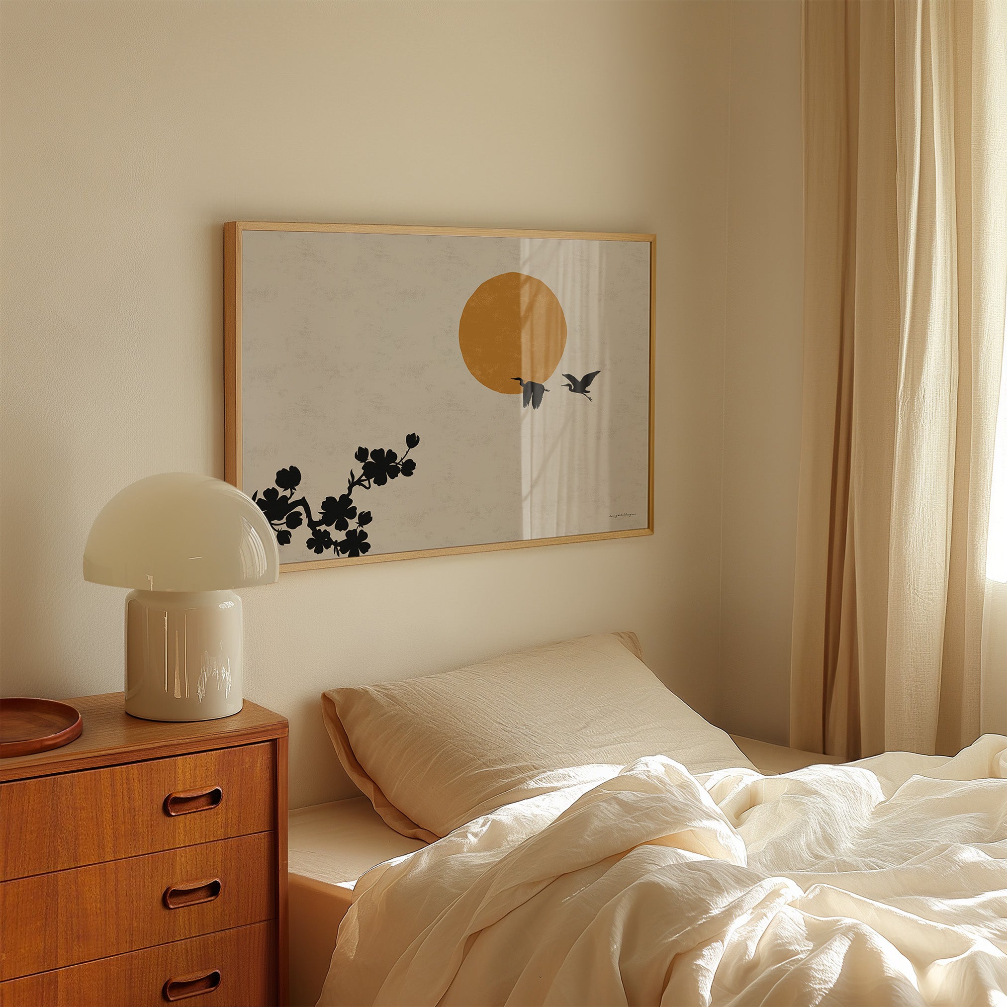Is de lente jouw favoriete seizoen? De frisse lucht, het gezang van vogels, en de betovering van bloeiende bomen! Sluit je ogen en stel je voor dat je twee statige reigers ziet zweven onder een stralende zon, omringd door bloesemtakken die de komst van het seizoen aankondigen. Deze mooie poster brengt niet alleen de natuur naar binnen, maar voegt ook een warme, gezellige sfeer toe aan jouw Japandi interieur.
