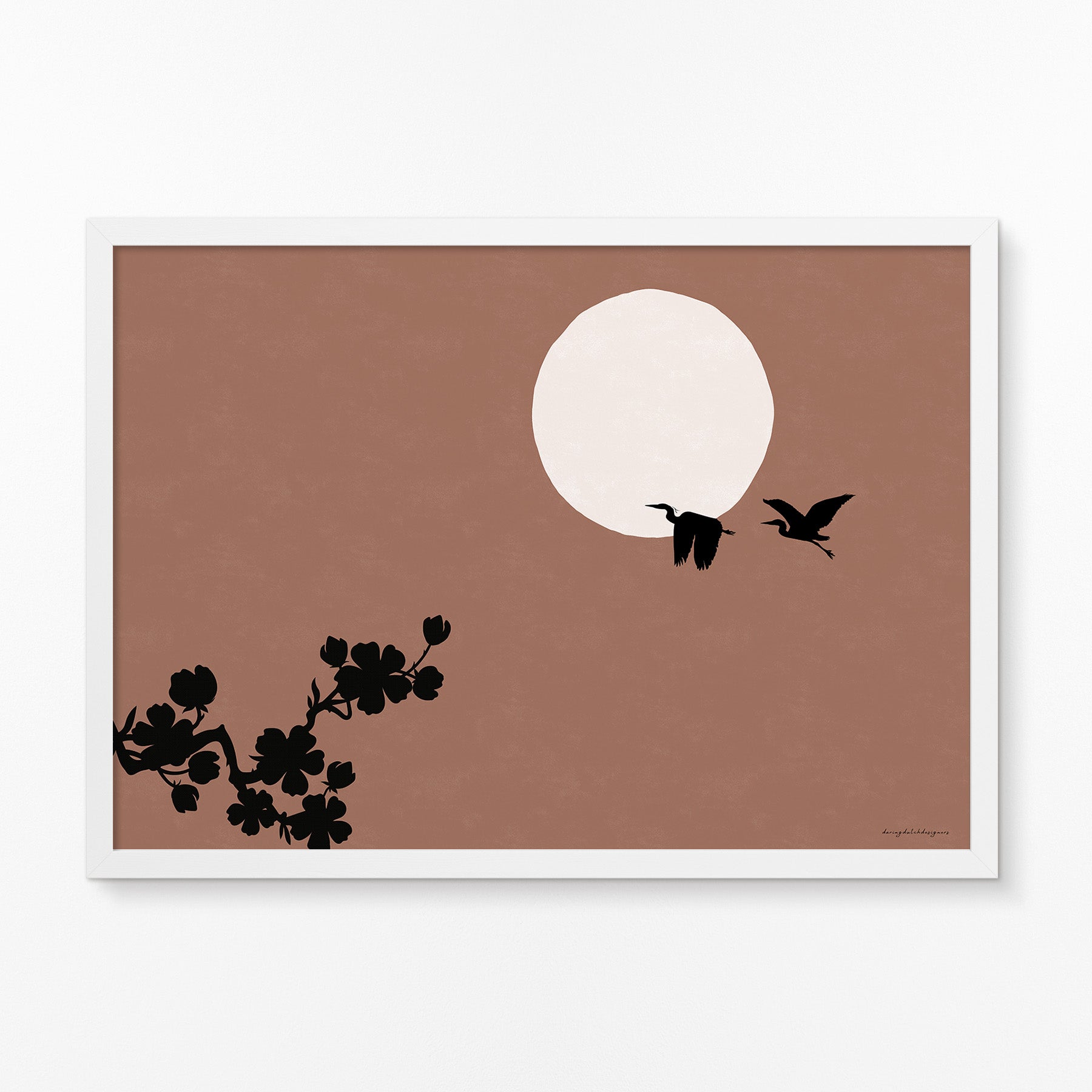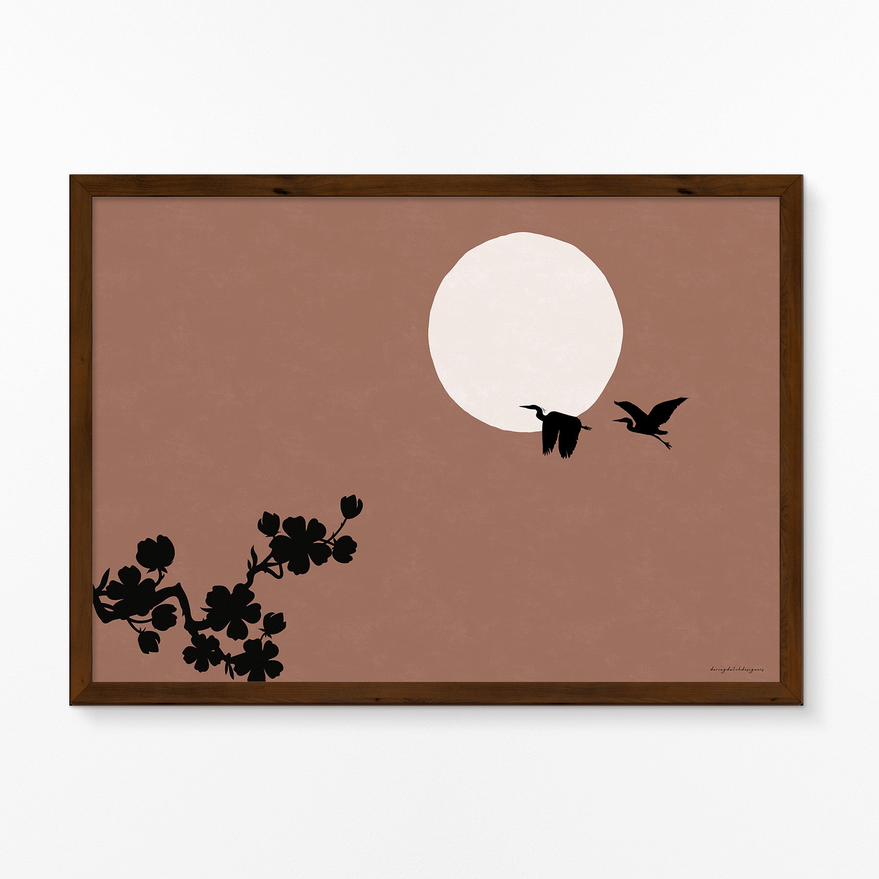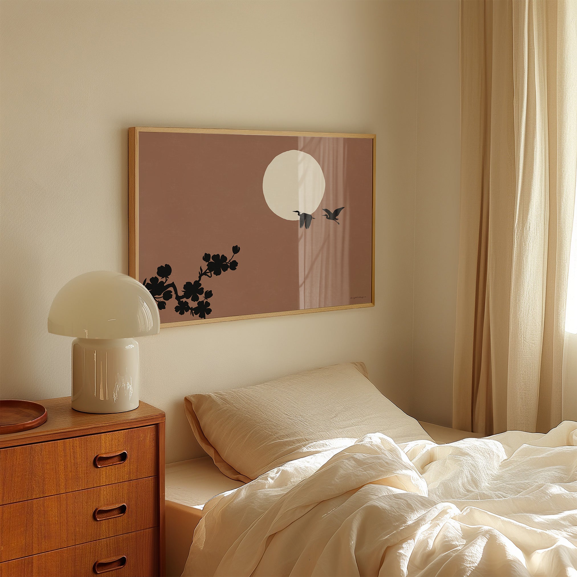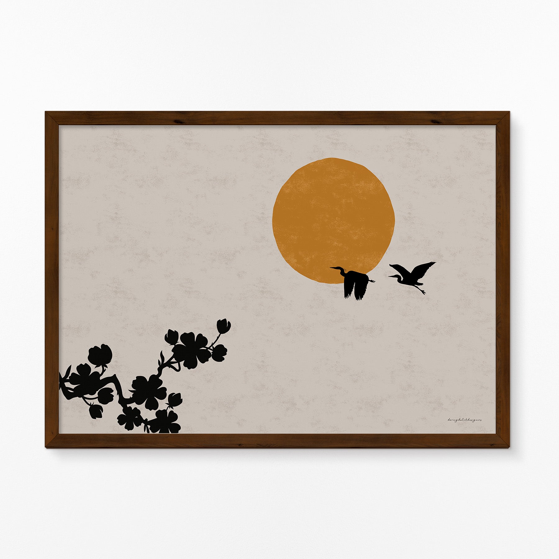 Is de lente jouw favoriete seizoen? De frisse lucht, het gezang van vogels, en de betovering van bloeiende bomen! Sluit je ogen en stel je voor dat je twee statige reigers ziet zweven onder een stralende zon, omringd door bloesemtakken die de komst van het seizoen aankondigen. Deze mooie poster brengt niet alleen de natuur naar binnen, maar voegt ook een warme, gezellige sfeer toe aan jouw Japandi interieur.