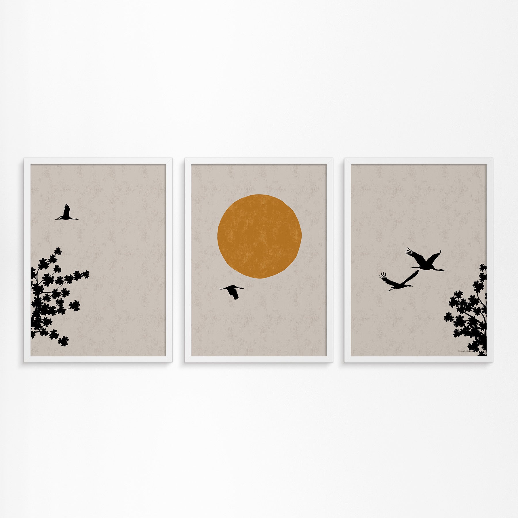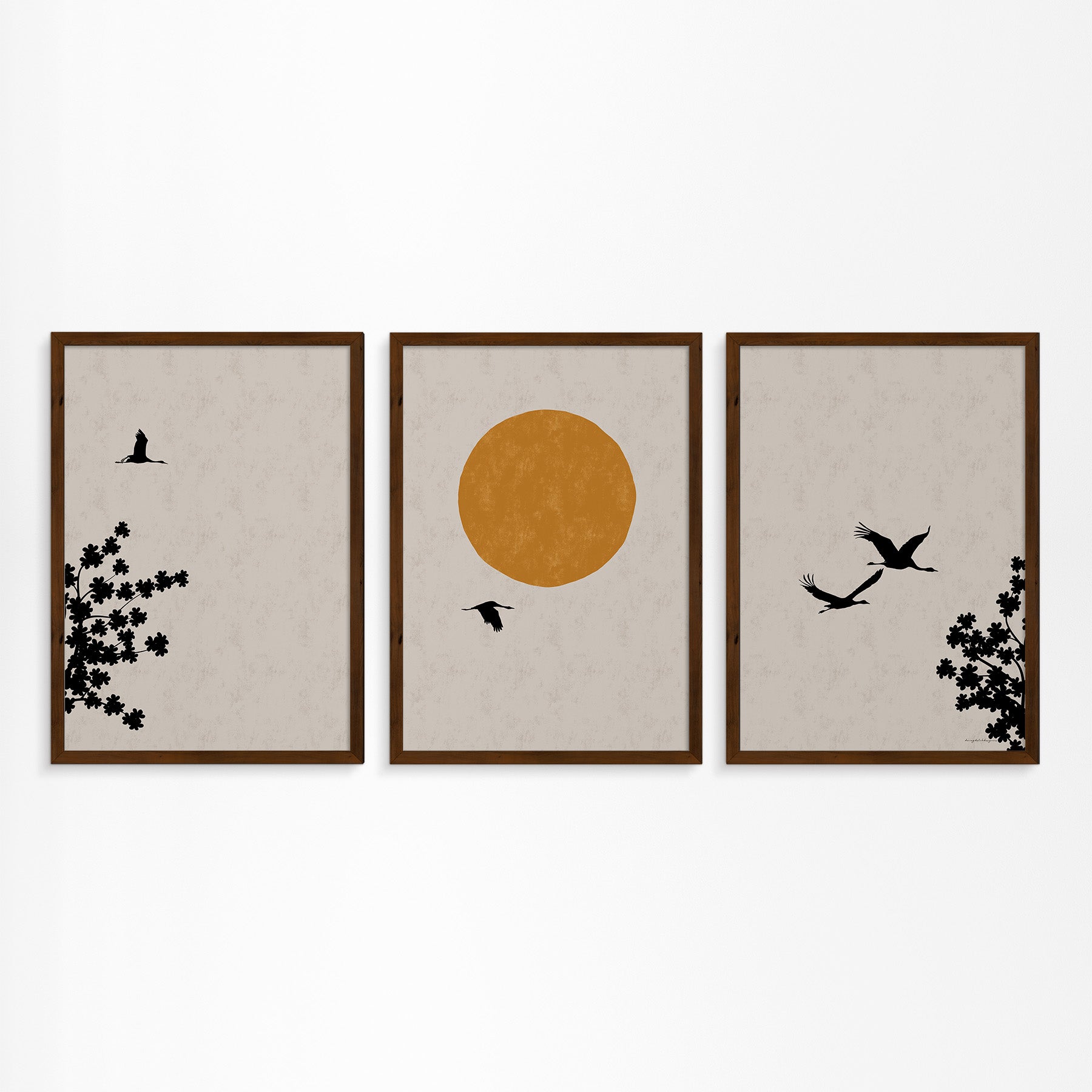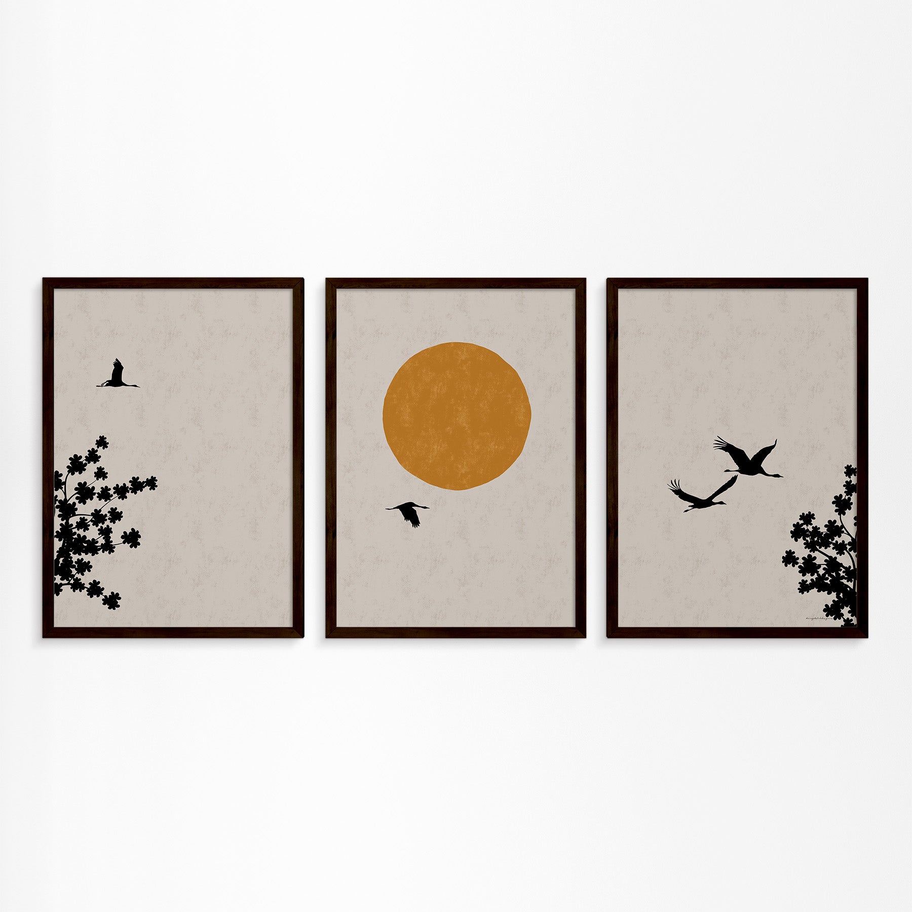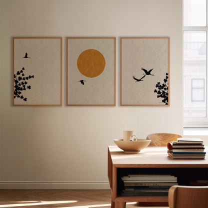 Zou je willen dat je je kon omringen met bloeiende bloesembomen en sierlijke kraanvogels, net als in een Japanse lente? En je de warmte van de zon voelt terwijl je deze serene scène bewondert? Deze prachtige drieluik poster brengt die rustgevende en warme sfeer naar jouw woonkamer of slaapkamer.