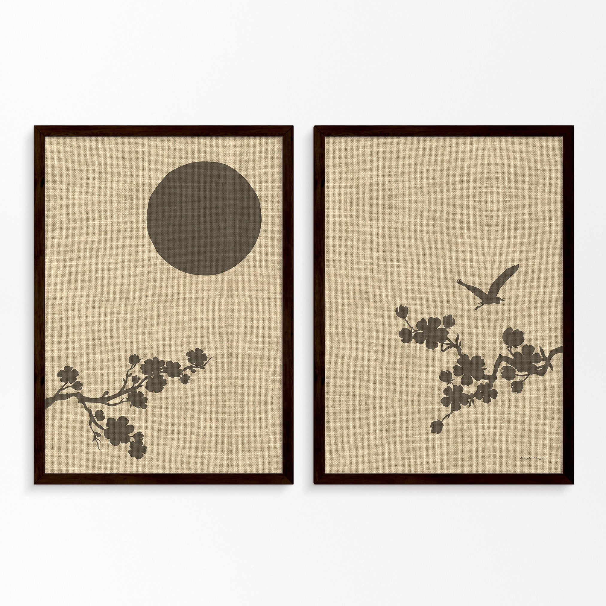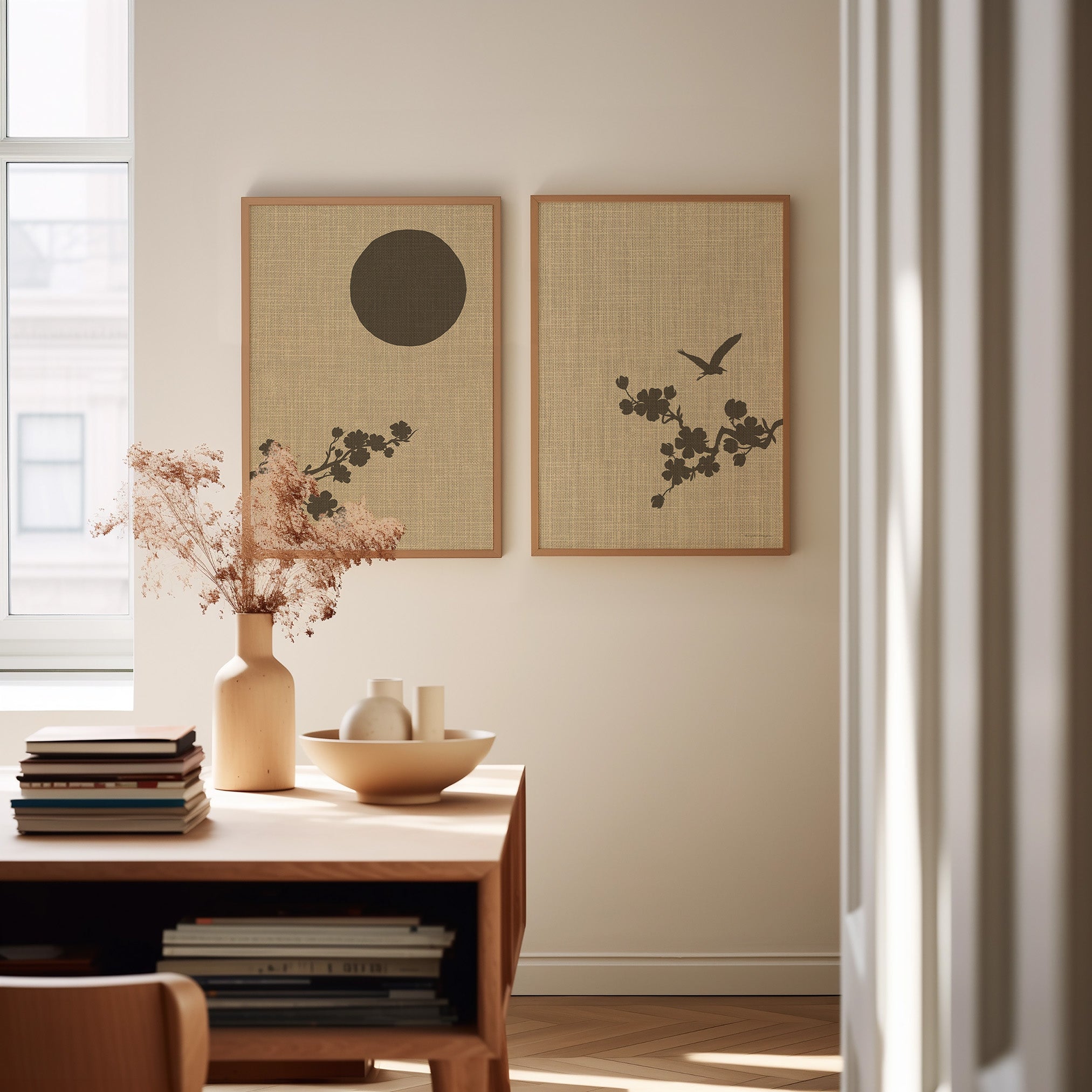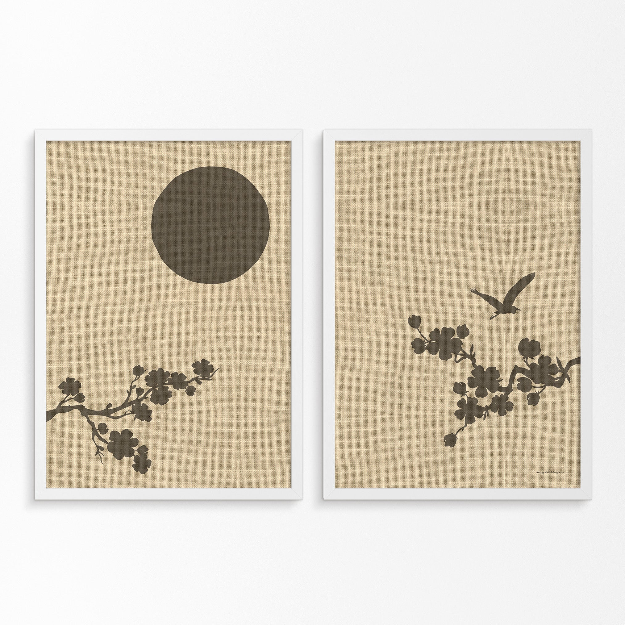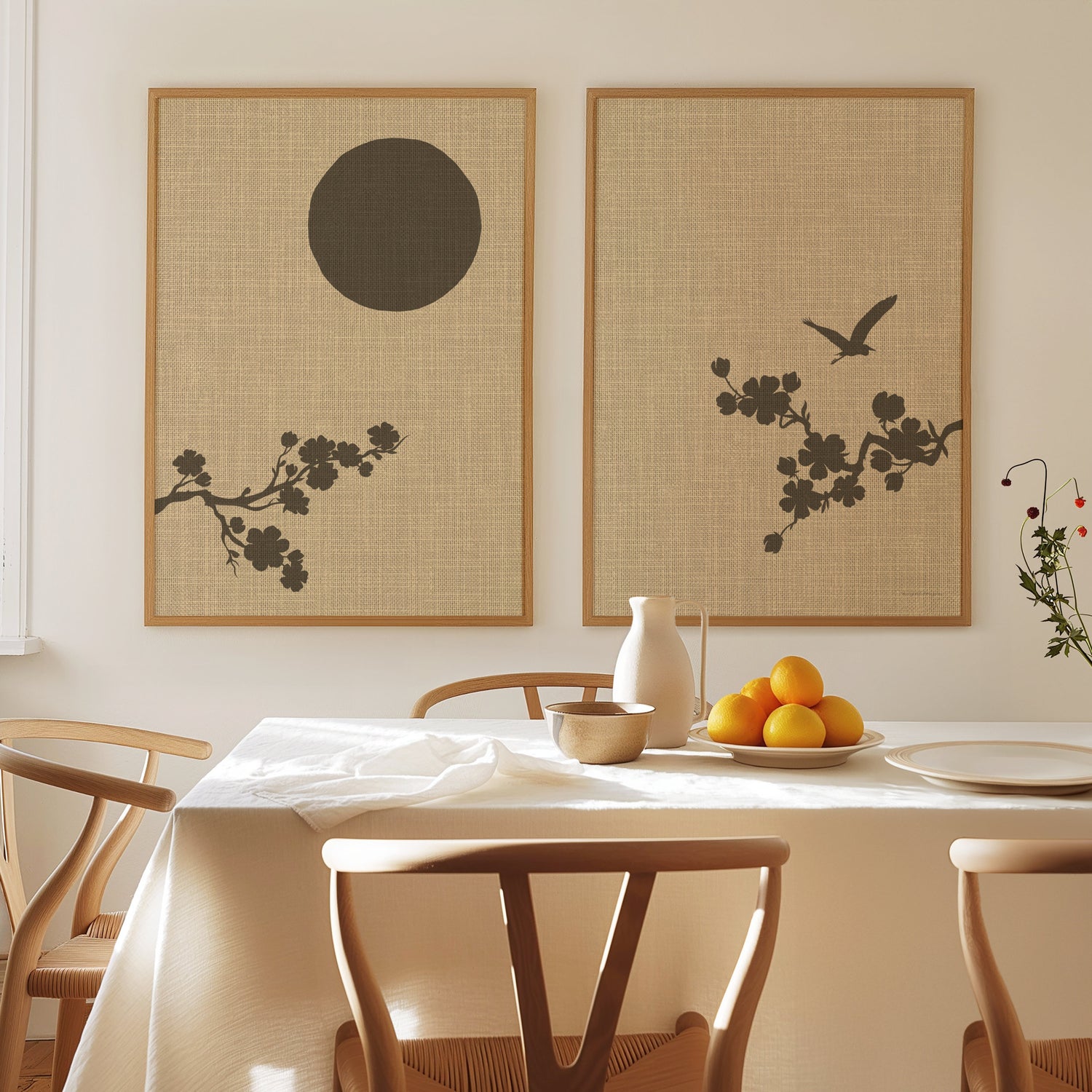 Droom je van een reis naar Japan in de lente? Breng die droomwereld dichterbij met deze tweeluik poster! Bloesemtakken, reigers en een stralende zon, op een linnen look achtergrond, brengt de magie van een Japanse lentewandeling naar jouw eigen woonkamer, slaapkamer, of dat knusse hoekje waar jij tot rust komt.