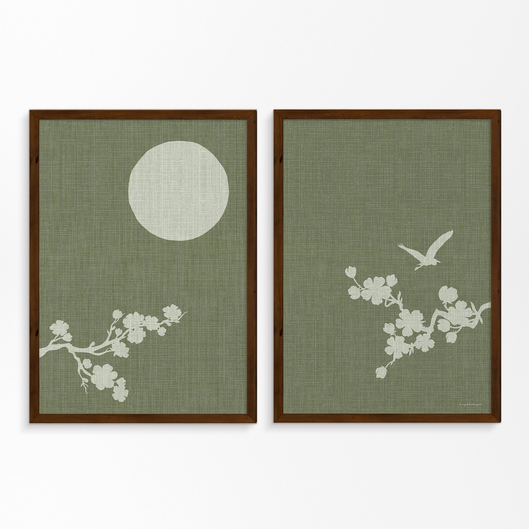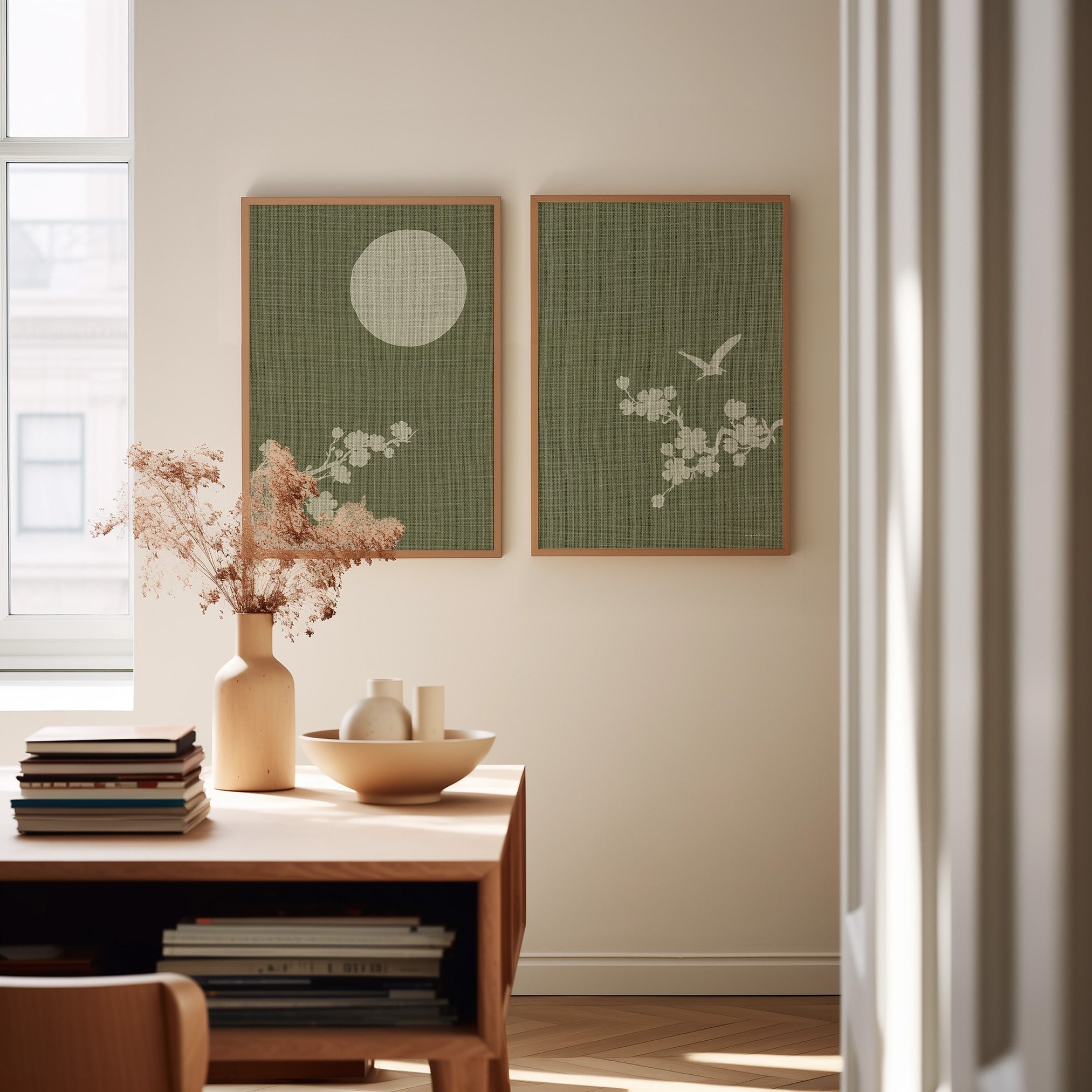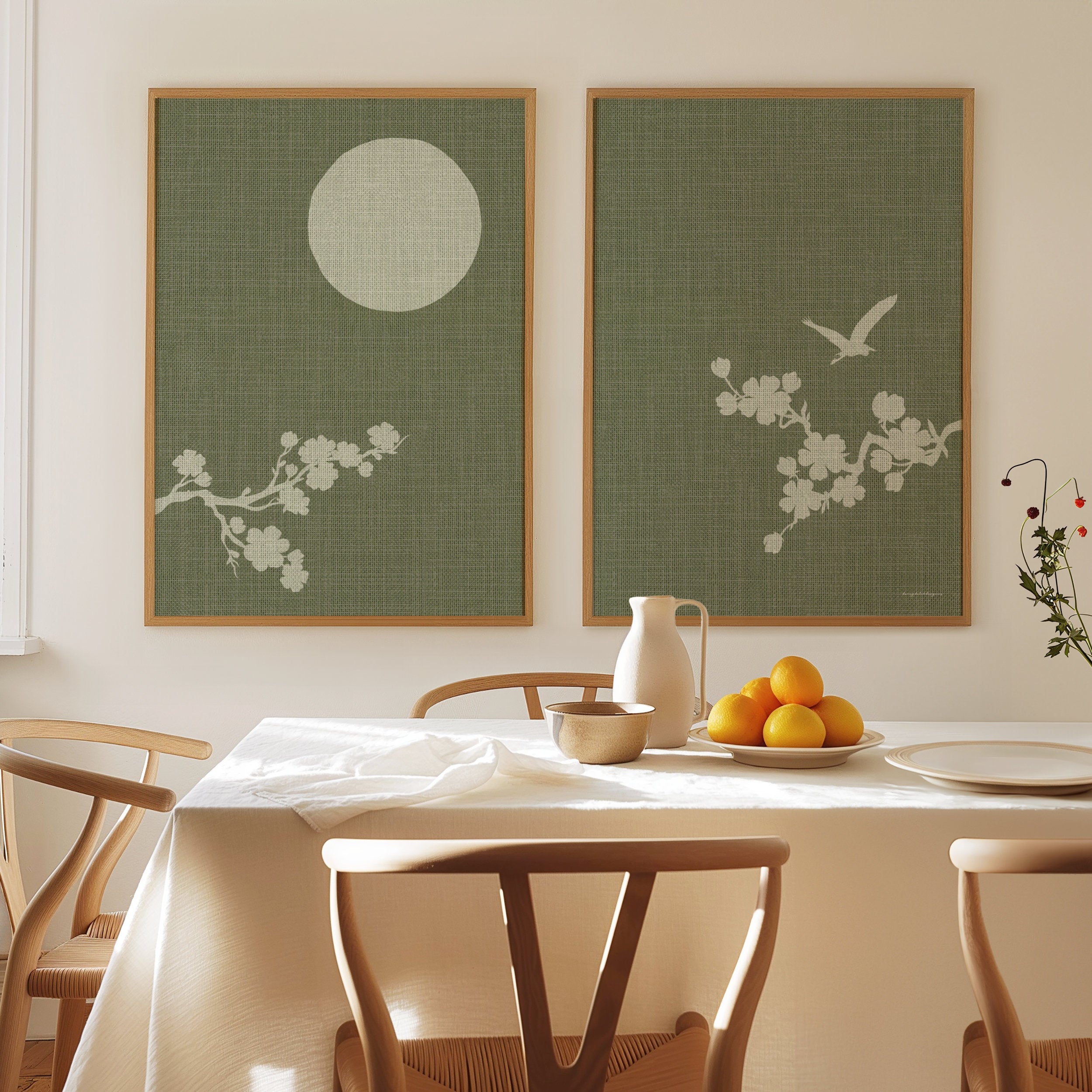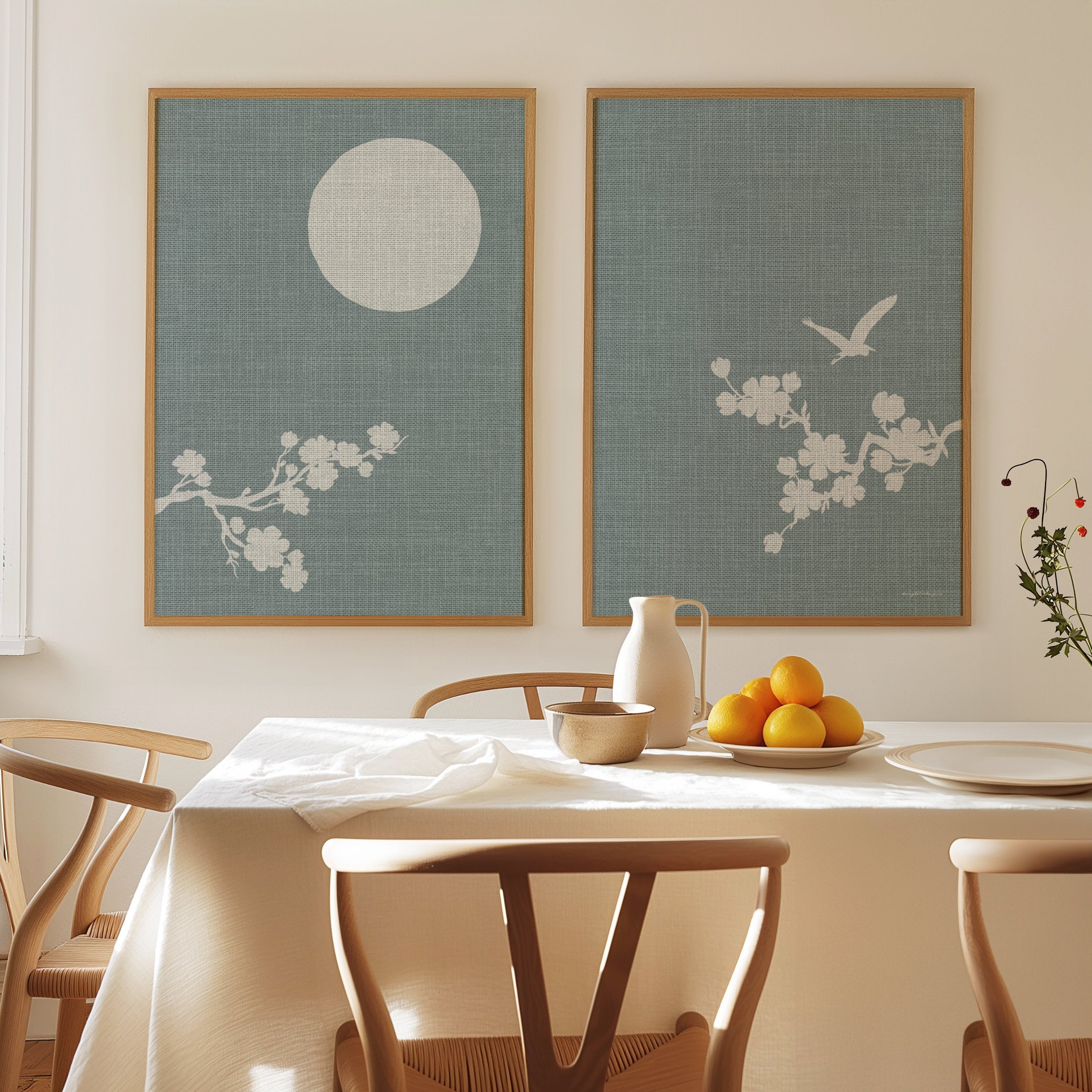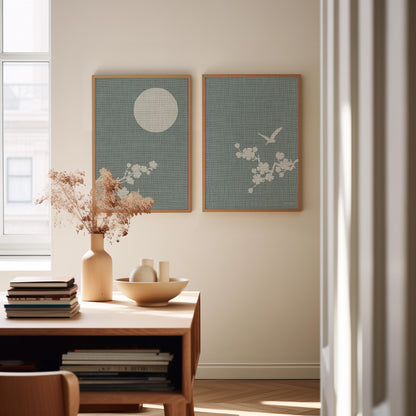 Droom je van een reis naar Japan in de lente? Breng die droomwereld dichterbij met deze tweeluik poster! Bloesemtakken, reigers en een stralende zon, op een linnen look achtergrond, brengt de magie van een Japanse lentewandeling naar jouw eigen woonkamer, slaapkamer, of dat knusse hoekje waar jij tot rust komt.