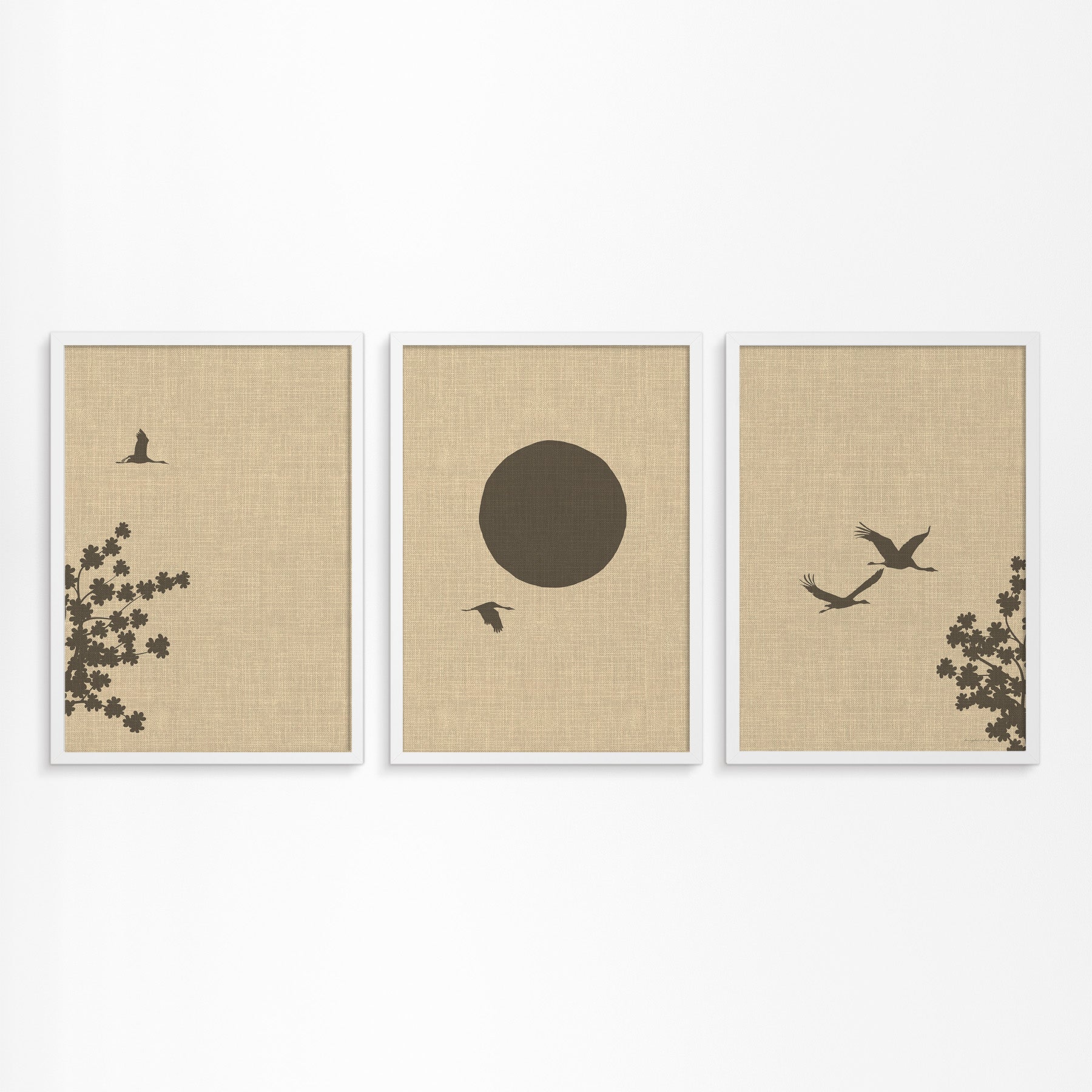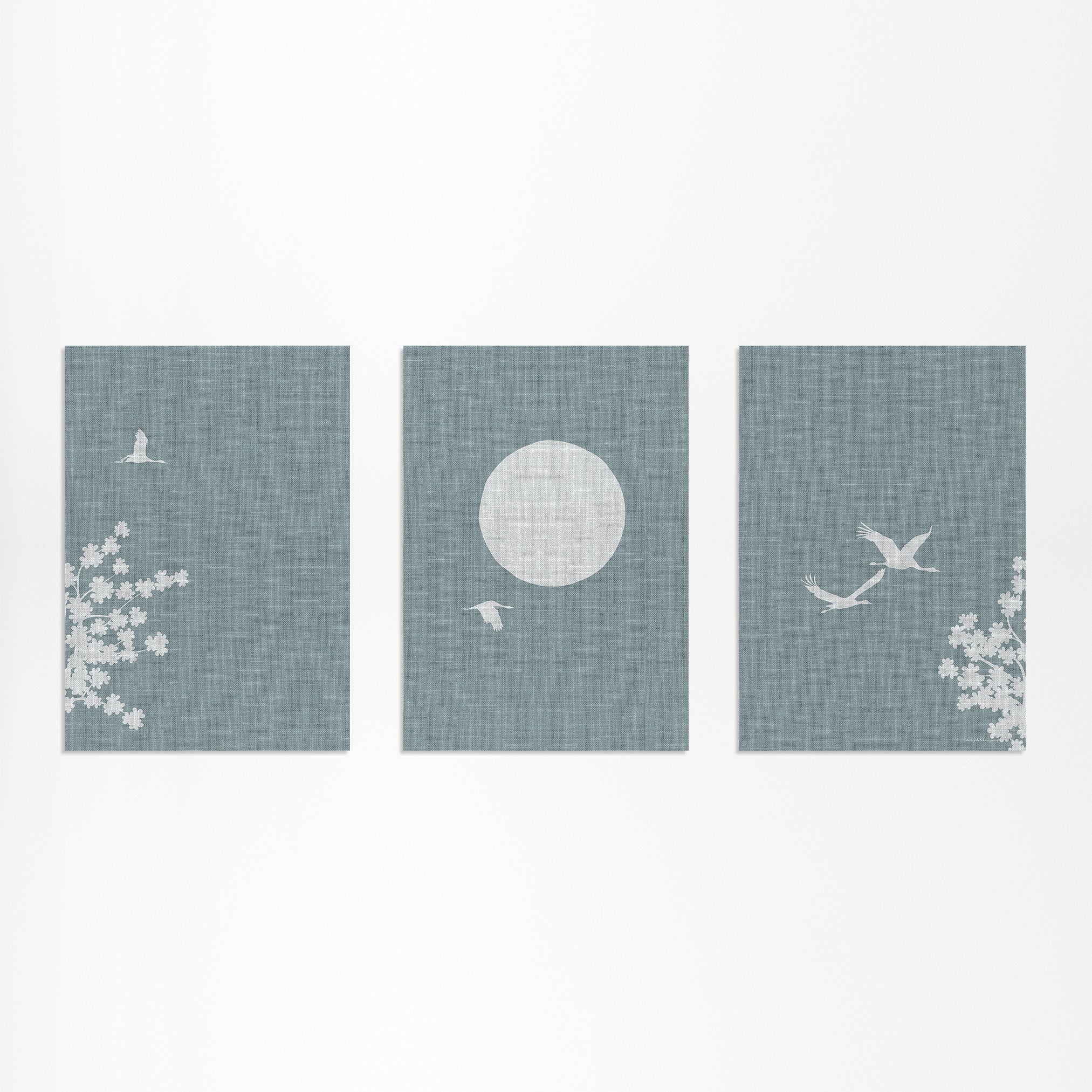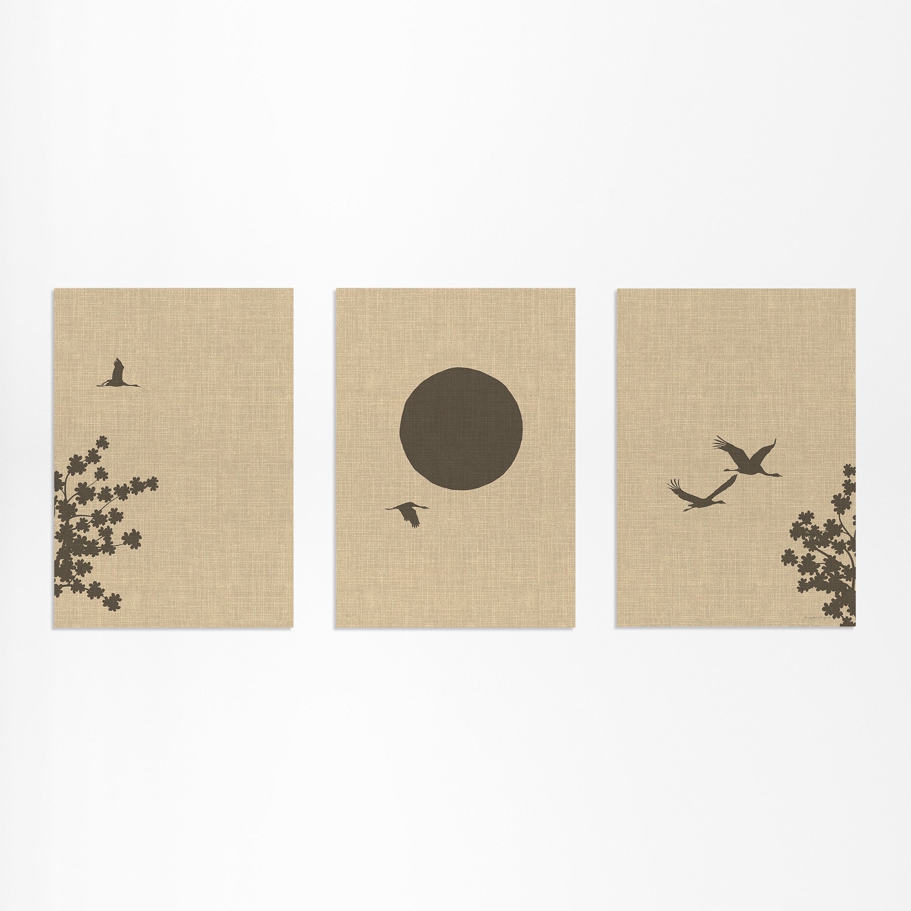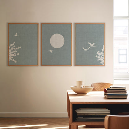 Linnen Look Japanse Lente: Kraanvogels en Bloesemboom Drieluik Poster