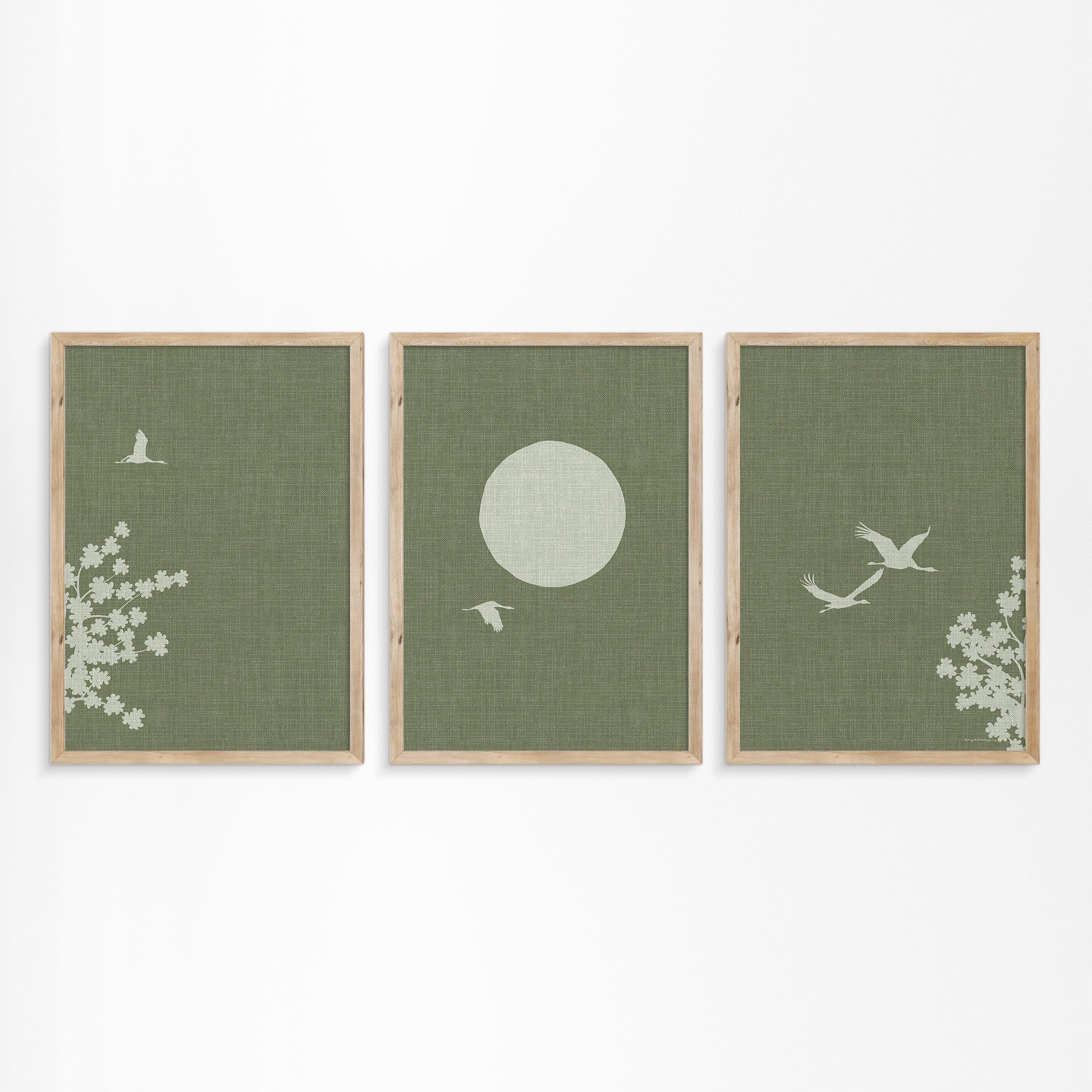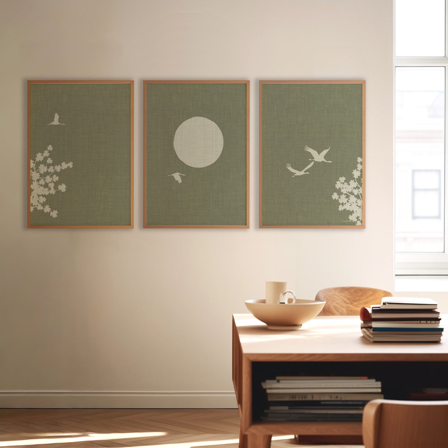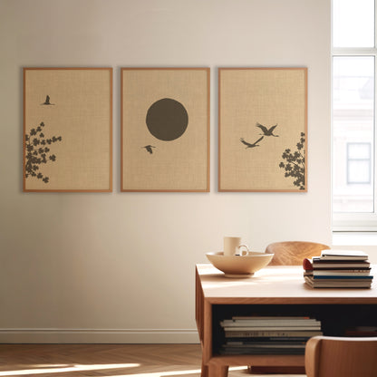 Zou je willen dat je je kon omringen met bloeiende bloesembomen en sierlijke kraanvogels, net als in een Japanse lente? En je de warmte van de zon voelt terwijl je deze serene scène bewondert? Deze prachtige drieluik poster, met een linnen-look afwerking, brengt die rustgevende en warme sfeer naar jouw woonkamer of slaapkamer.