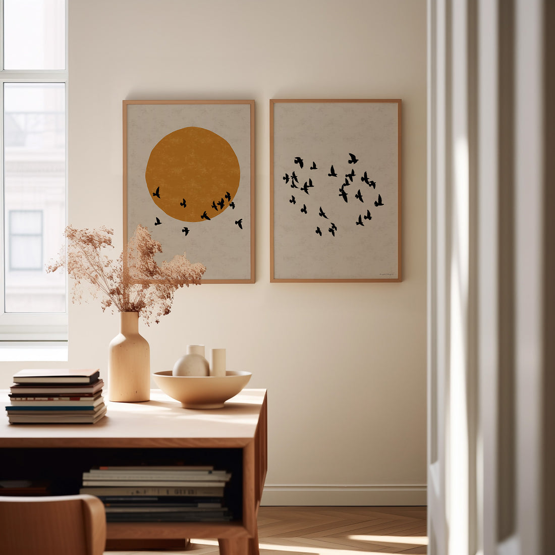 Drieluik Poster: Zon en Vogels in VluchtDrieluik Poster: Zon en Vogels in Vlucht- Reguliere prijs