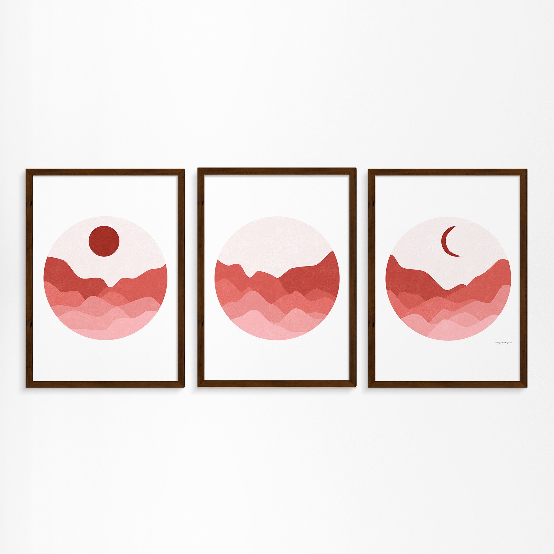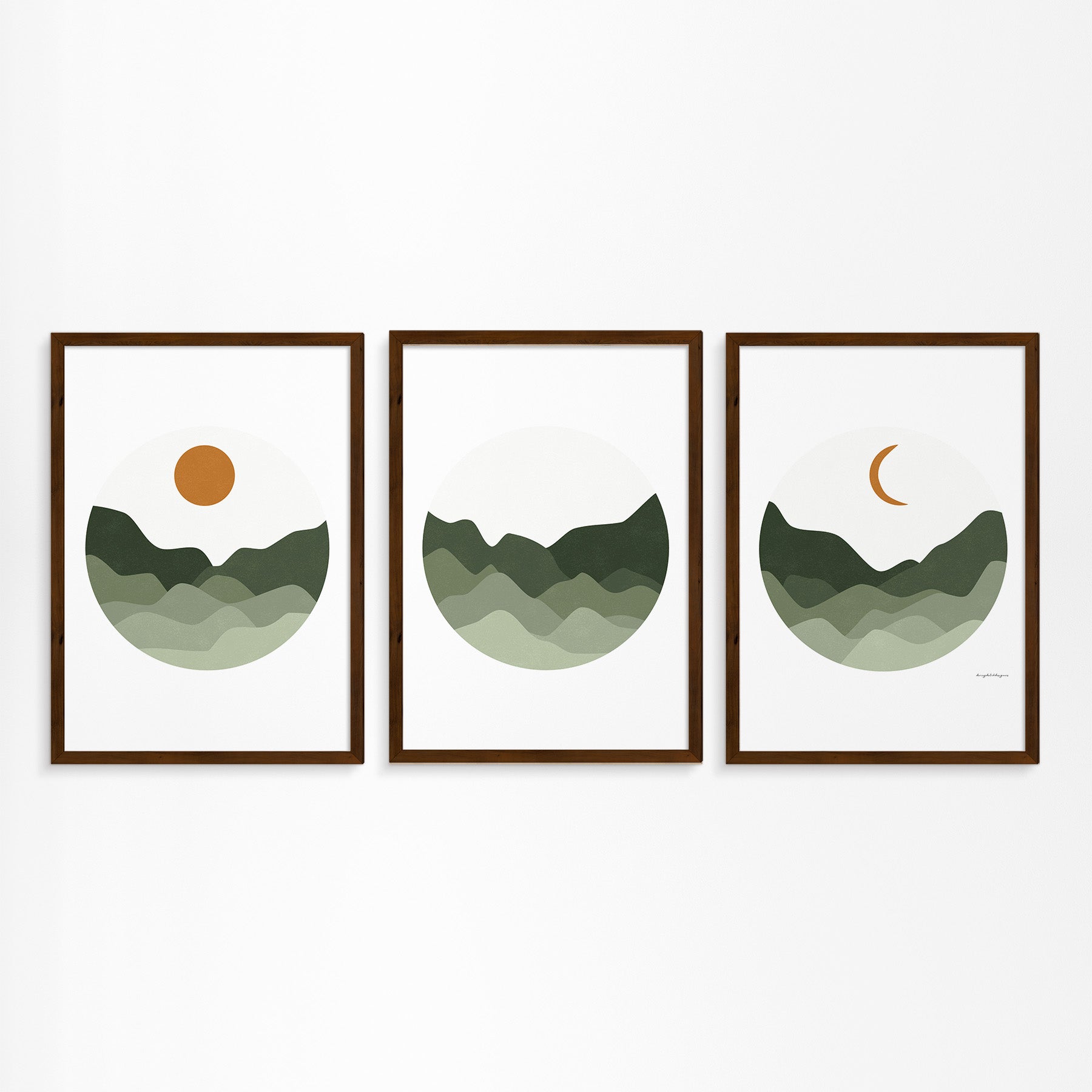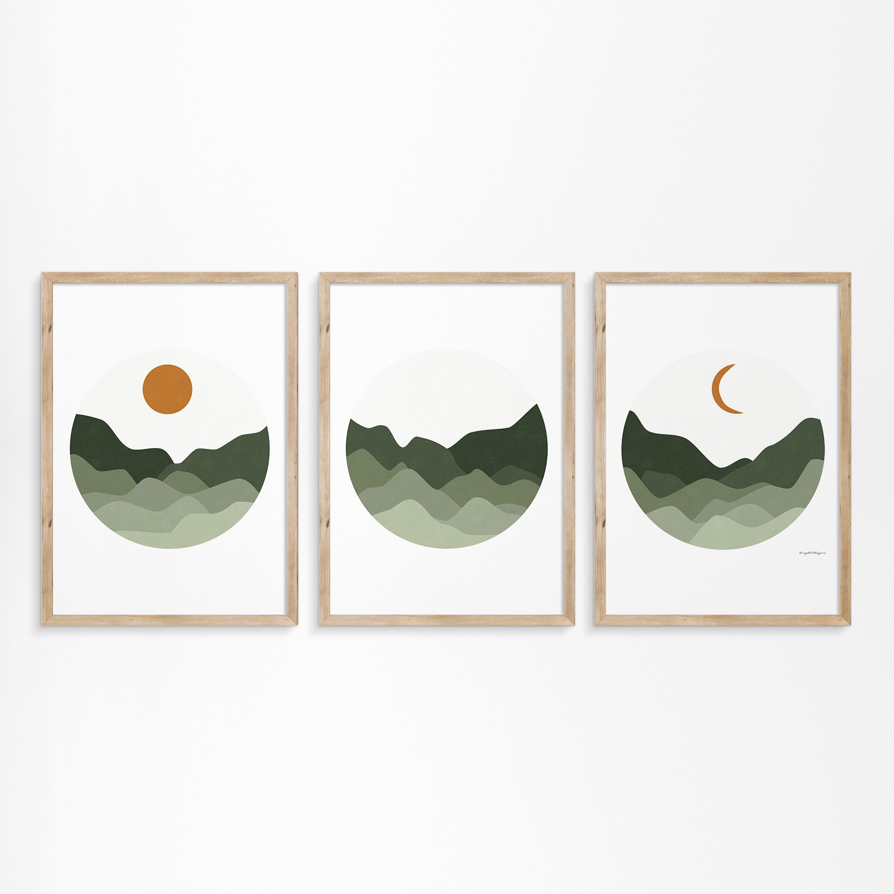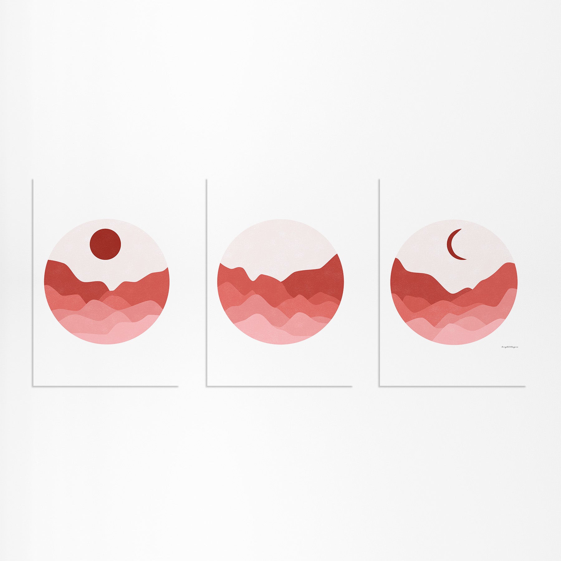 Do you miss the mountains as soon as you’re home? With this triptych poster, you don't have to anymore! Each of the three circles features a unique mountain scene, with the sun rising and the moon shining brightly in the sky.