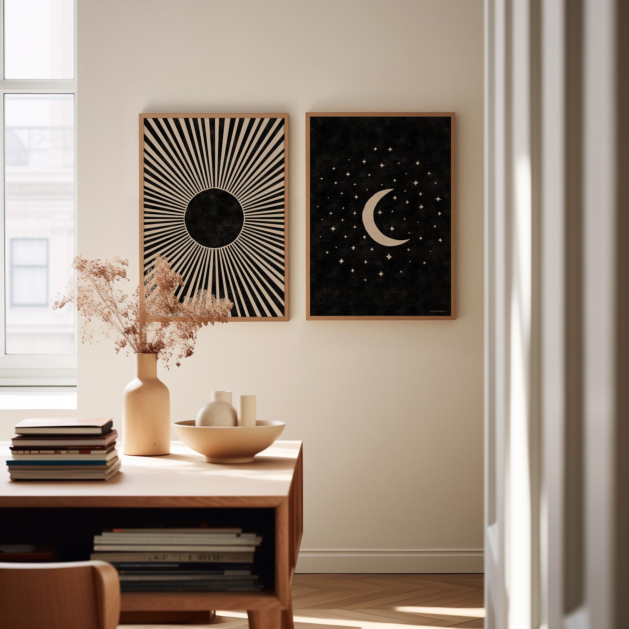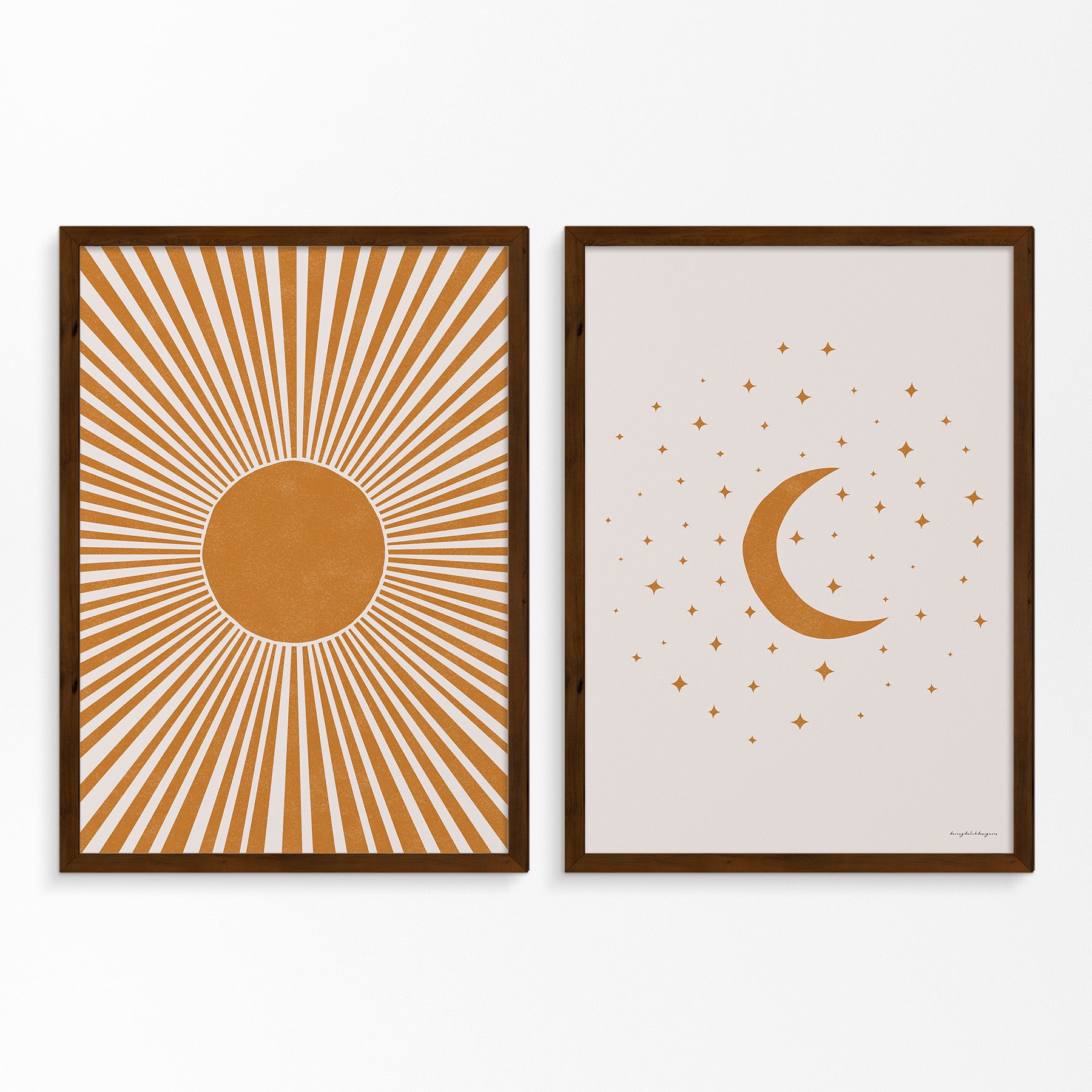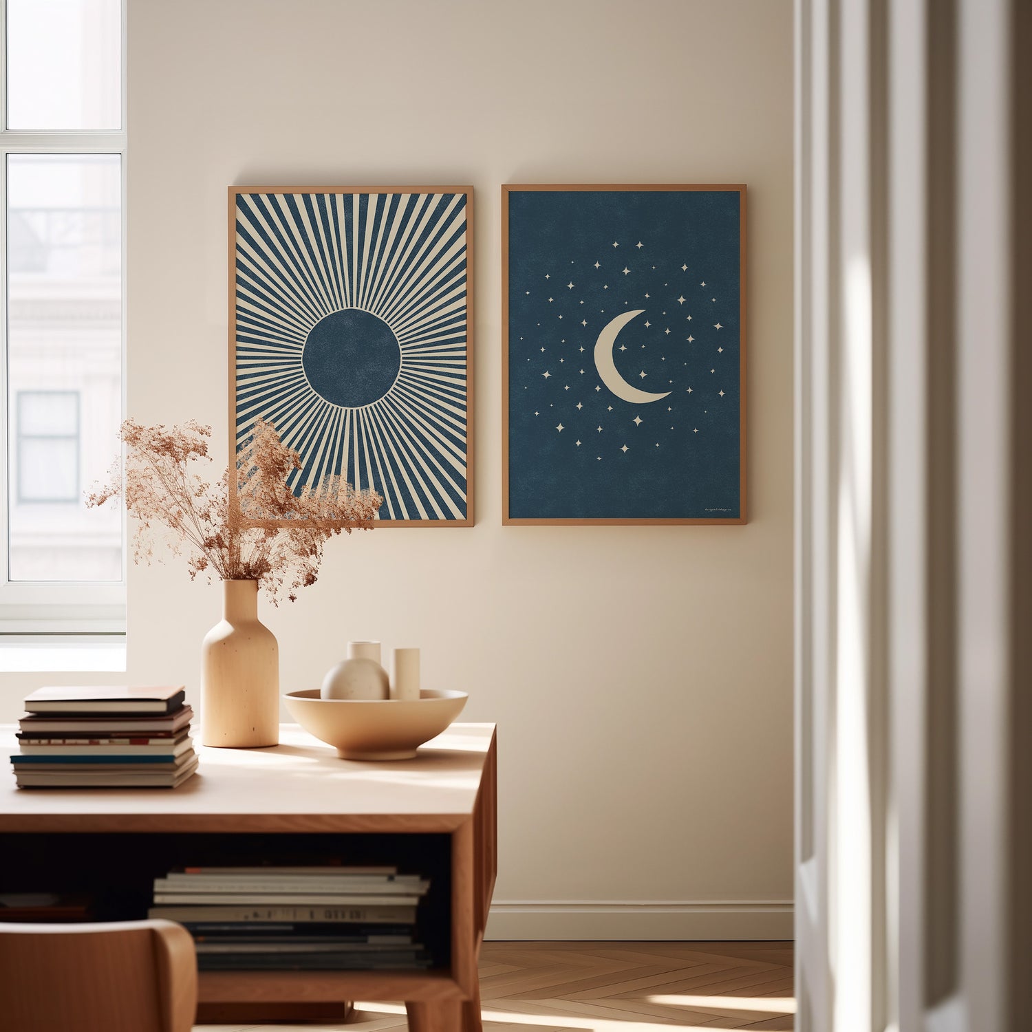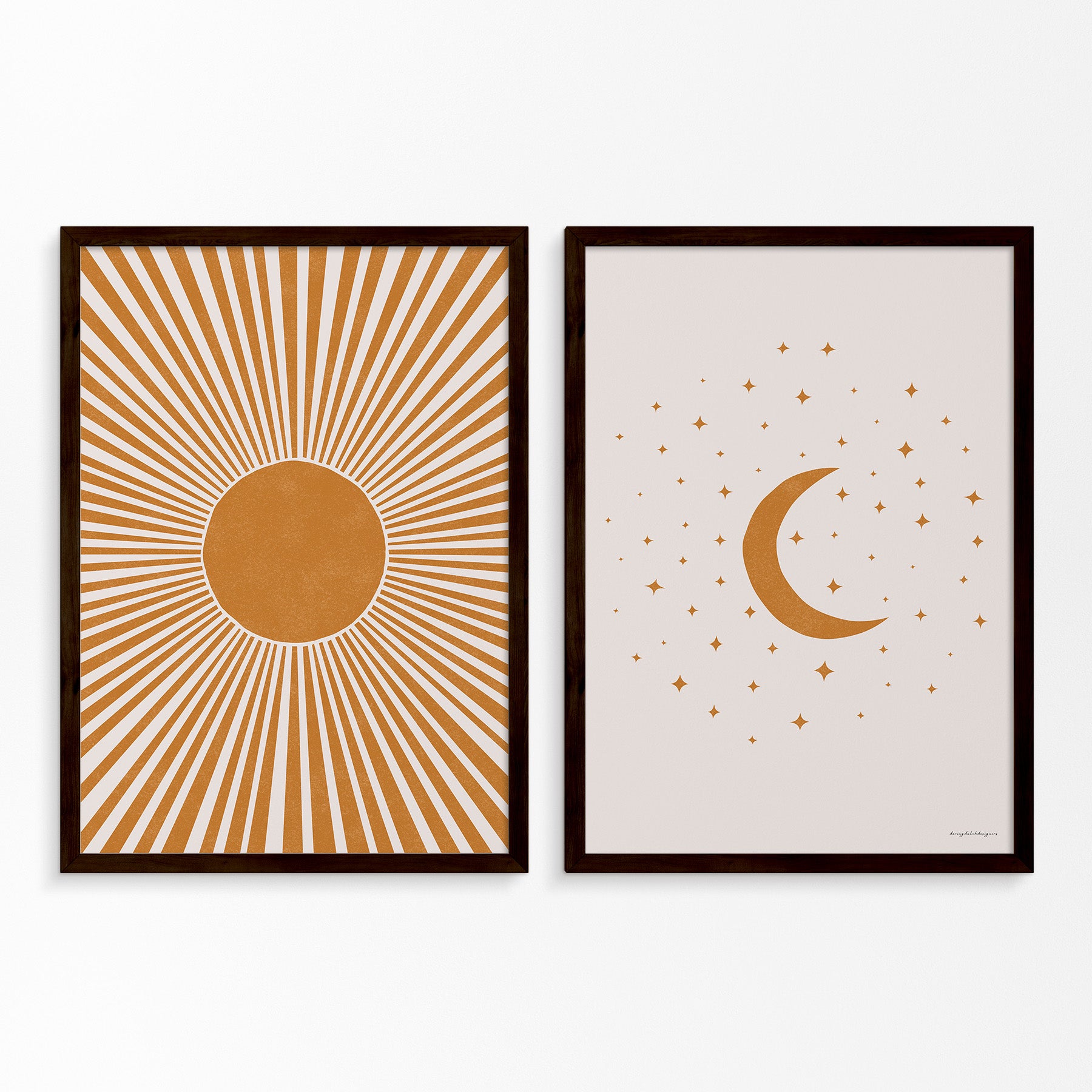 Let the Sun and Moon Diptych Poster remind you of the beauty of nature and the magic of the night. Perfect for adding a touch of boho charm to your space, or hang it in a child's room or nursery to create an inspiring environment where little ones can dream of distant galaxies and sunny adventures.