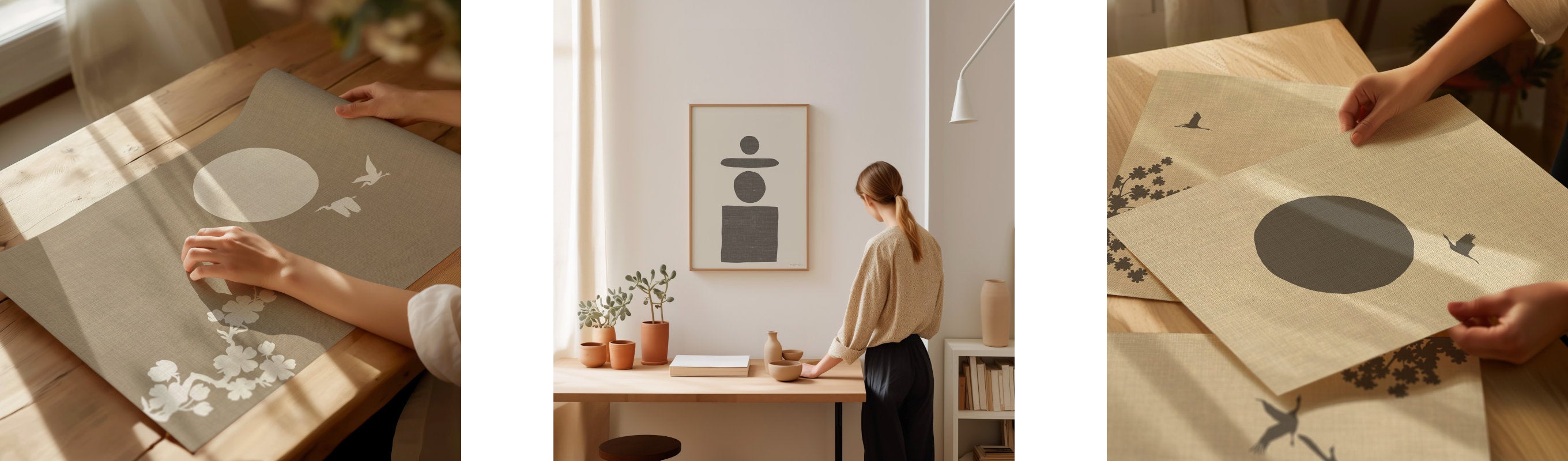 Japandi-interieurs worden vaak verfraaid met kunstwerken die de authtentieke schoonheid van zowel de Japanse als Scandinavische landschappen weerspiegelen. Denk aan serene landschappen, minimalistische illustraties van flora en fauna, of abstracte composities die harmonie uitstralen. Deze kunstwerken worden vaak gepresenteerd in eenvoudige, houten lijsten om naadloos bij de rest van het interieur te passen.