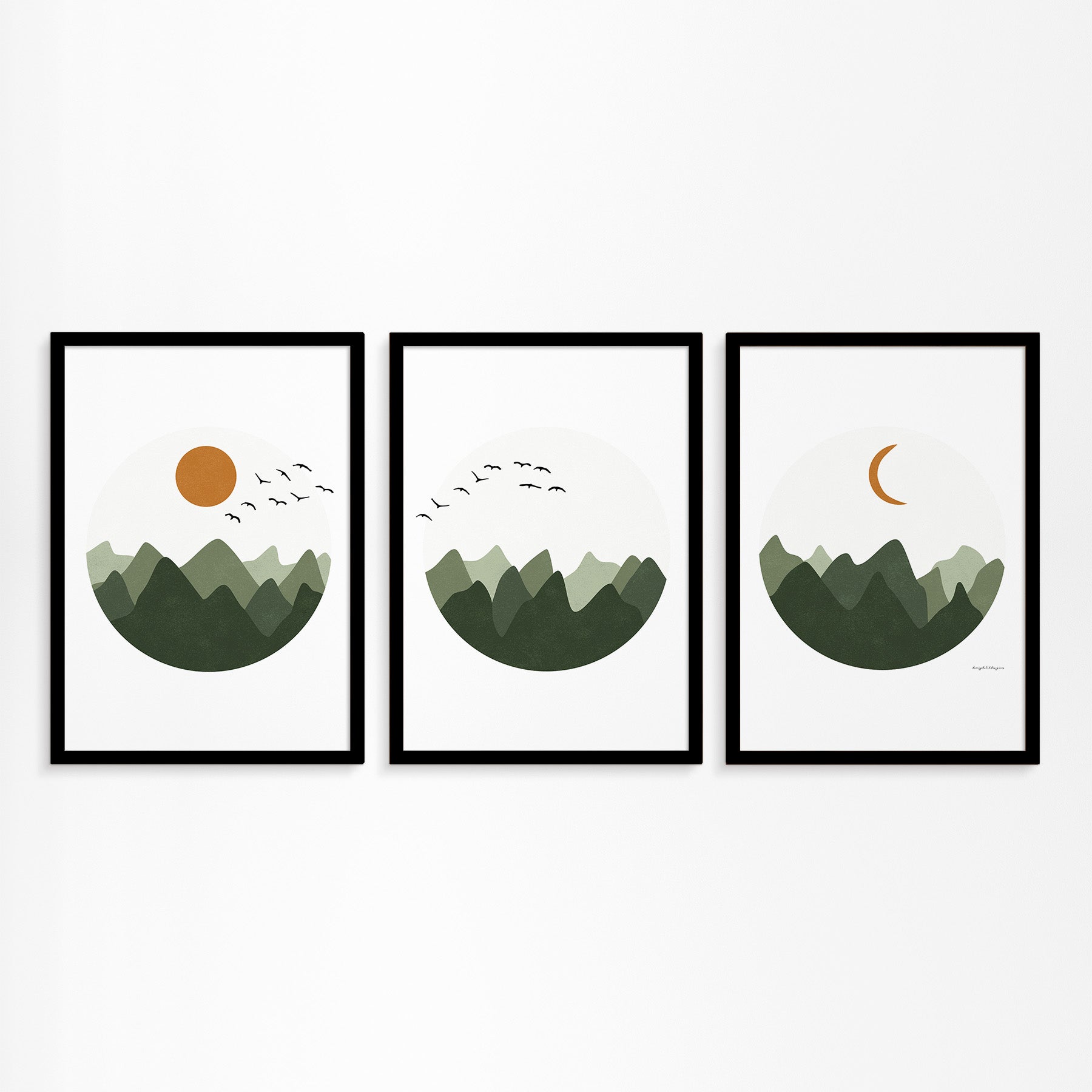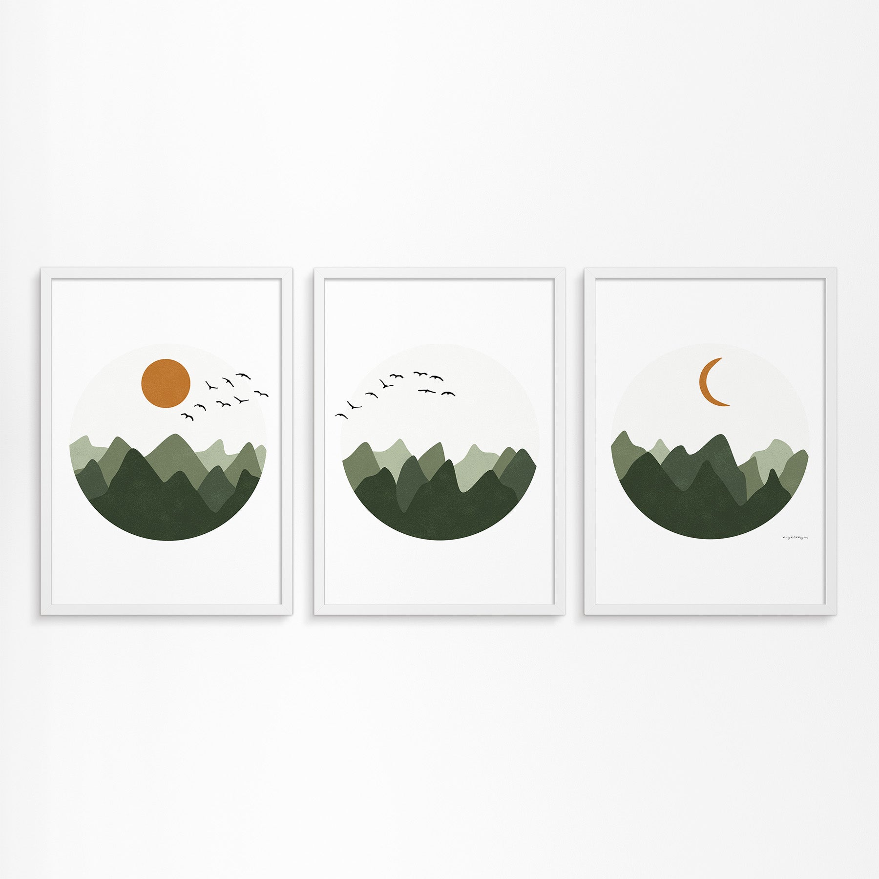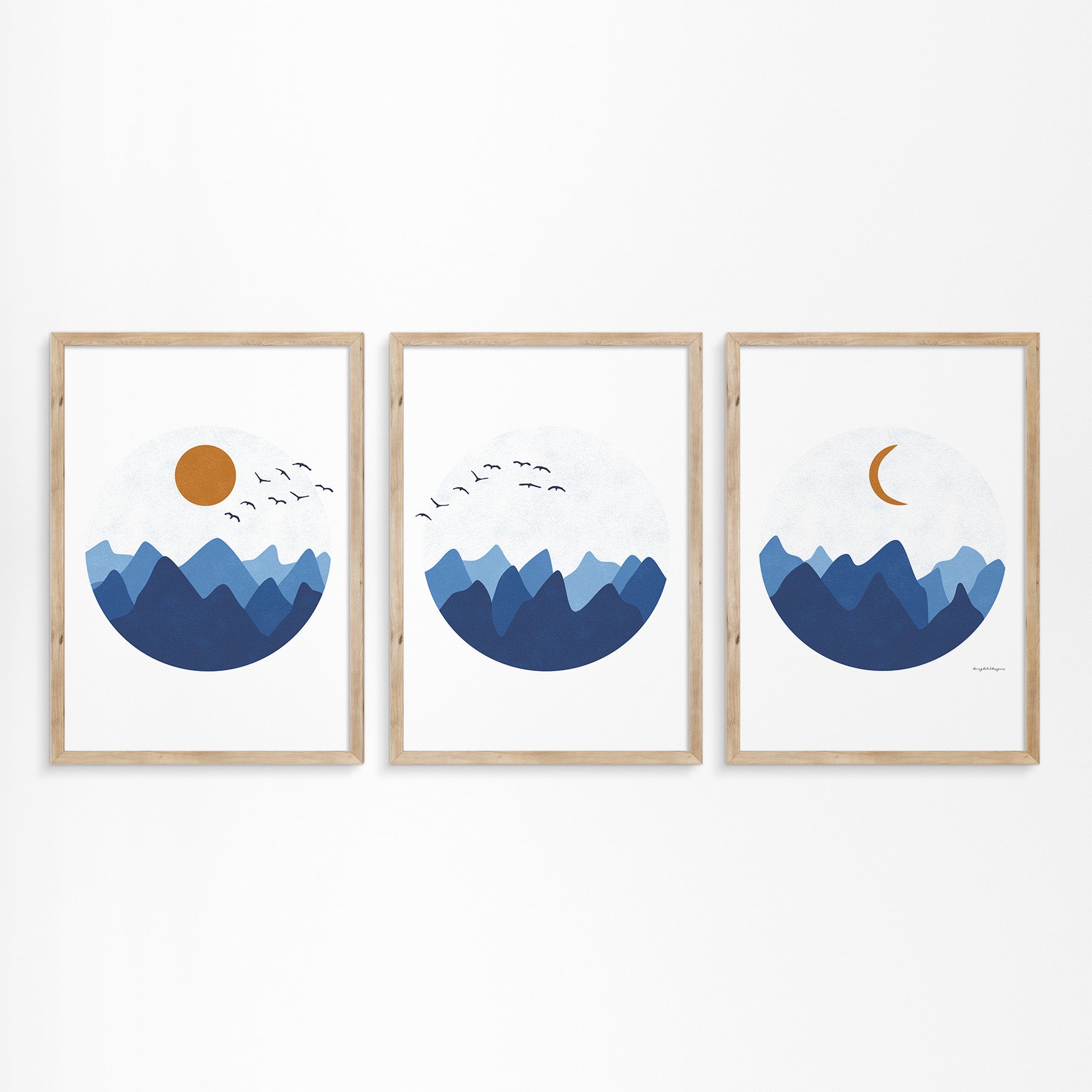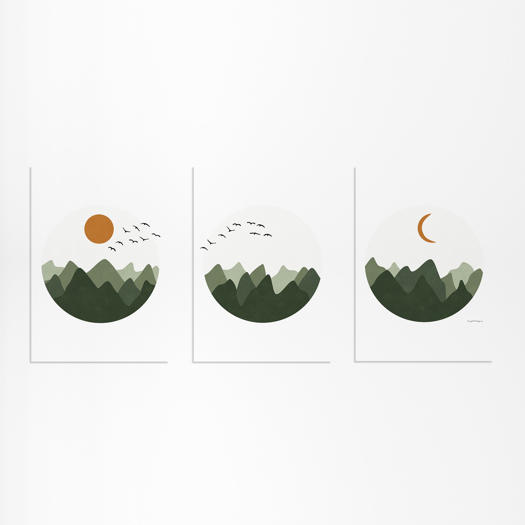 Breng de magie van de bergen naar je muur met deze drieluik poster. Elke cirkel nodigt je uit om weg te dromen – van zonovergoten pieken, maanverlichte nachten en vogels die vrij rondvliegen.
