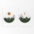 Breng de sfeer van een bergchalet naar je huis met deze tweeluik poster! Elke cirkel is een venster naar jouw droomlandschap – bergen verlicht door zon en maan, en vogels die hoog door de lucht zweven.