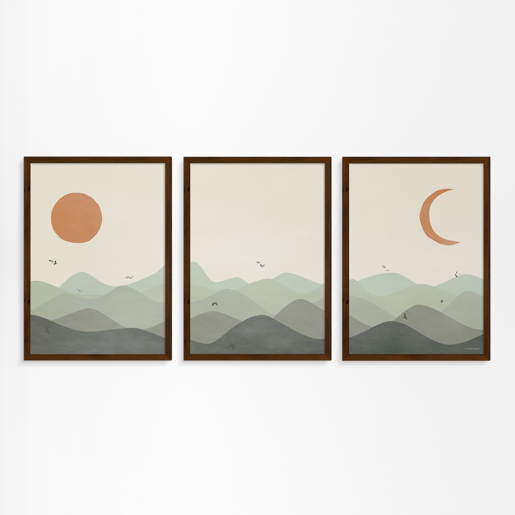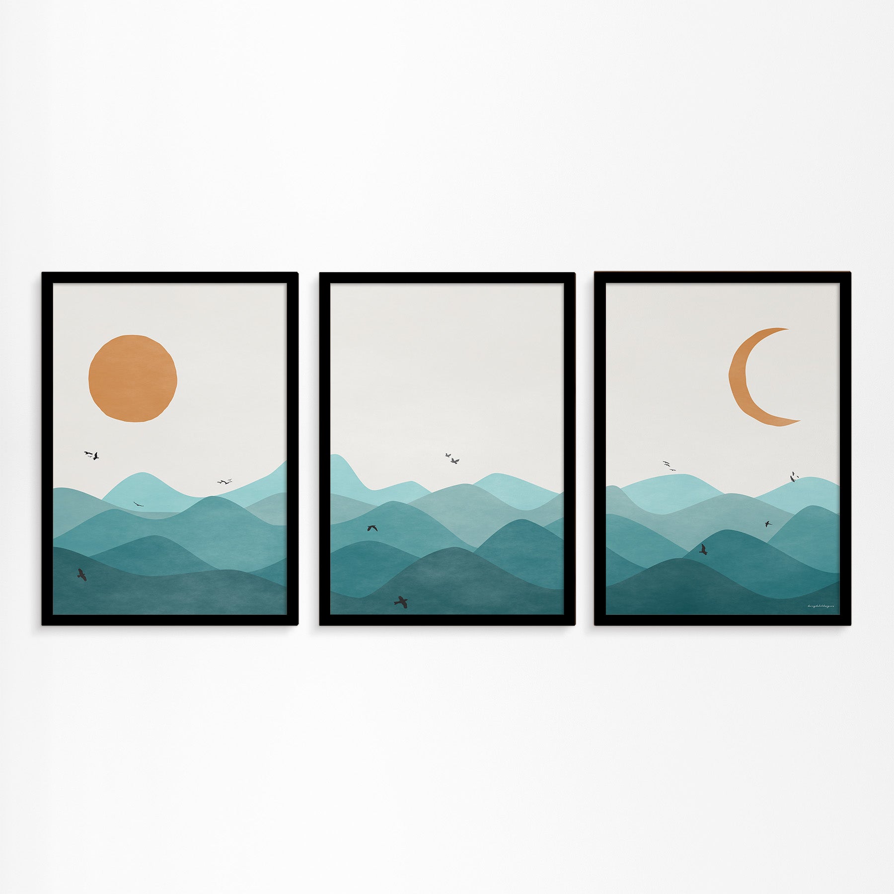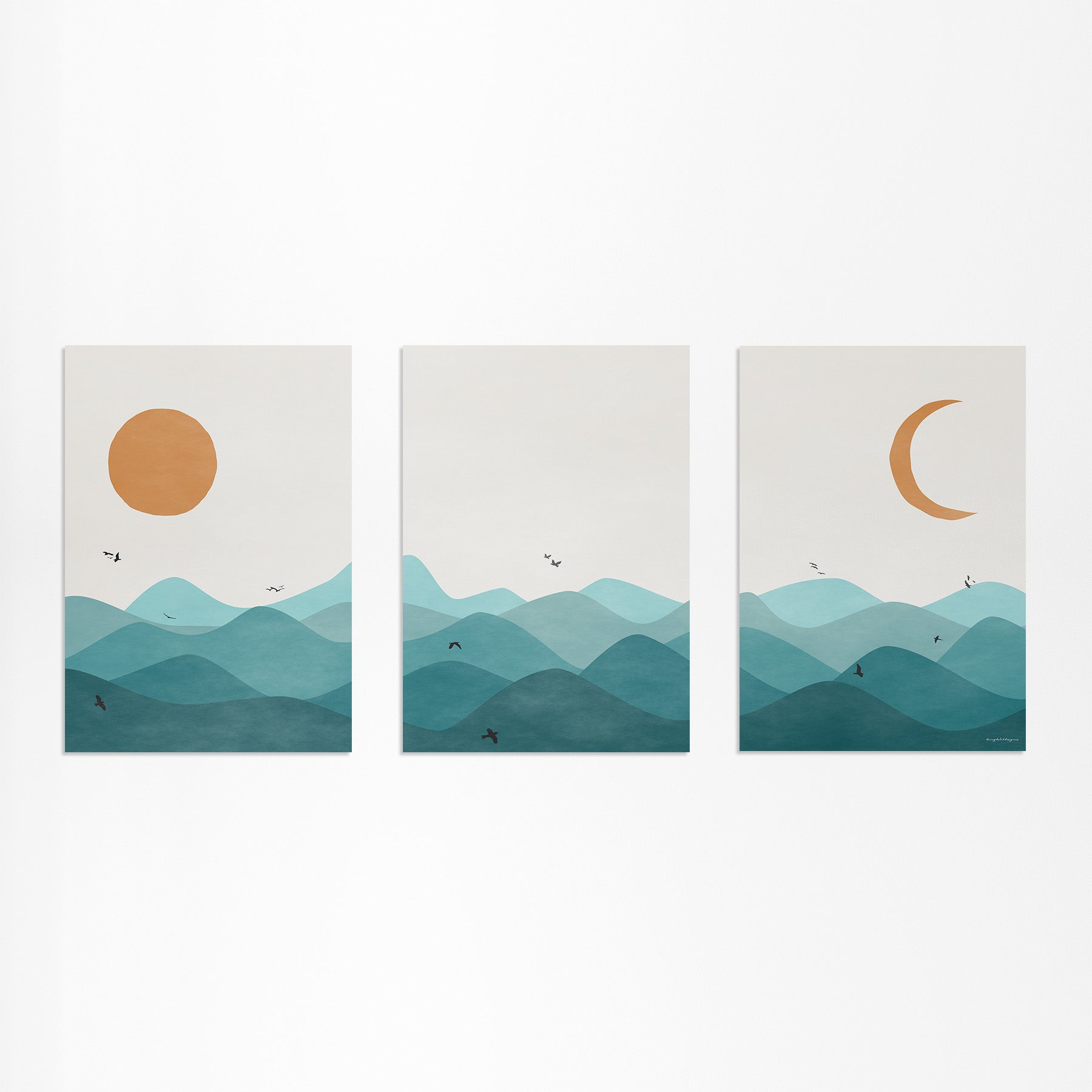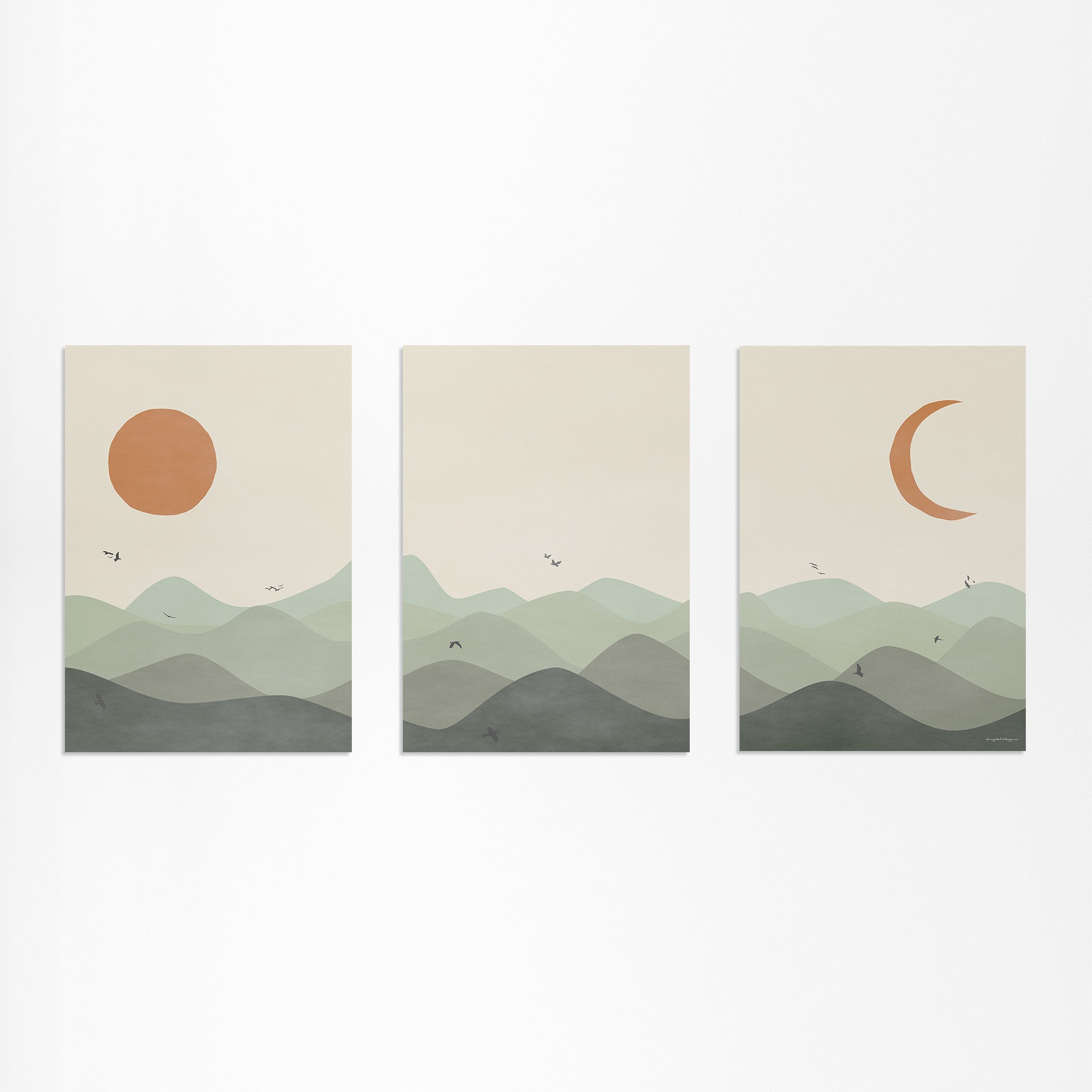 Soms zit de magie in eenvoud – een rij bergen tegen de horizon, vogels die hoog zweven, en de zon die langzaam wordt vervangen door de zachte gloed van de maan. Dit drieluik vangt die tijdloze momenten en brengt ze bij je thuis. Een ode aan de rust van de natuur, de kracht van de bergen, en het spel van licht en schaduw.