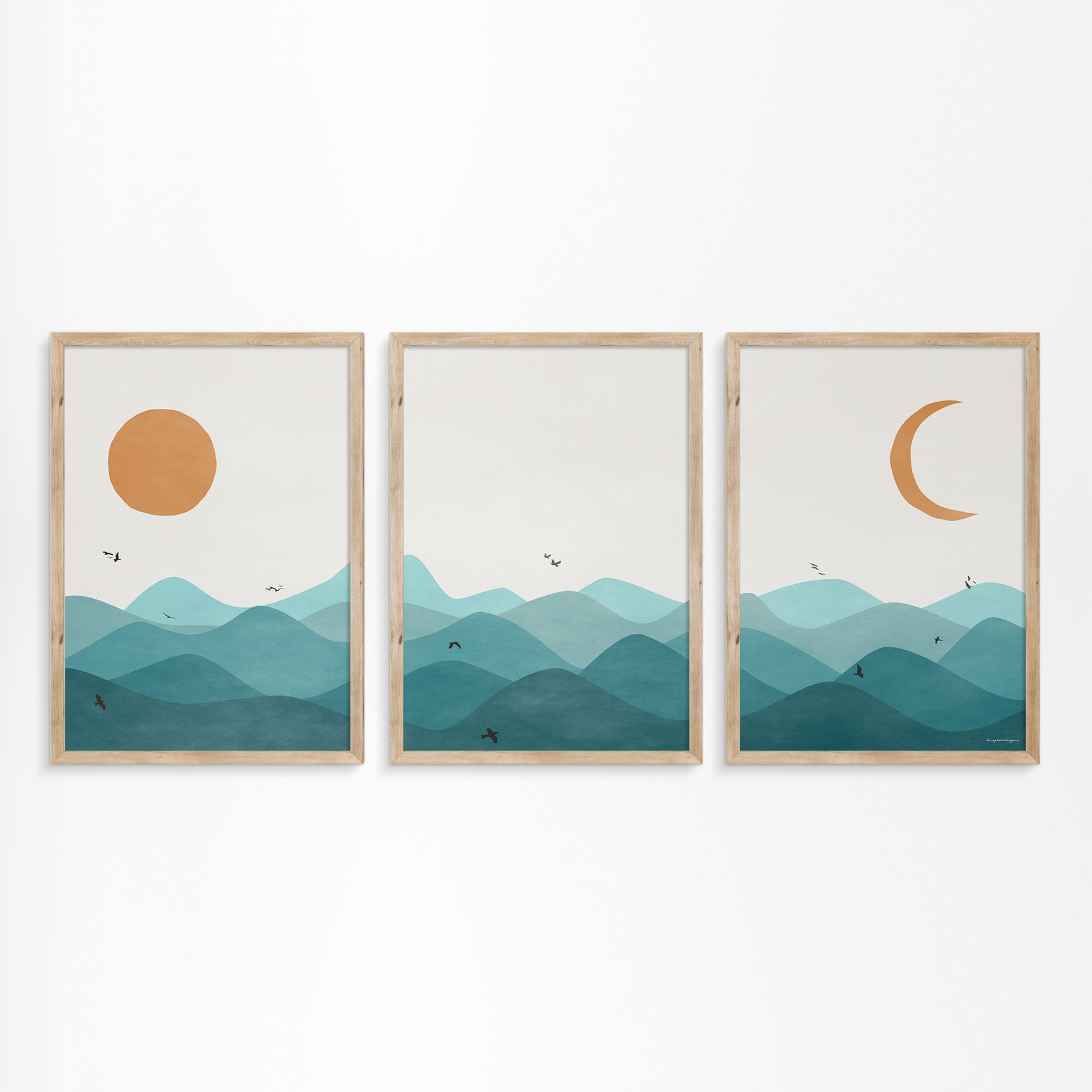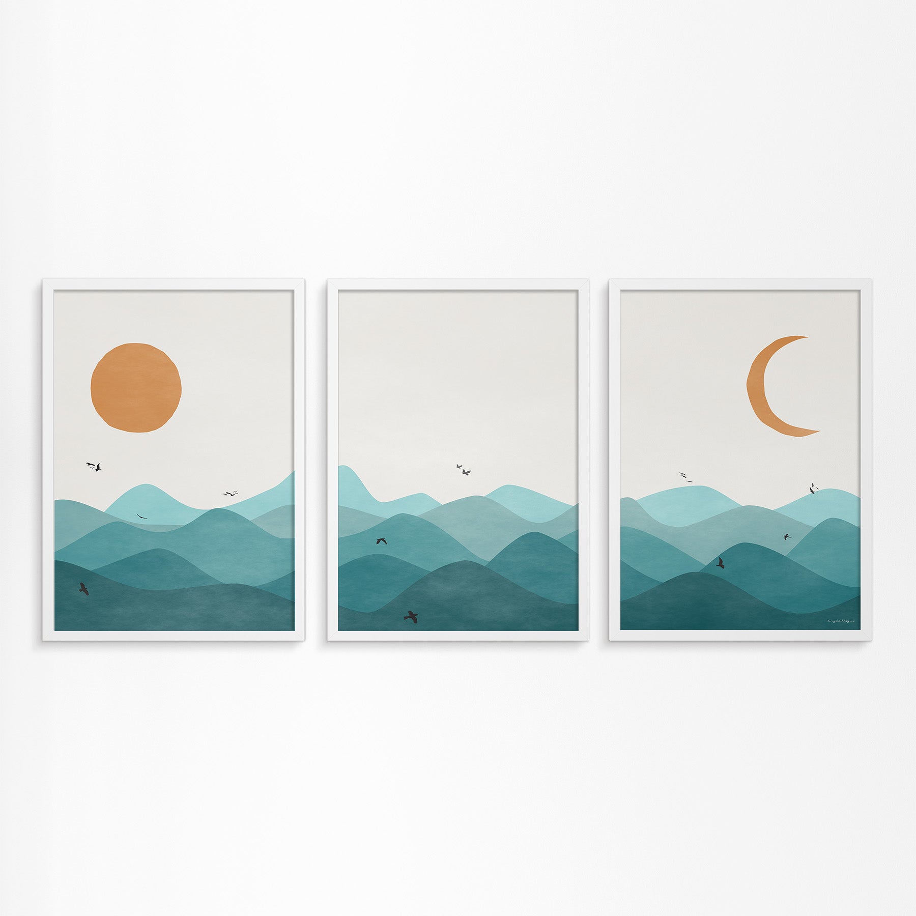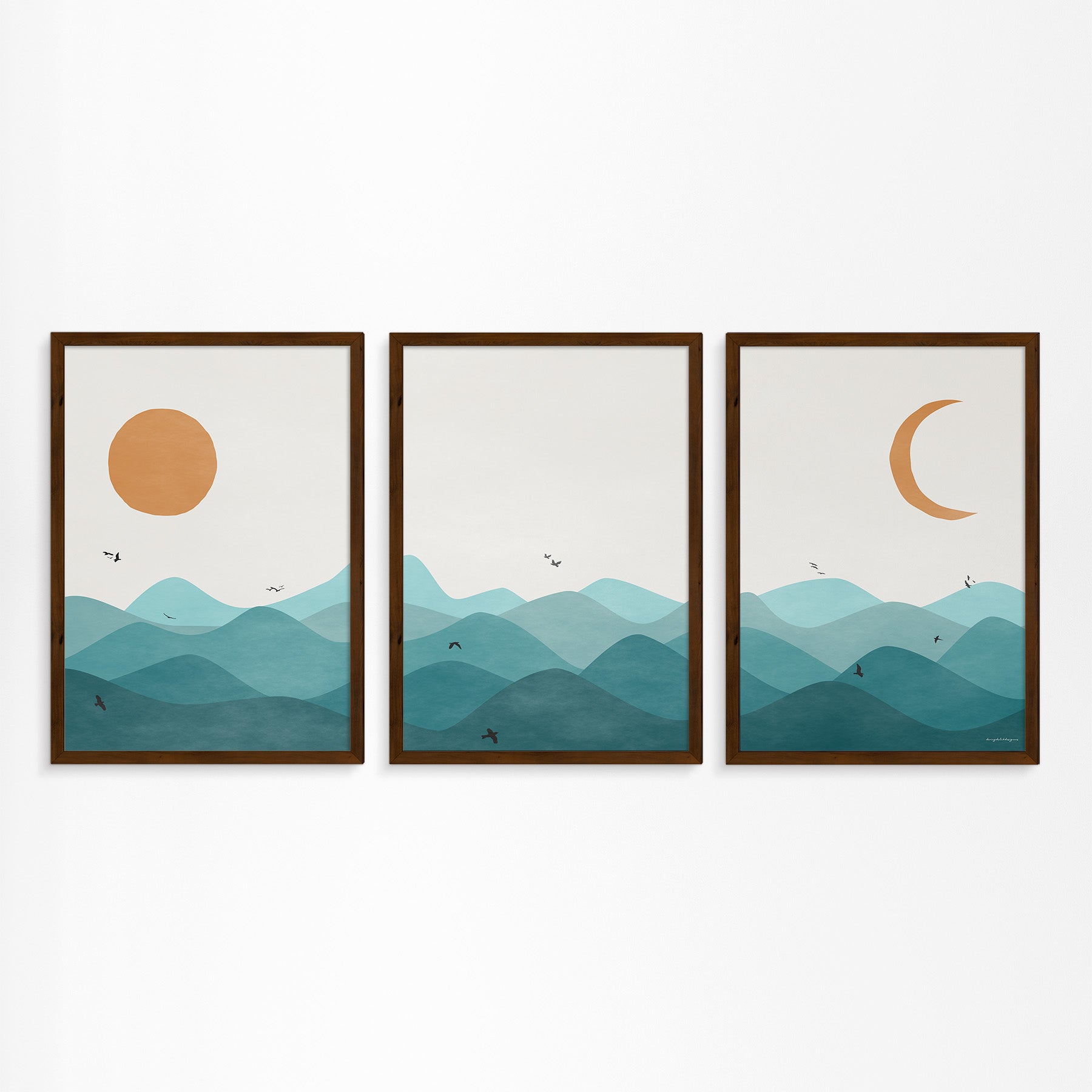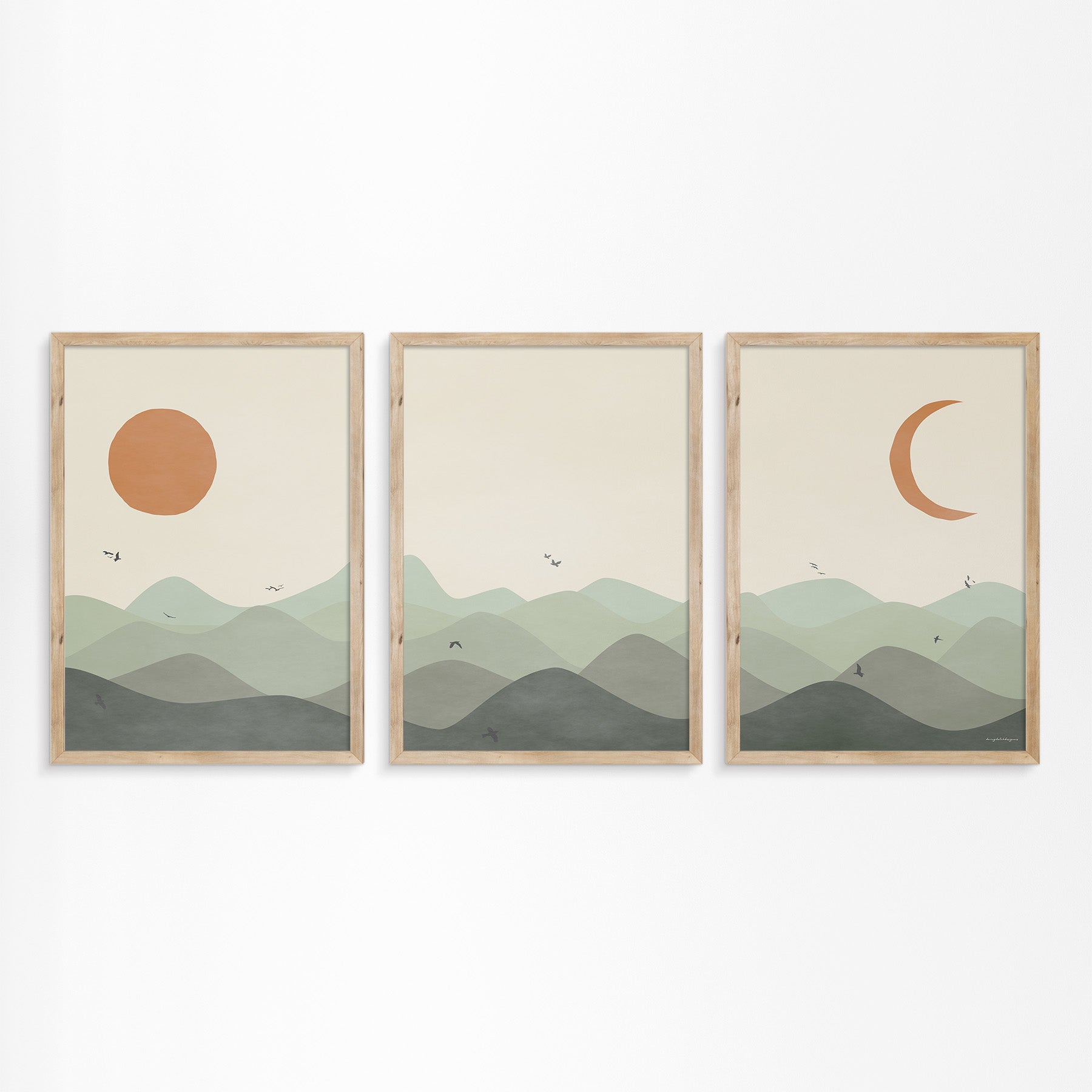 Soms zit de magie in eenvoud – een rij bergen tegen de horizon, vogels die hoog zweven, en de zon die langzaam wordt vervangen door de zachte gloed van de maan. Dit drieluik vangt die tijdloze momenten en brengt ze bij je thuis. Een ode aan de rust van de natuur, de kracht van de bergen, en het spel van licht en schaduw.