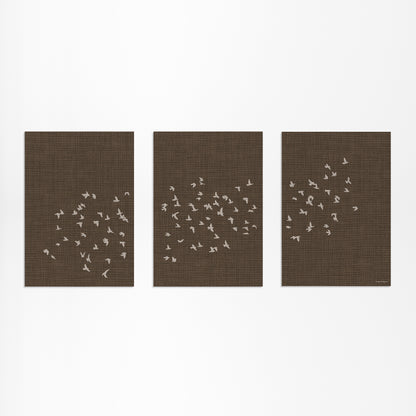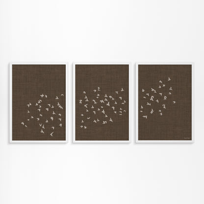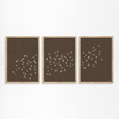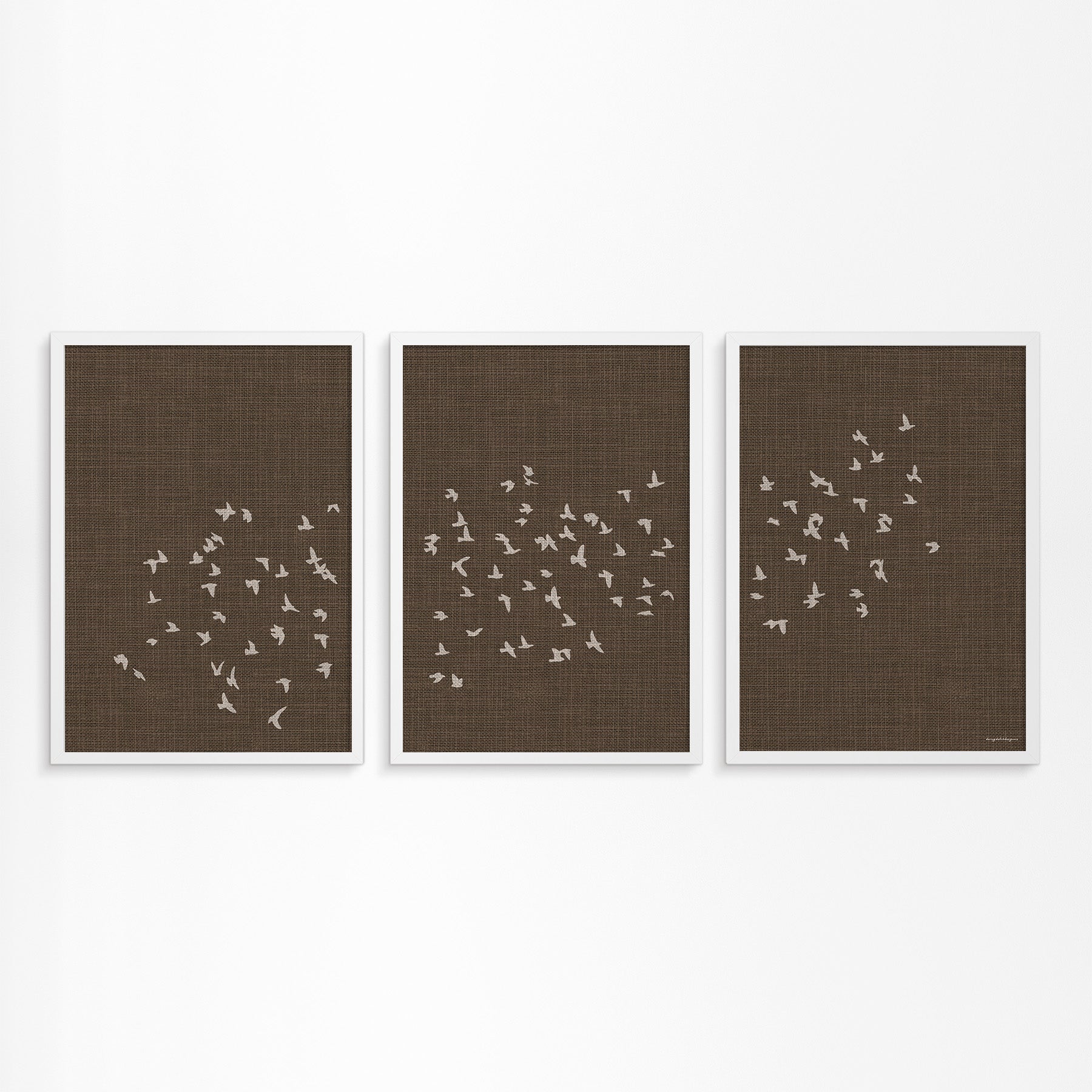 Er is iets magisch aan het zien van vogels die vrij door de lucht vliegen, nietwaar? Deze drieluik poster legt dat gevoel vast, gecombineerd met de warmte van de linnen-look.