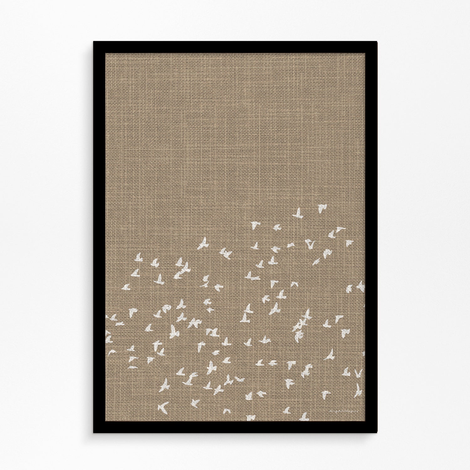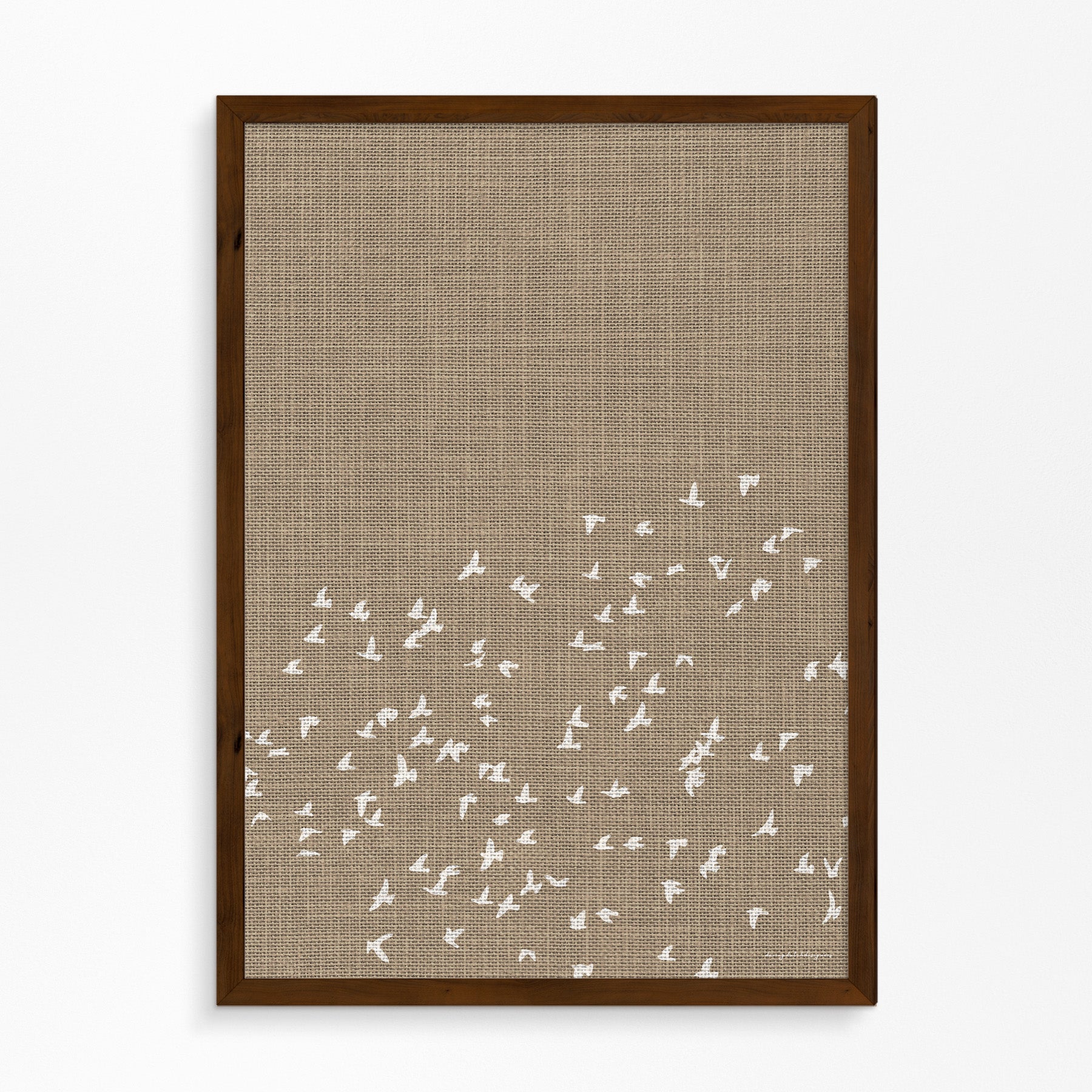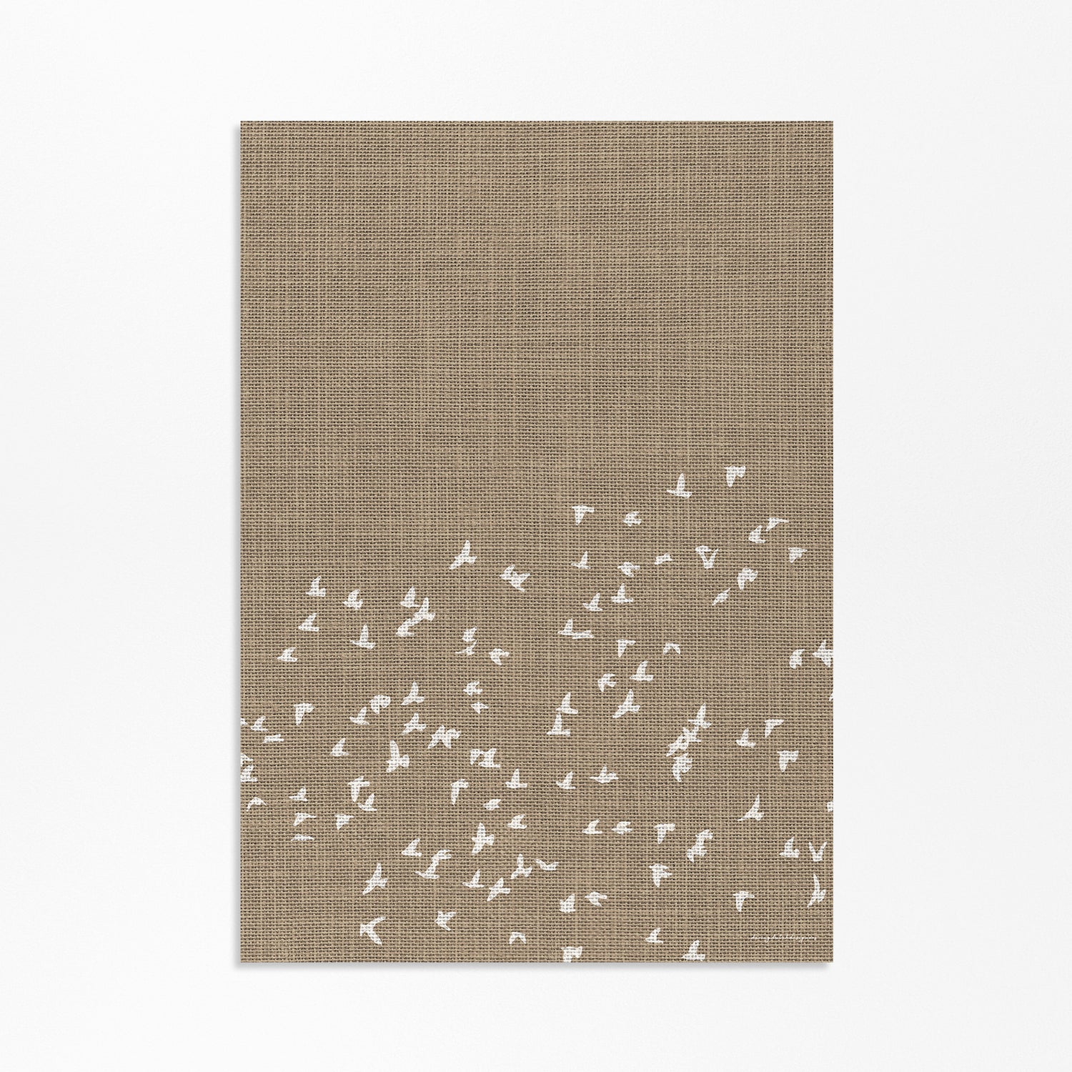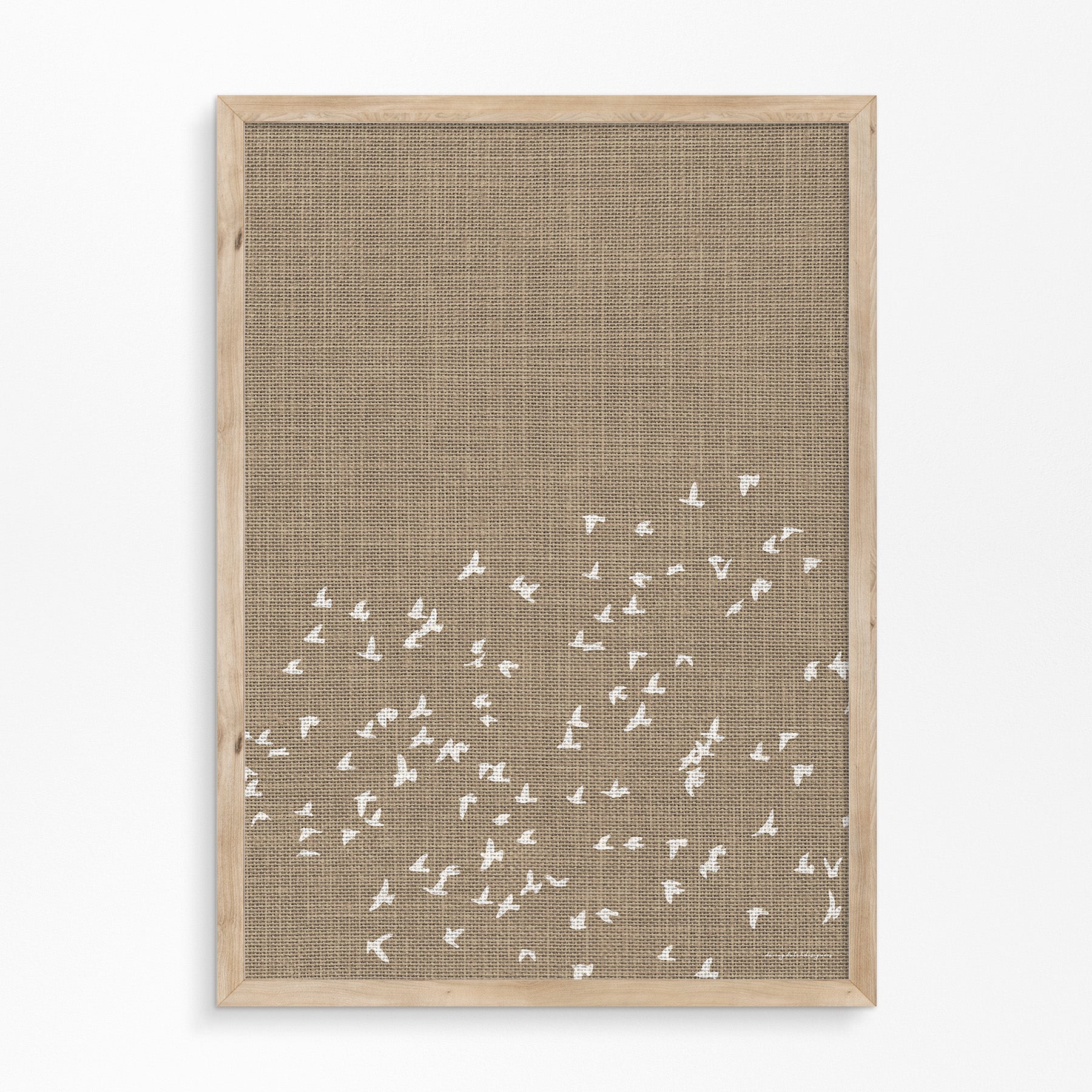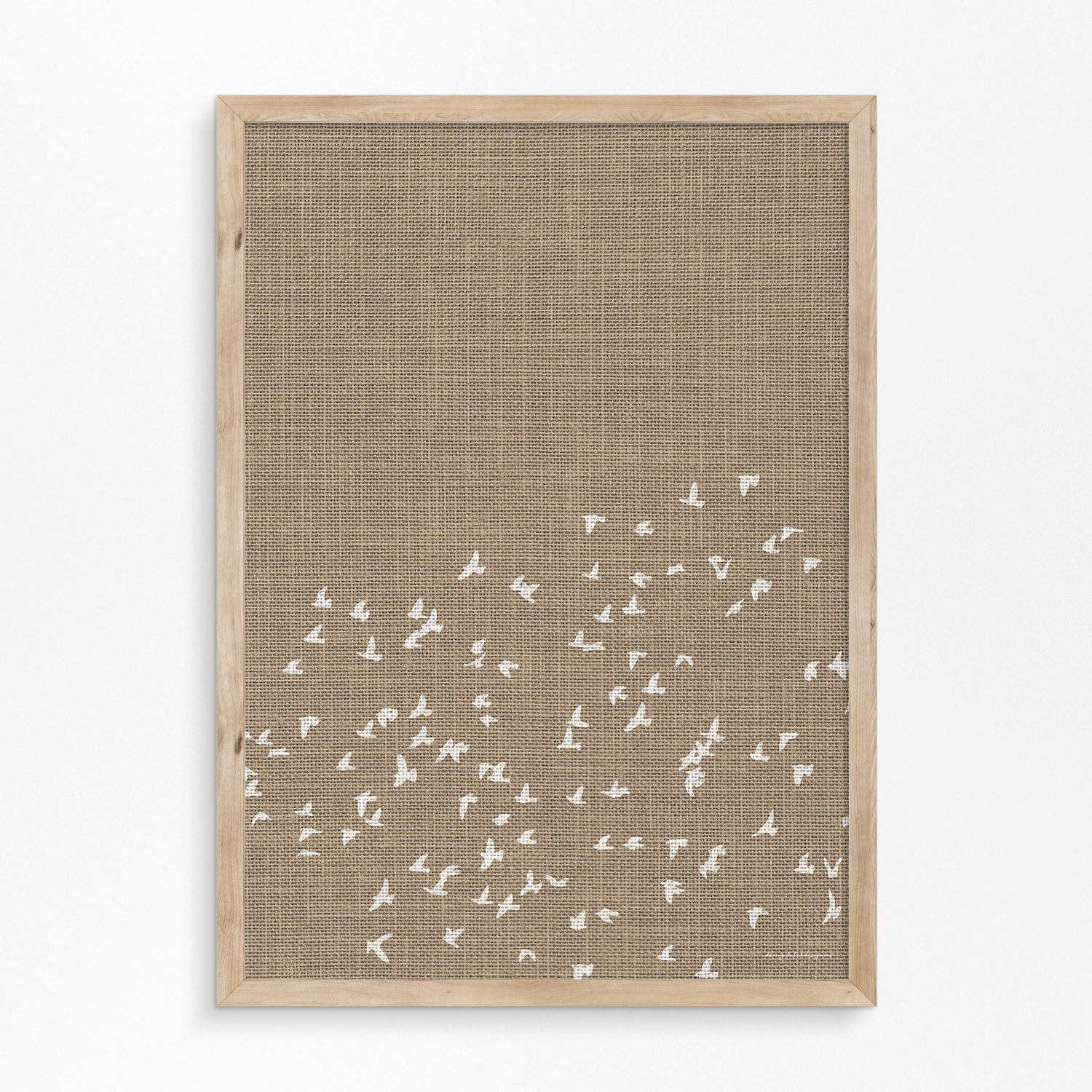 De linnen look achtergrond geeft de poster een warme natuurlijke textuur, alsof het op stof gedrukt is. De vogels lijken bijna te bewegen, een symbool van vrijheid, rust en verbinding met de natuur.
