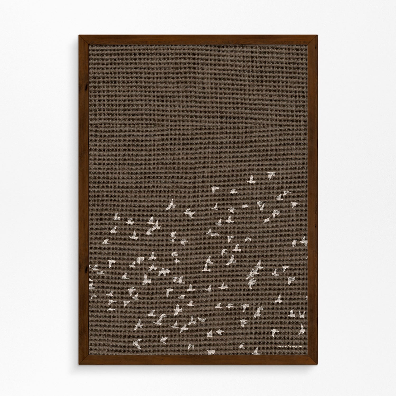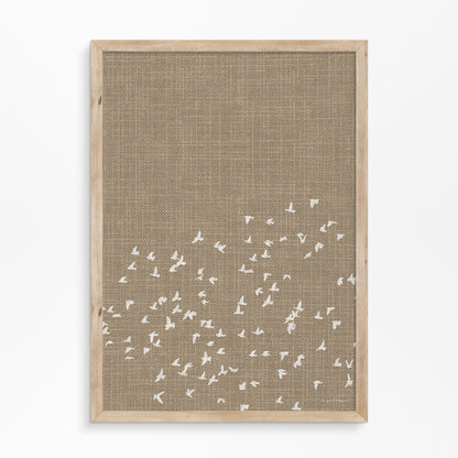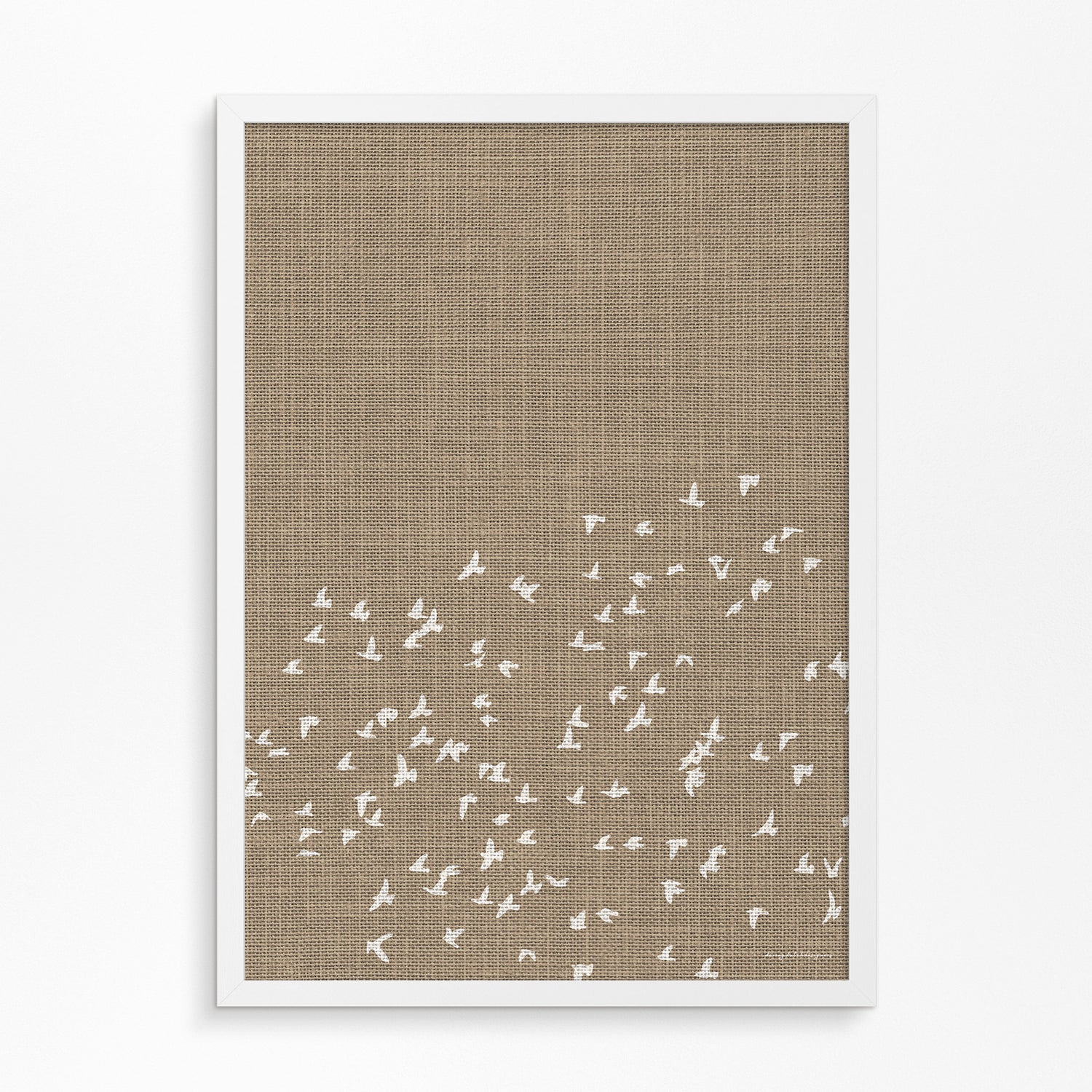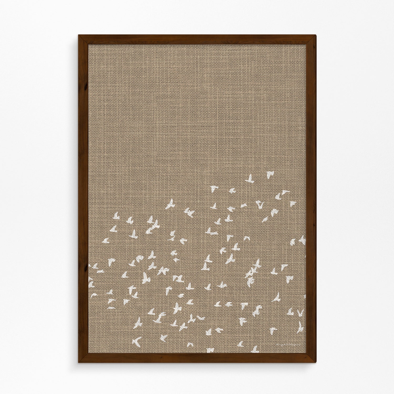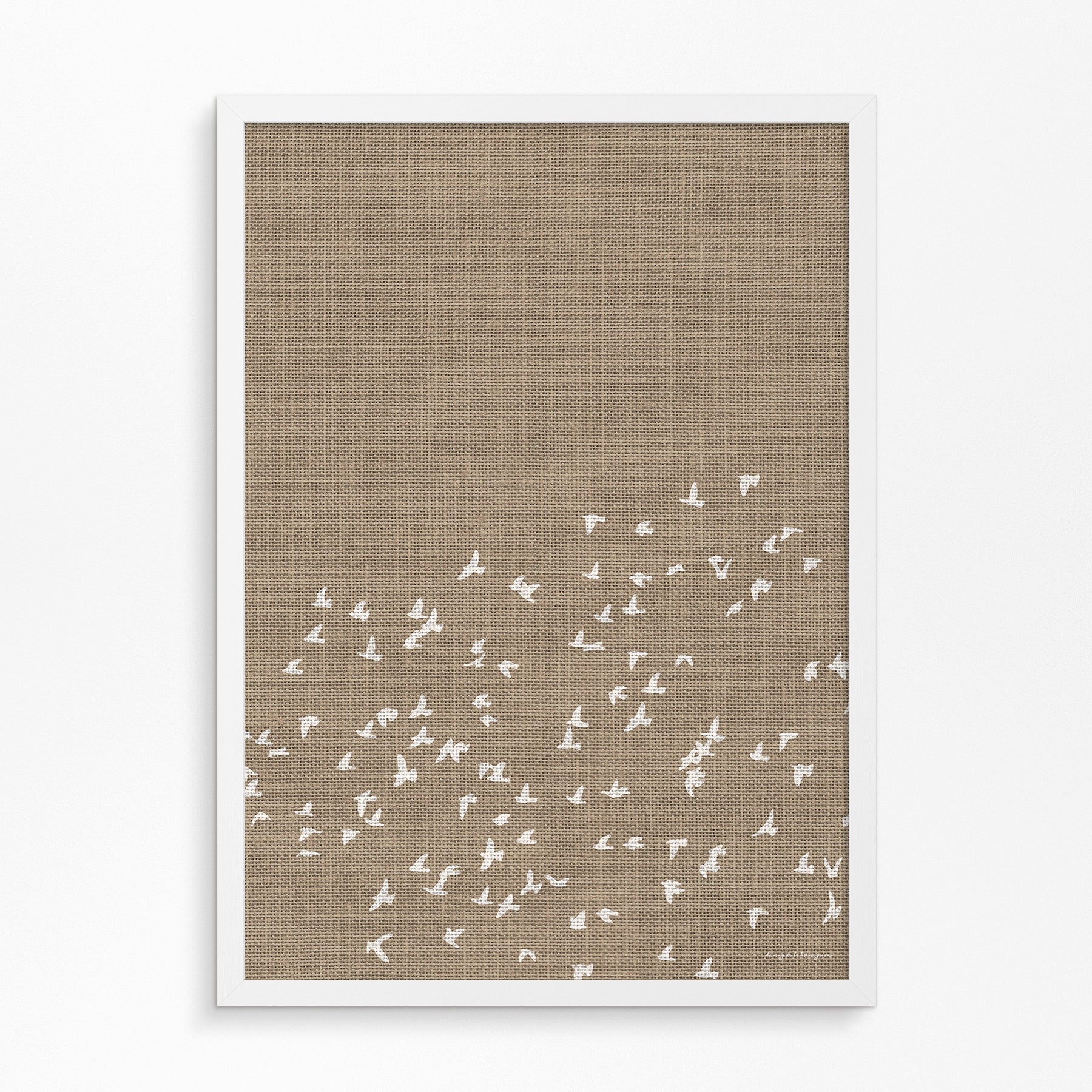 De linnen look achtergrond geeft de poster een warme natuurlijke textuur, alsof het op stof gedrukt is. De vogels lijken bijna te bewegen, een symbool van vrijheid, rust en verbinding met de natuur.