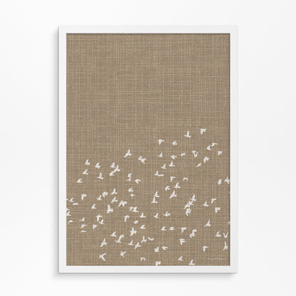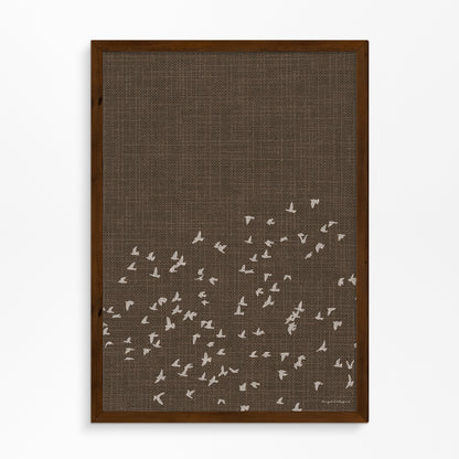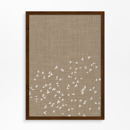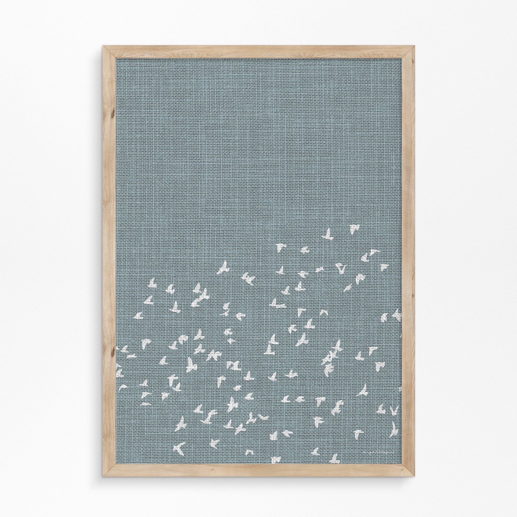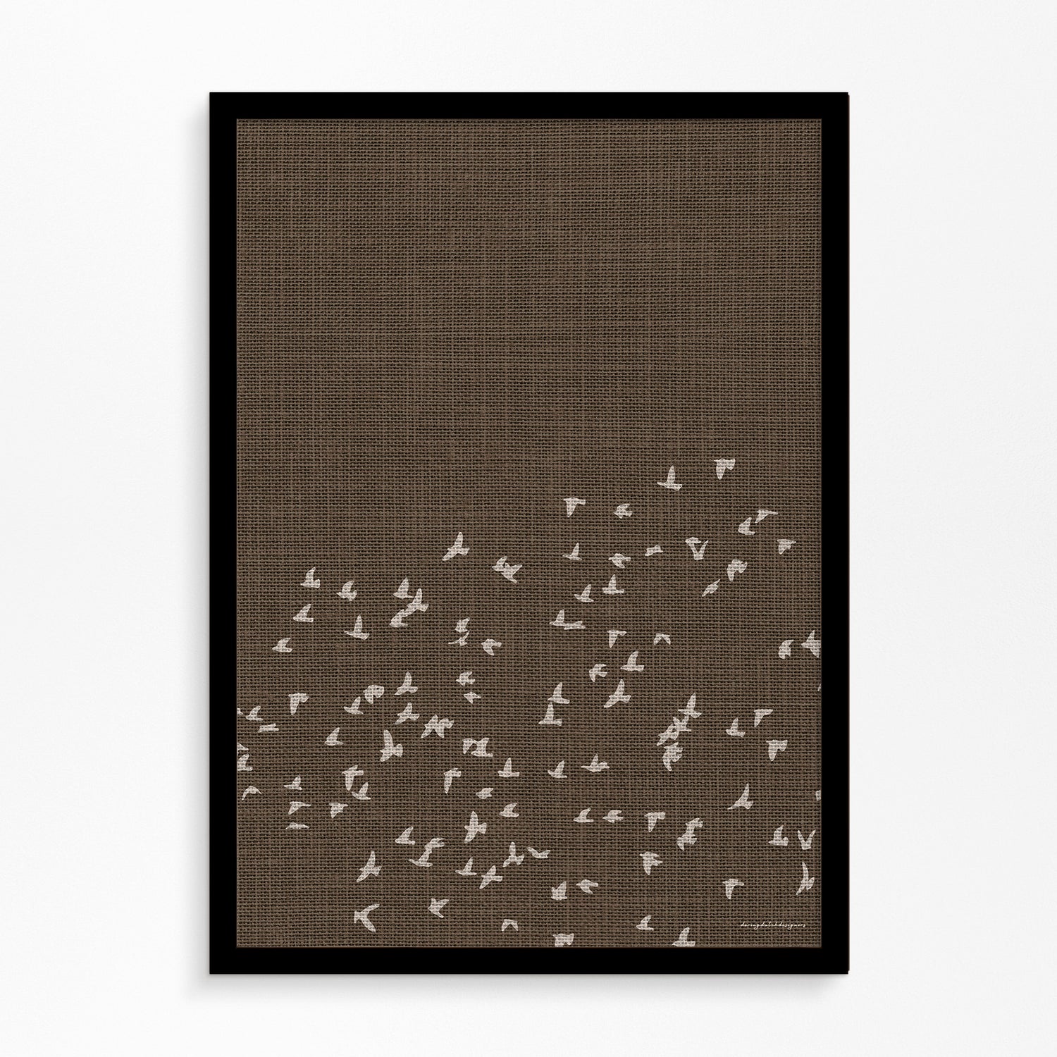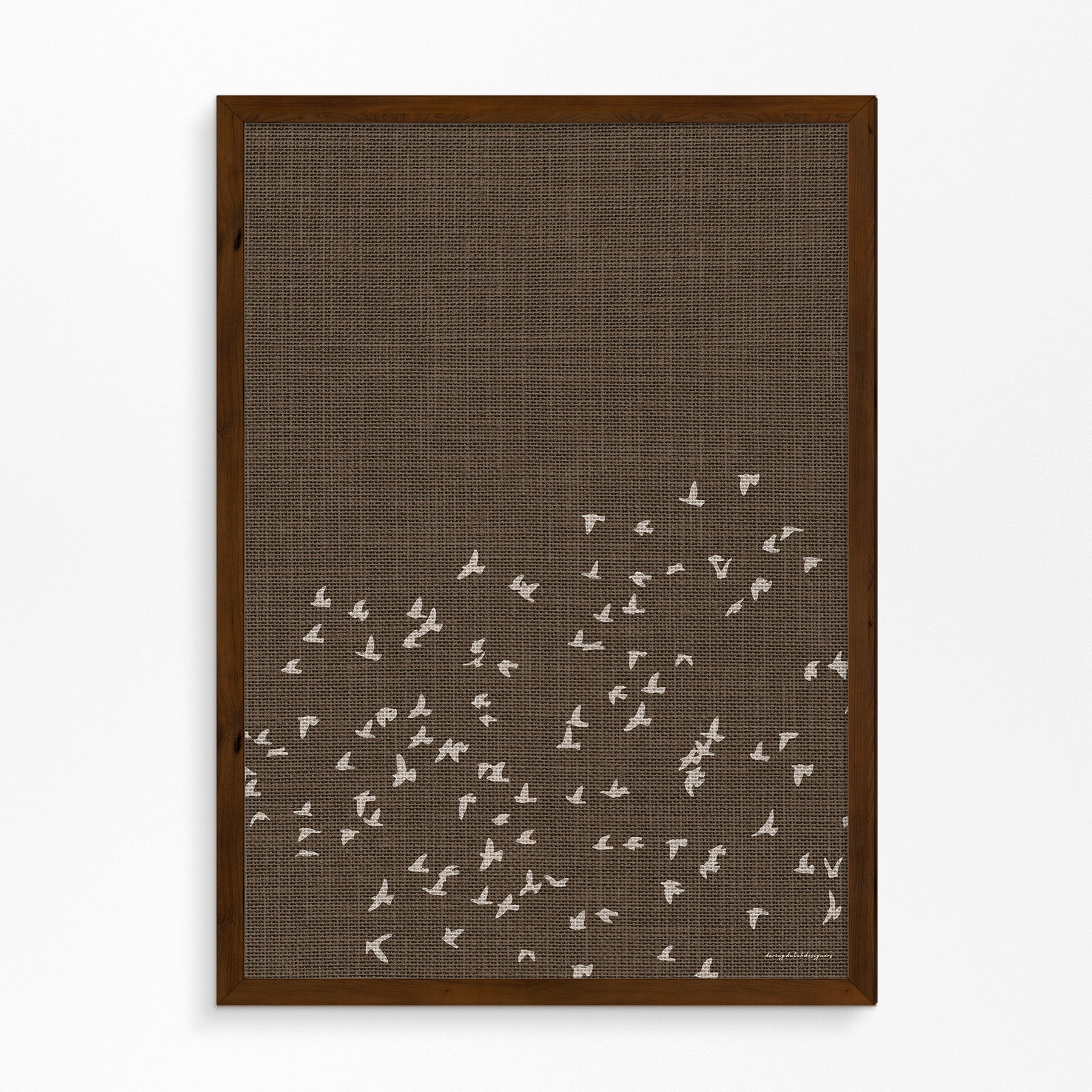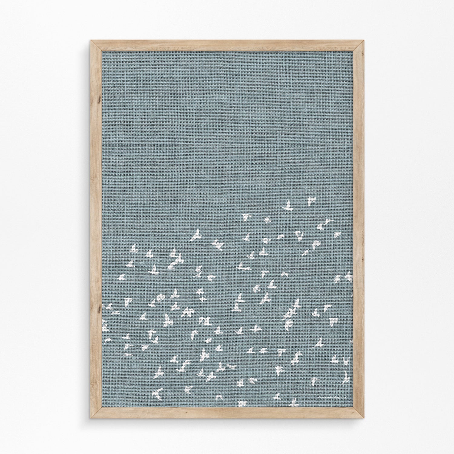De linnen look achtergrond geeft de poster een warme natuurlijke textuur, alsof het op stof gedrukt is. De vogels lijken bijna te bewegen, een symbool van vrijheid, rust en verbinding met de natuur.