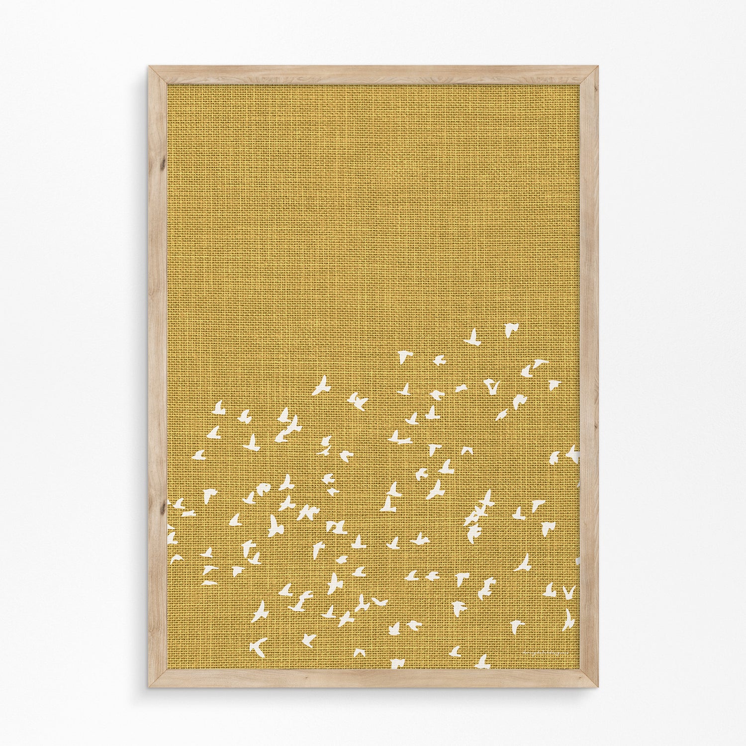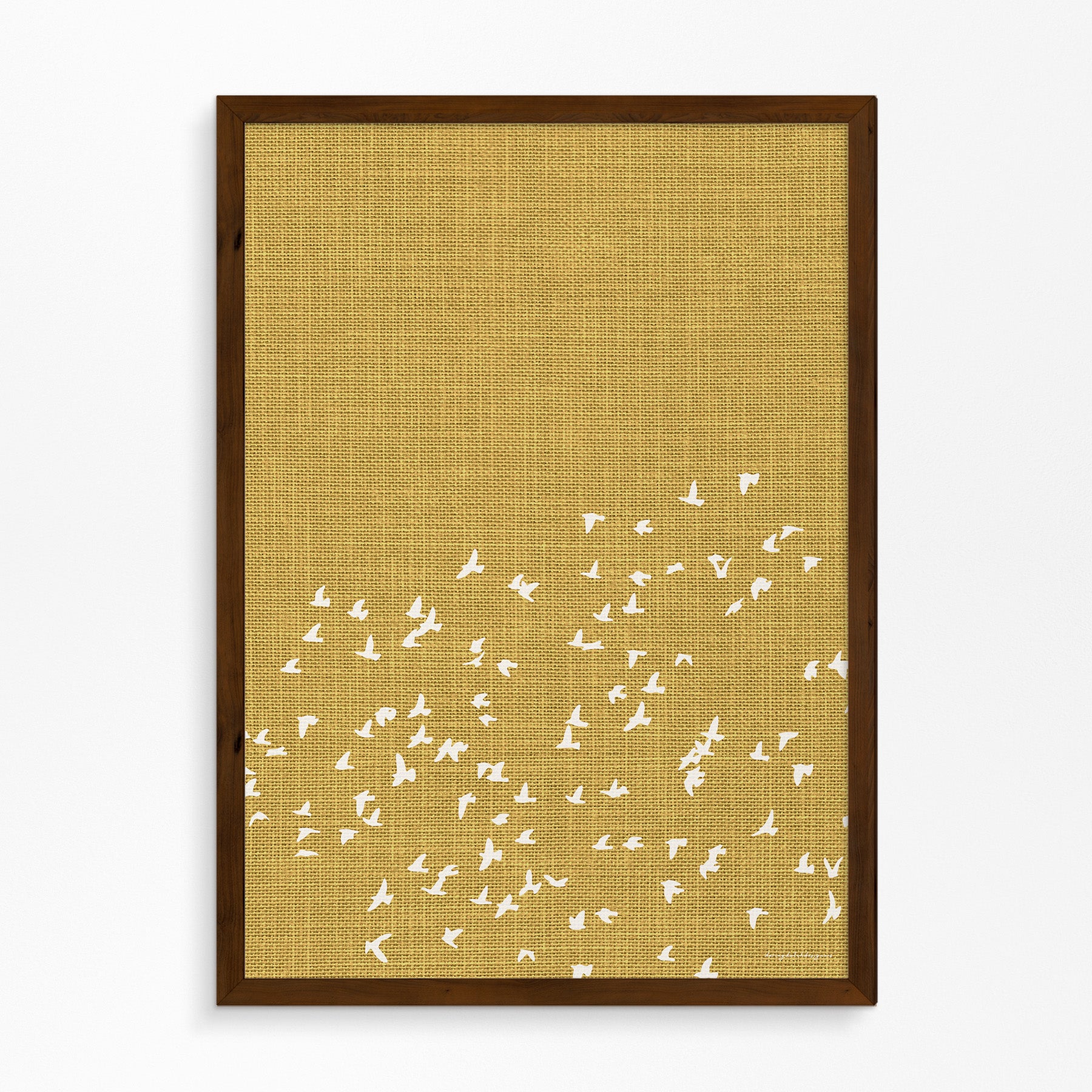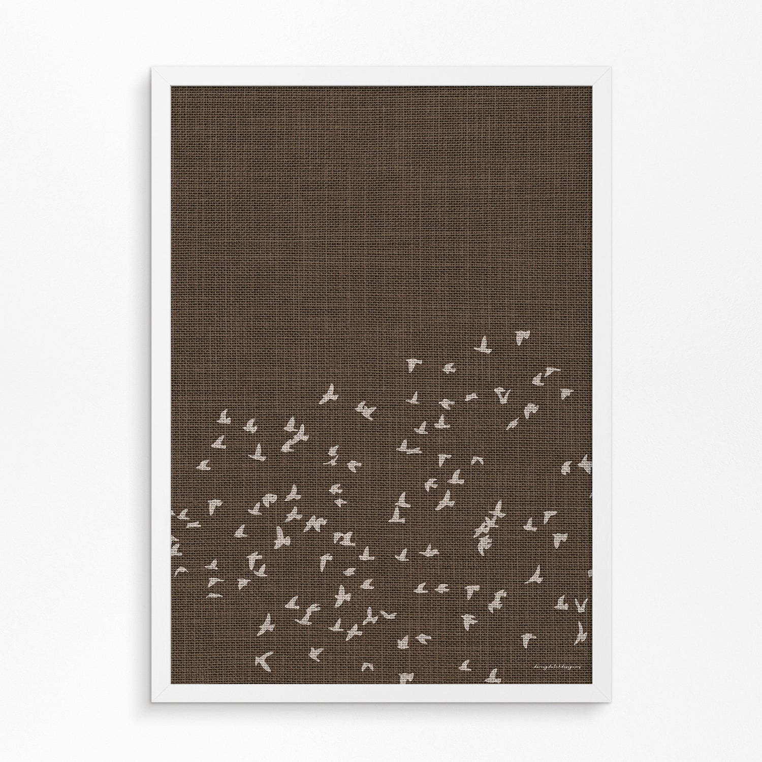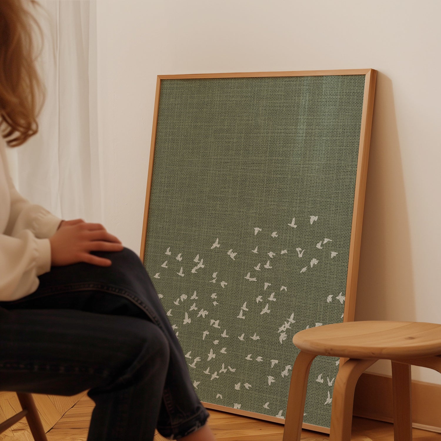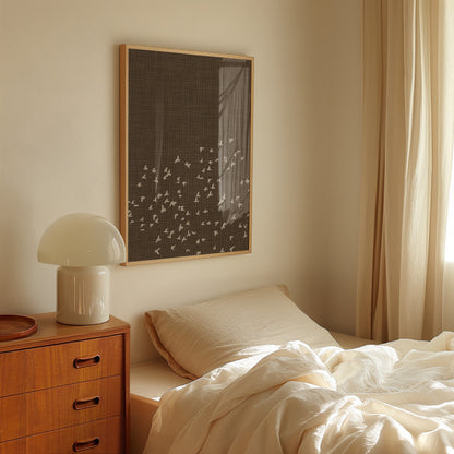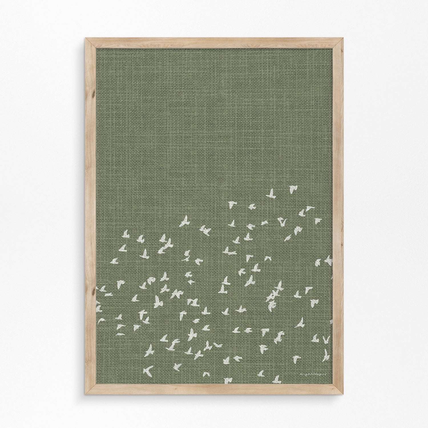 De linnen look achtergrond geeft de poster een warme natuurlijke textuur, alsof het op stof gedrukt is. De vogels lijken bijna te bewegen, een symbool van vrijheid, rust en verbinding met de natuur.