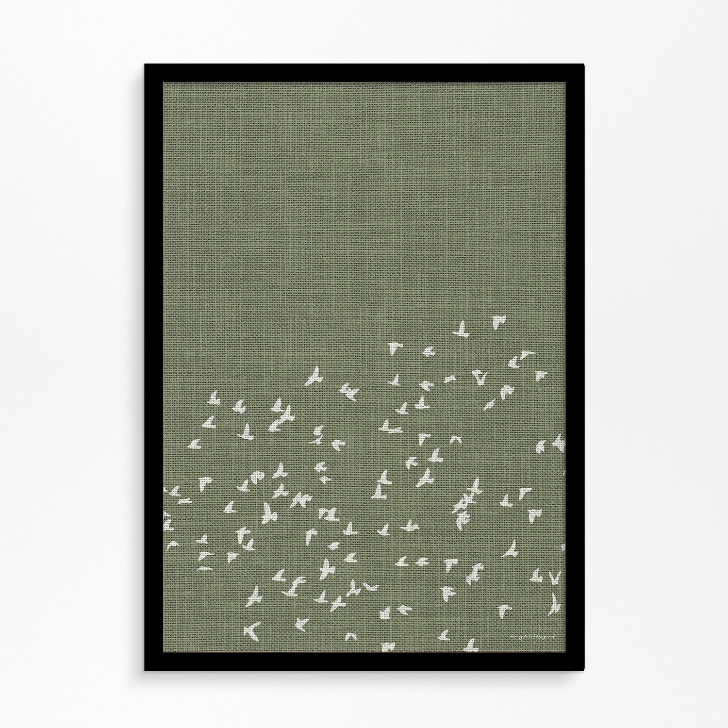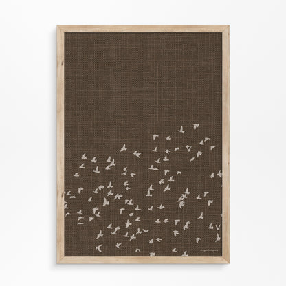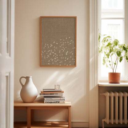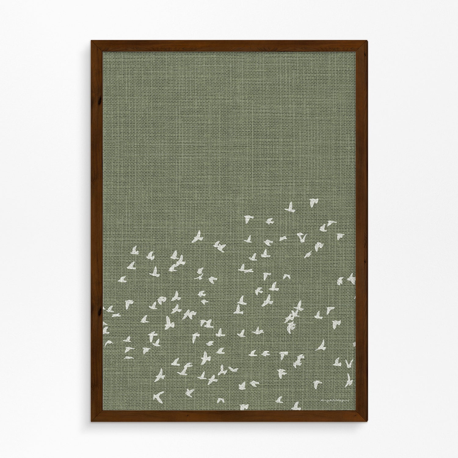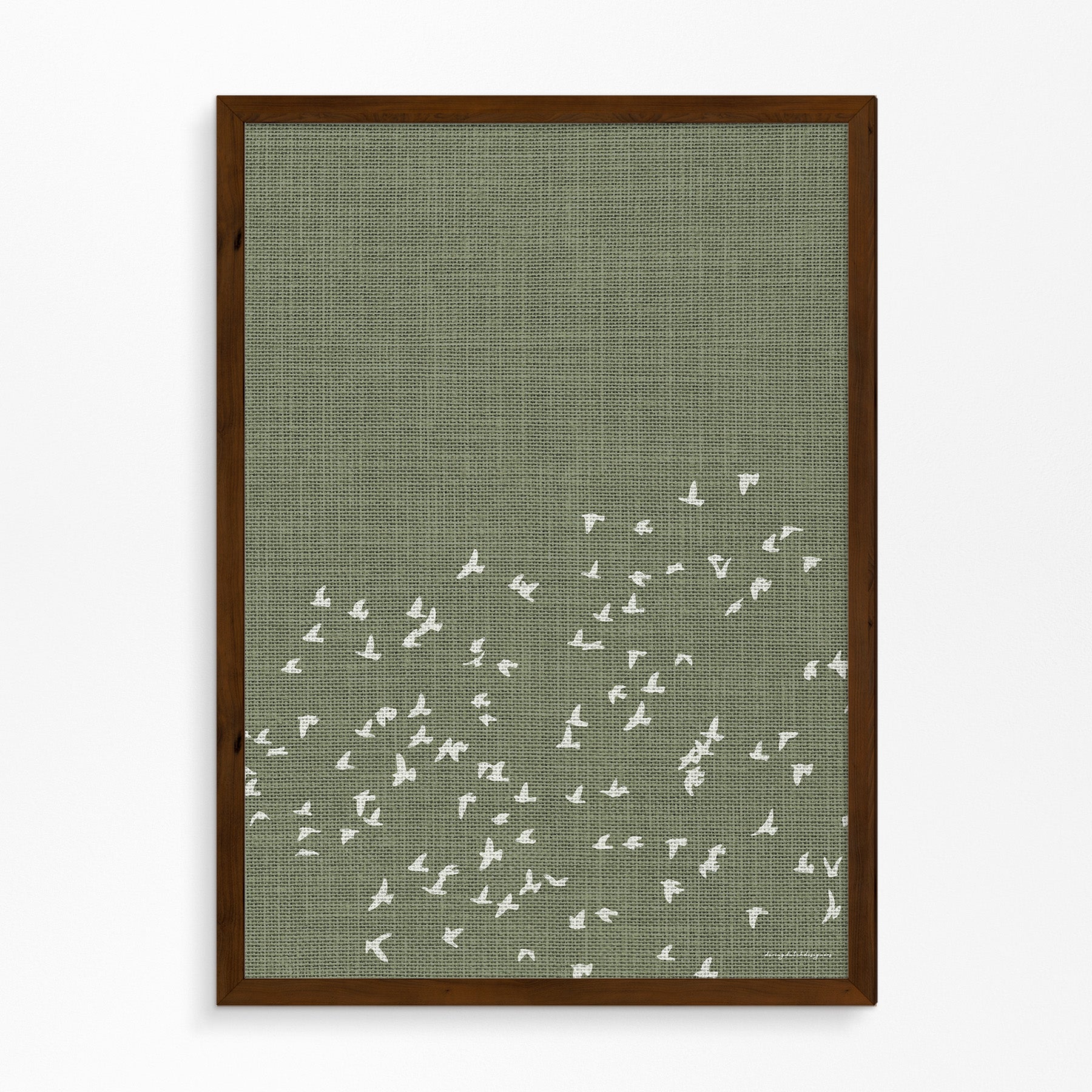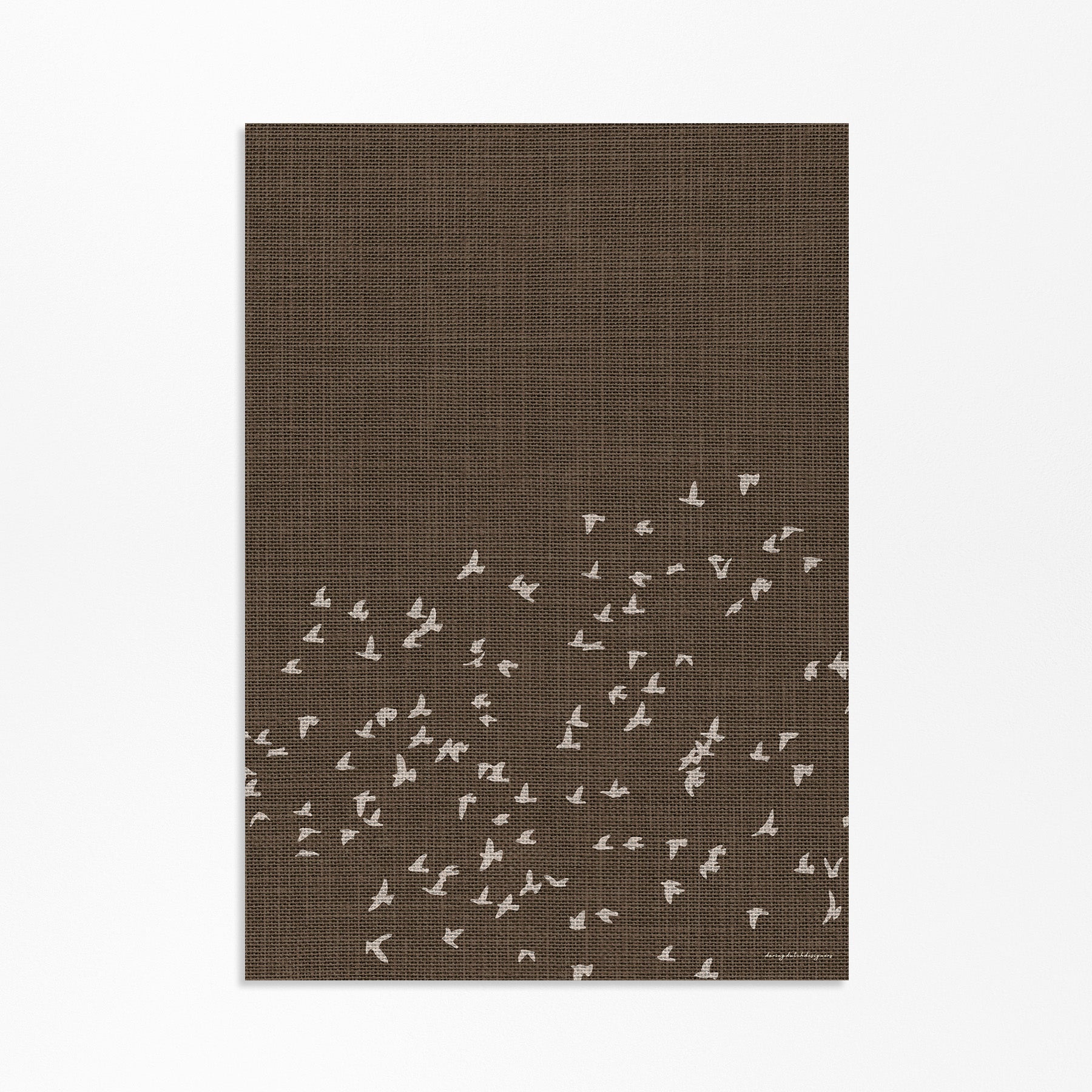 De linnen look achtergrond geeft de poster een warme natuurlijke textuur, alsof het op stof gedrukt is. De vogels lijken bijna te bewegen, een symbool van vrijheid, rust en verbinding met de natuur.