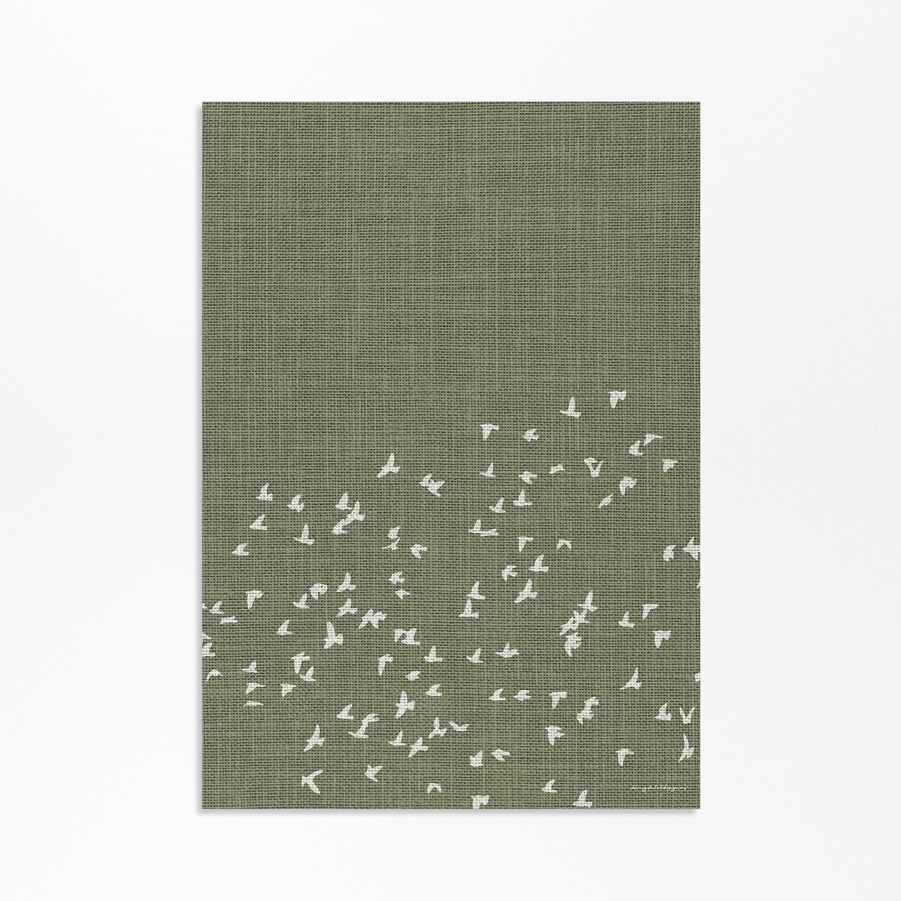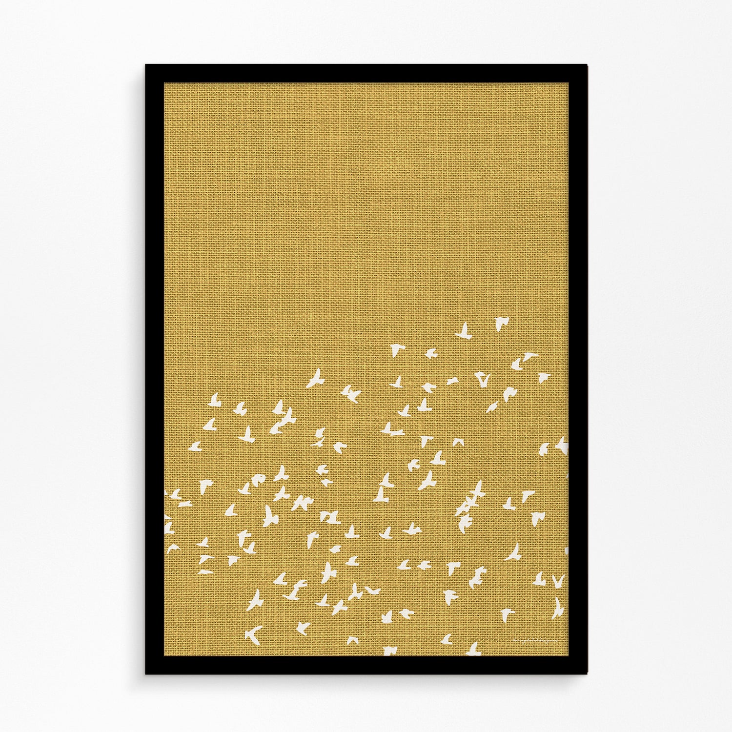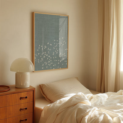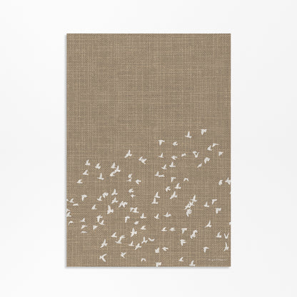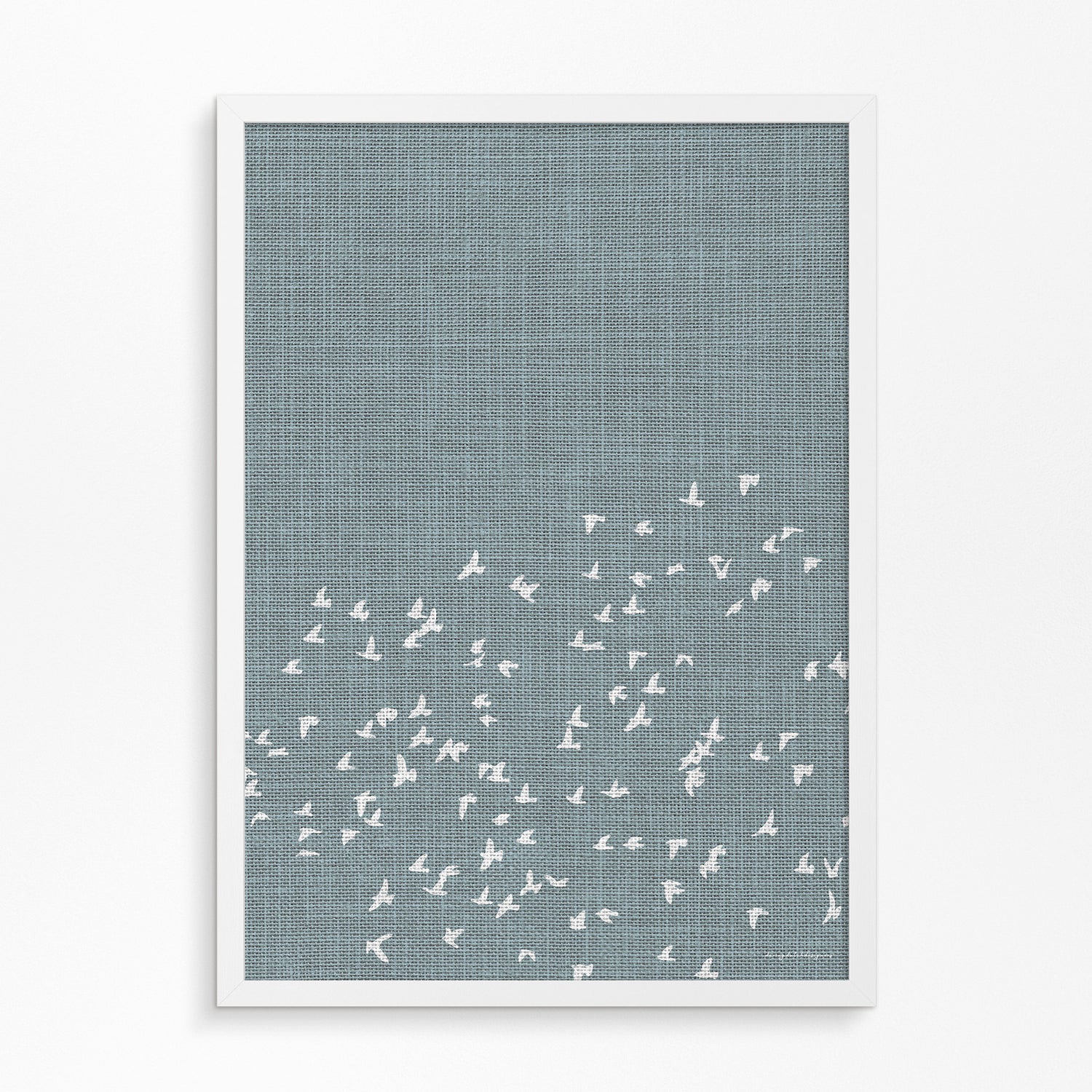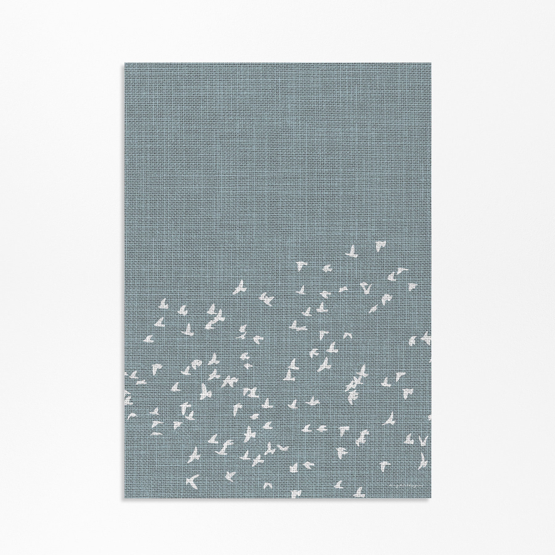 De linnen look achtergrond geeft de poster een warme natuurlijke textuur, alsof het op stof gedrukt is. De vogels lijken bijna te bewegen, een symbool van vrijheid, rust en verbinding met de natuur.
