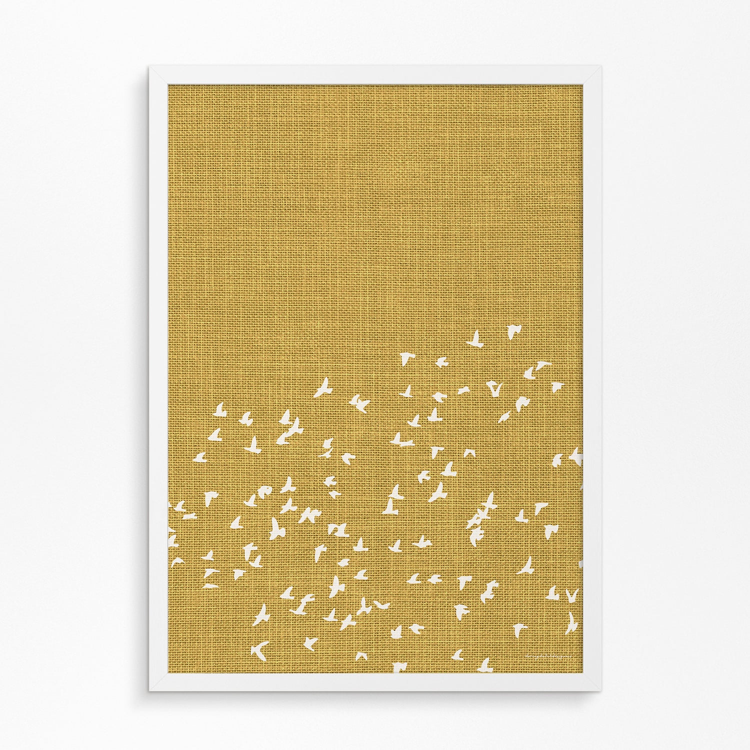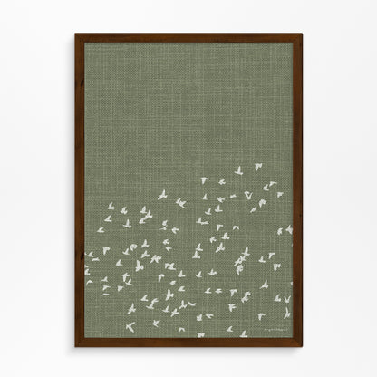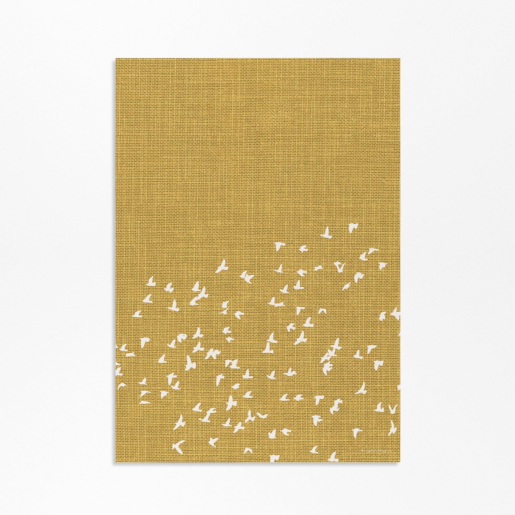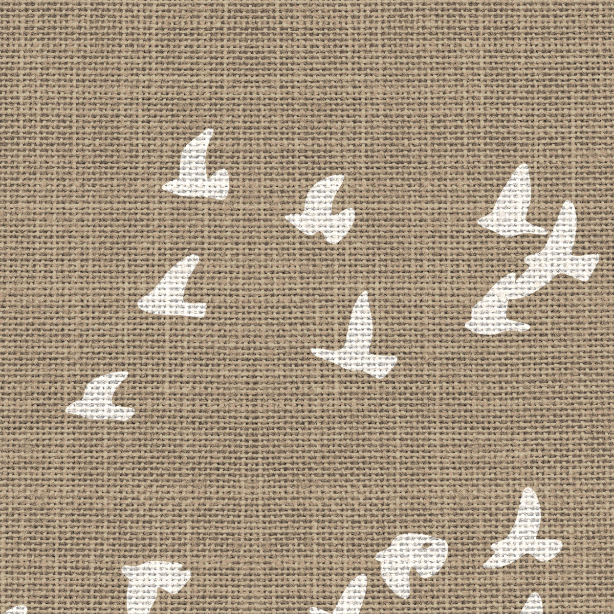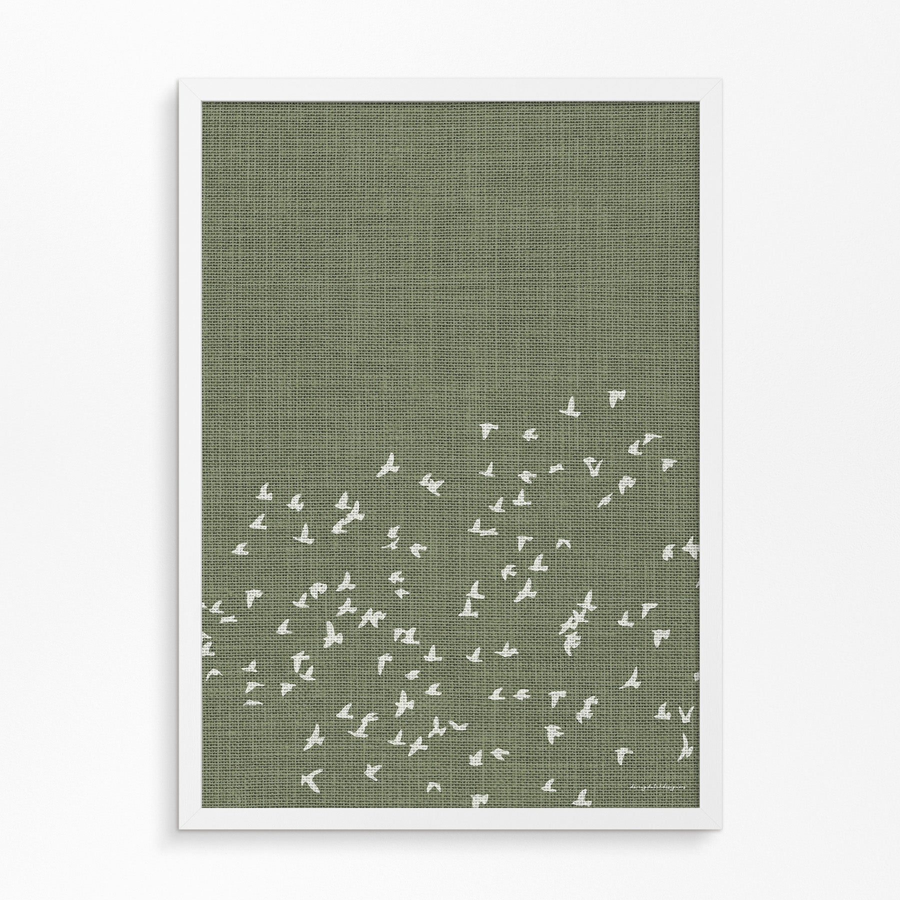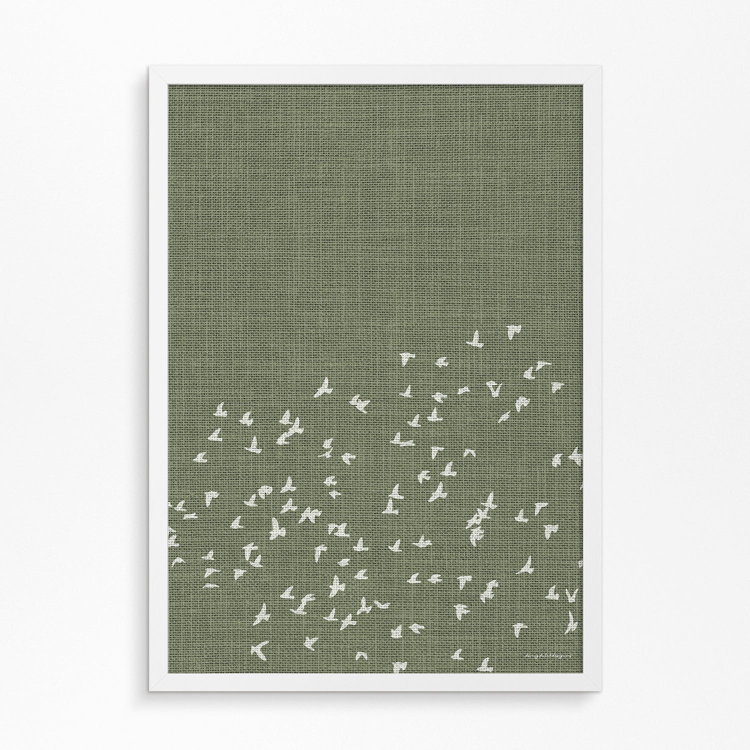 De linnen look achtergrond geeft de poster een warme natuurlijke textuur, alsof het op stof gedrukt is. De vogels lijken bijna te bewegen, een symbool van vrijheid, rust en verbinding met de natuur.