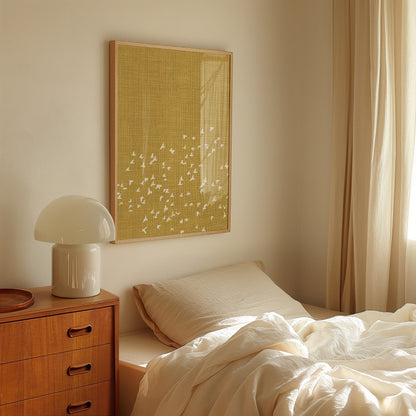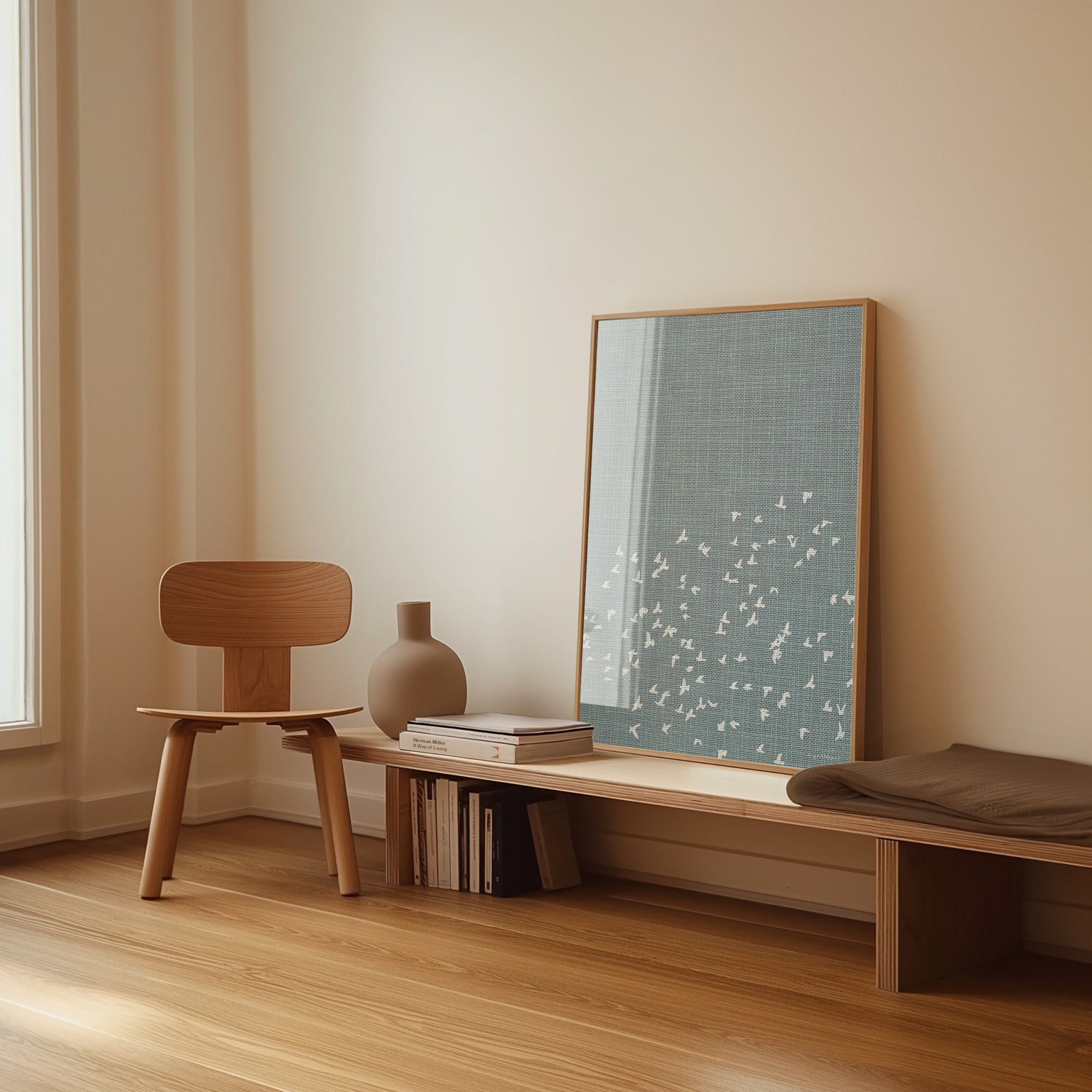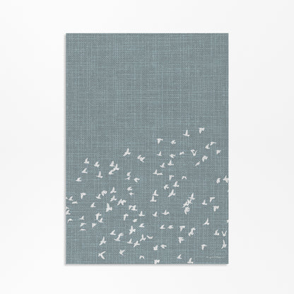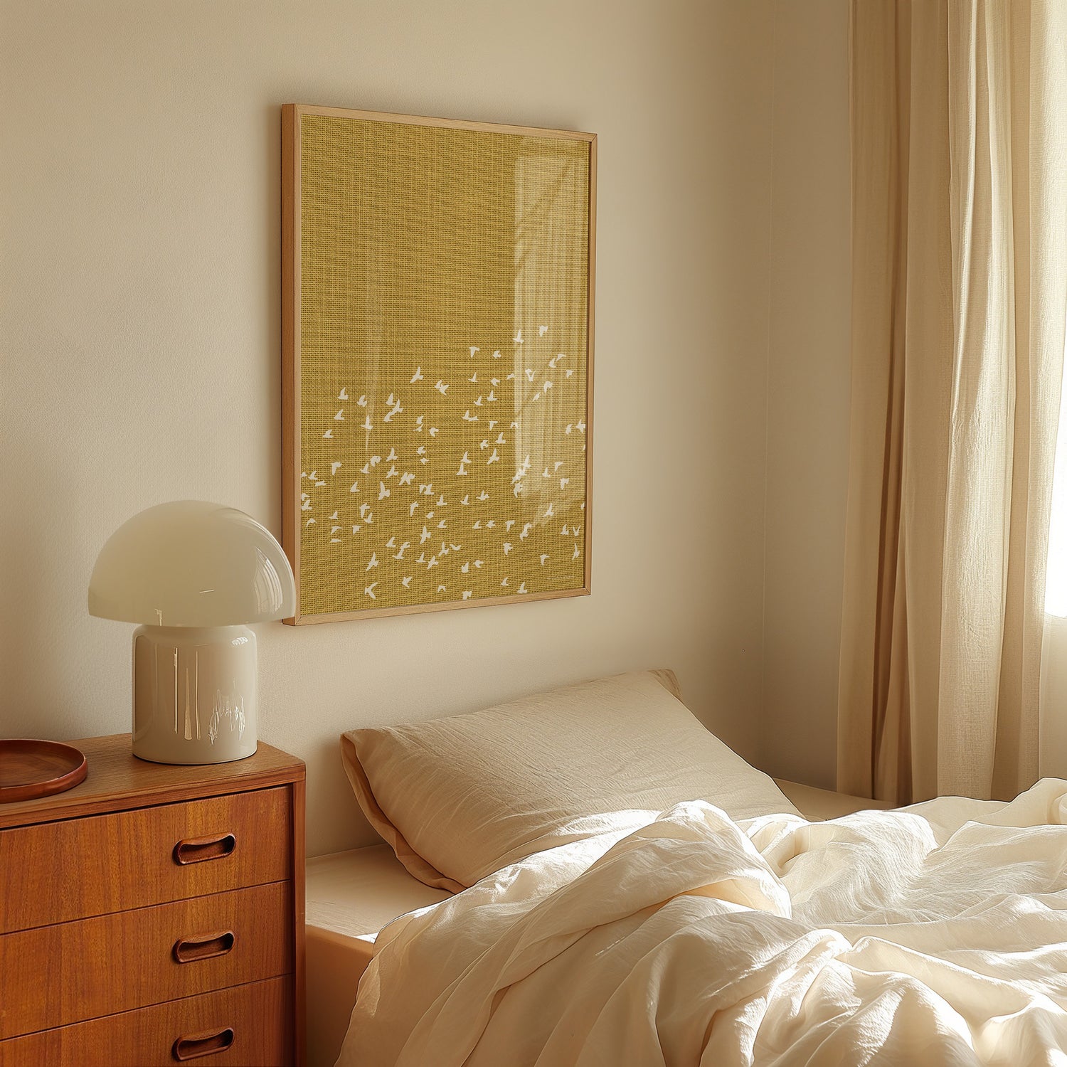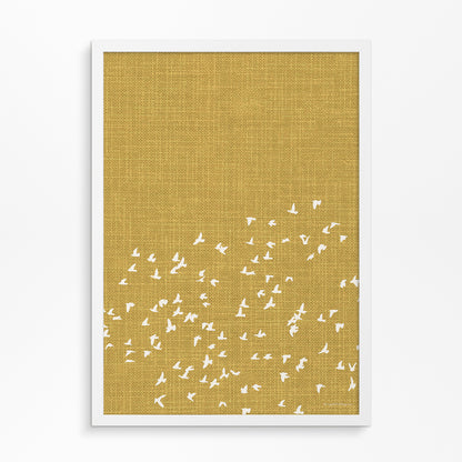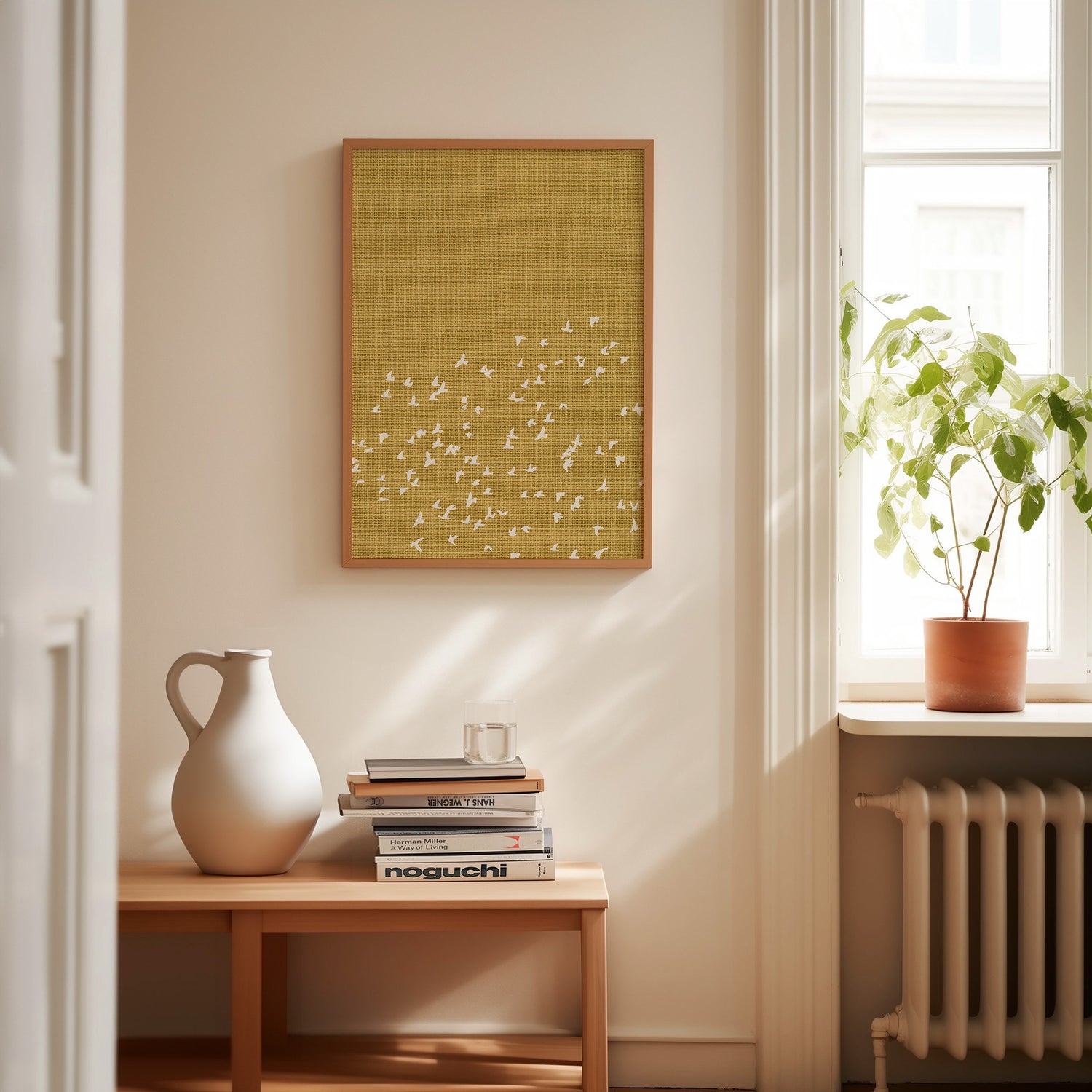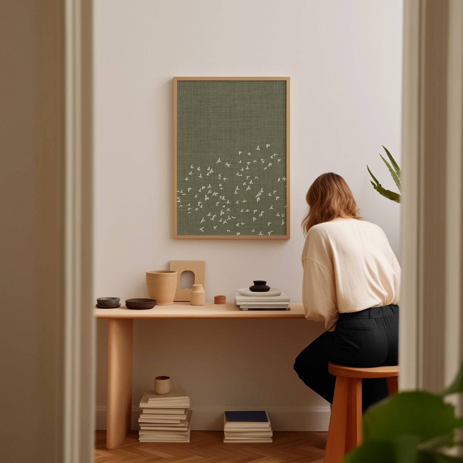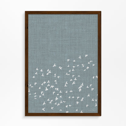 De linnen look achtergrond geeft de poster een warme natuurlijke textuur, alsof het op stof gedrukt is. De vogels lijken bijna te bewegen, een symbool van vrijheid, rust en verbinding met de natuur.